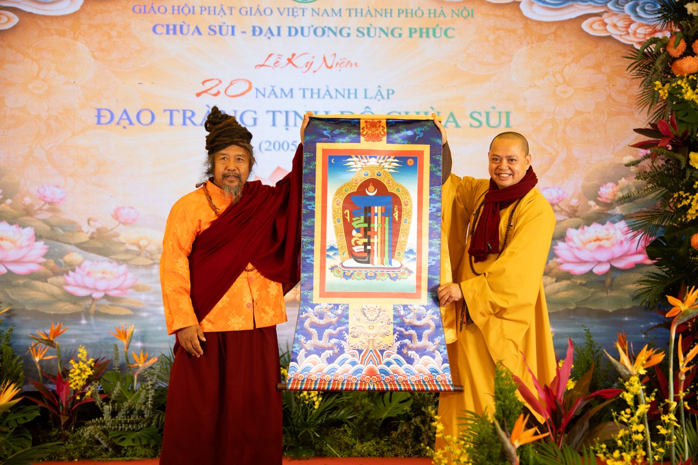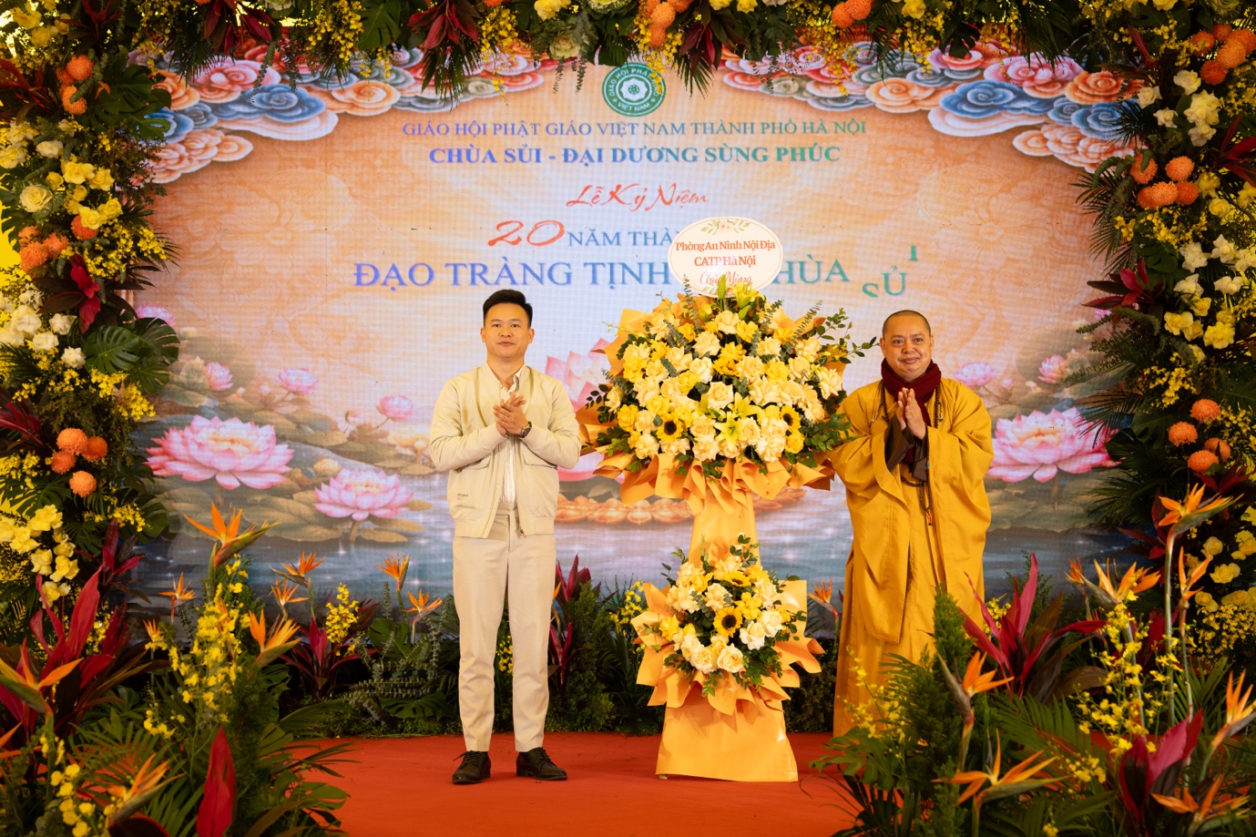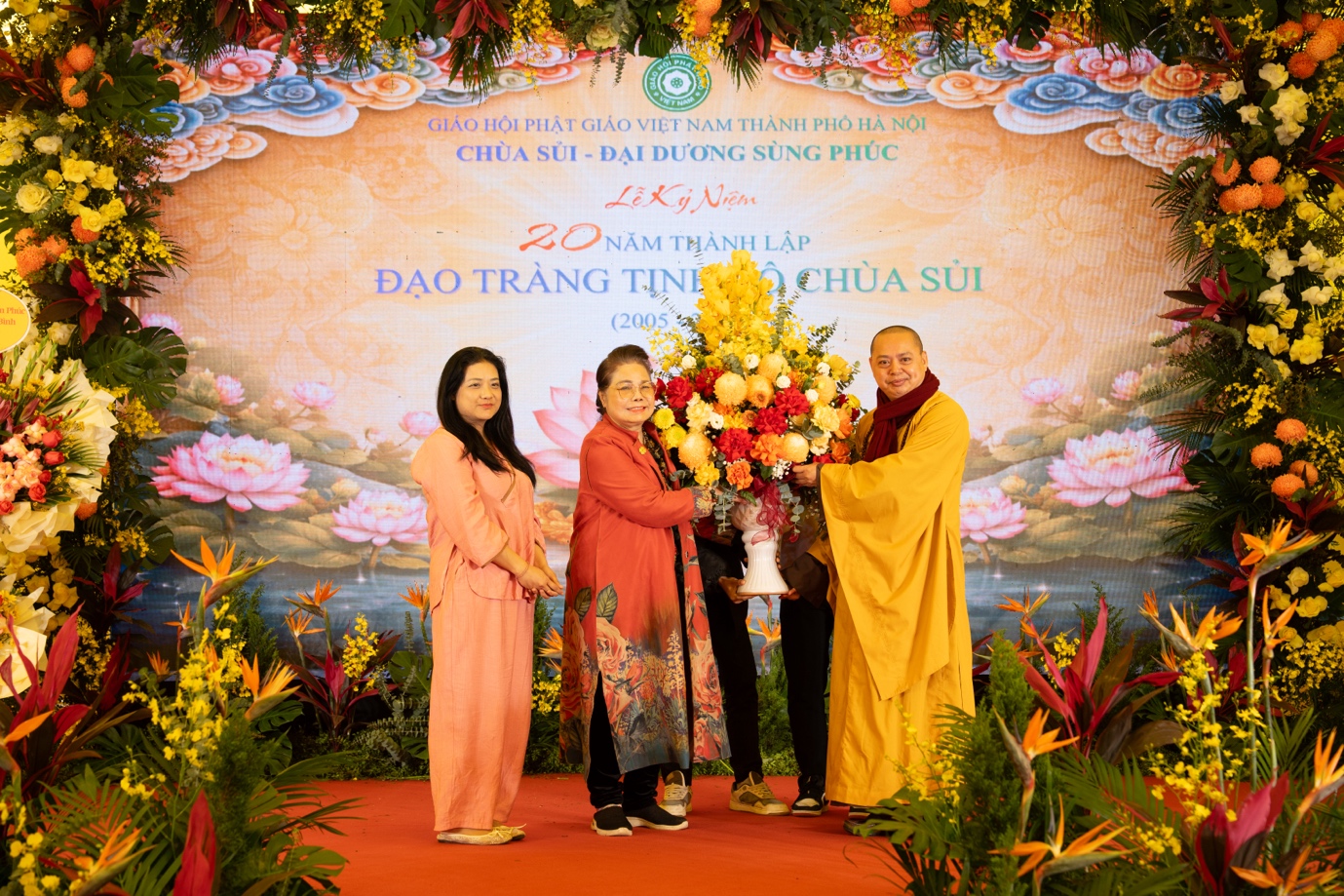 Nhân dịp kỷ niệm 20 năm thành lập, BTS GHPGVN TP.Hà Nội, Sở Dân tộc và Tôn giáo TP. Hà Nội, lãnh đạo chính quyền địa phương trân trọng trao tặng những lẵng hoa tươi thắm chúc mừng Đạo tràng Tịnh độ chùa Sủi. Những lẵng hoa mang theo tình cảm, sự trân quý và lời chúc đạo tràng tiếp tục vững bước trên con đường hoằng pháp lợi sinh, lan tỏa những giá trị tốt đẹp của Phật giáo trong đời sống xã hội.