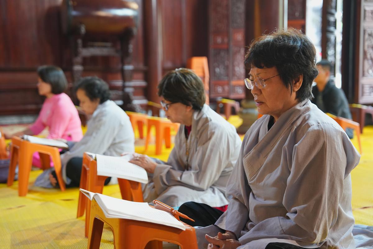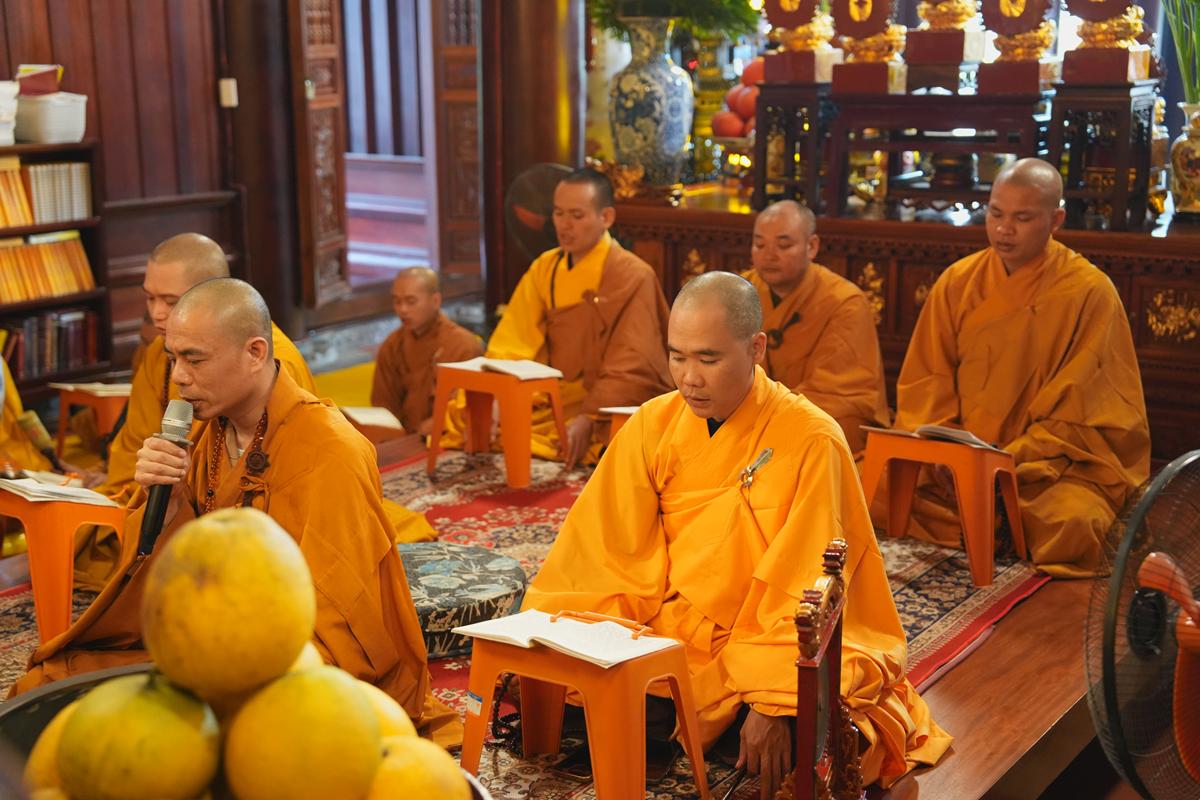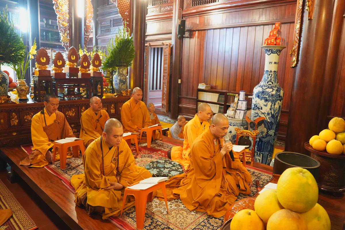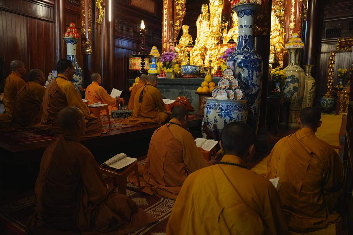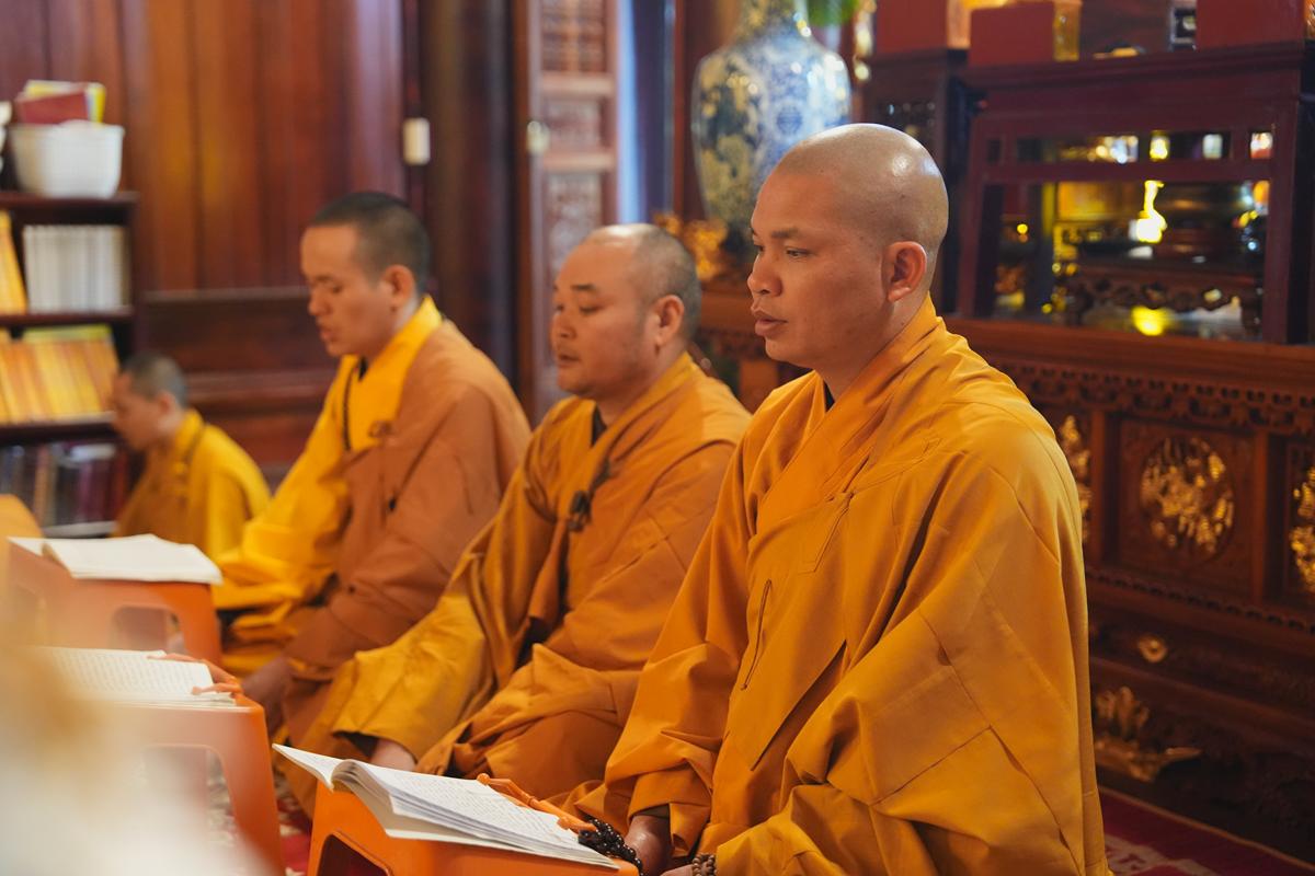 Buổi chiều, chư Tăng đã trang nghiêm trì tụng Kinh Dược Sư tại Đại Hùng Bảo Điện, cầu nguyện quốc thái dân an, thế giới hòa bình, chúng sinh an lạc.