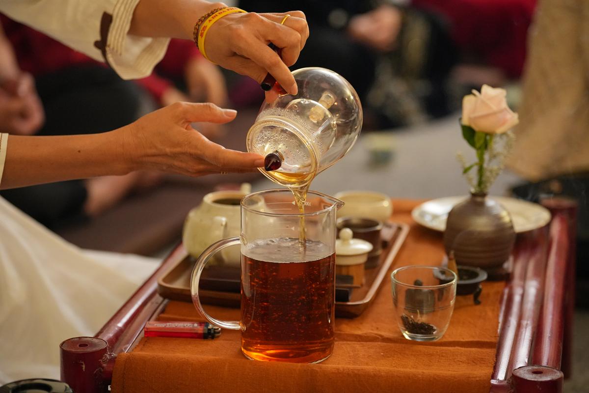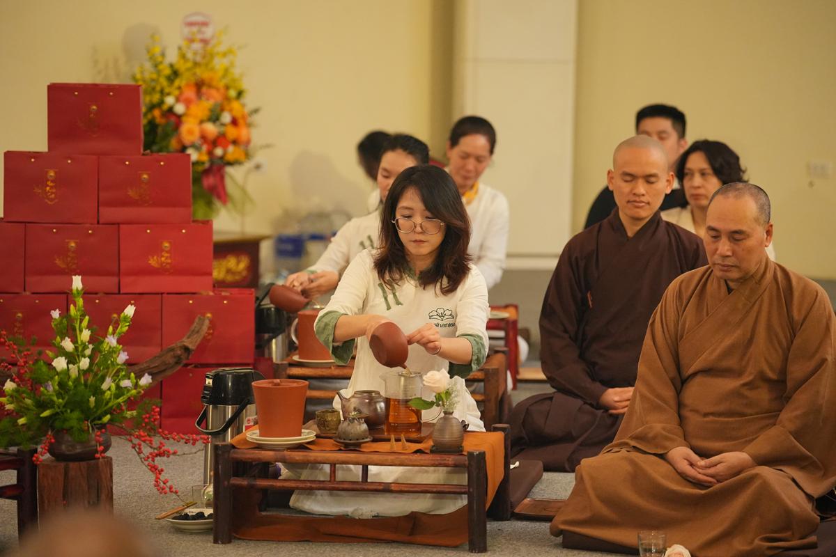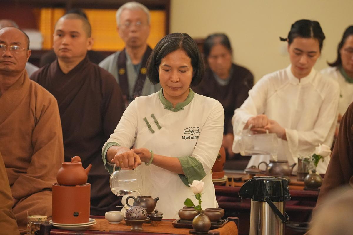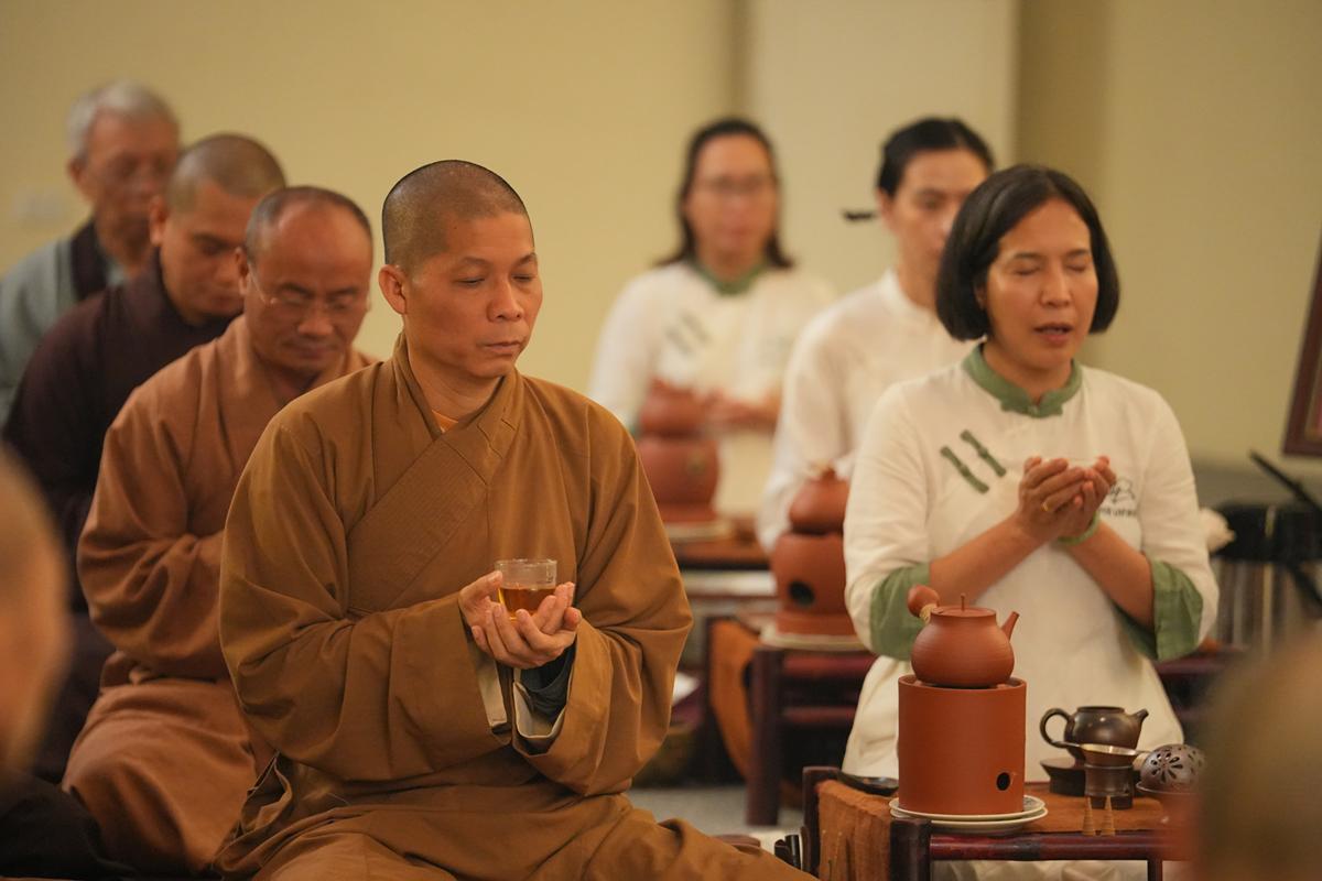 Trong tiếng chuông nhẹ vang, Ban Nghi lễ cung rước chư tôn đức quang lâm chứng minh, mở ra không gian thưởng thức nghệ thuật Trà Đạo – nơi chén trà không chỉ là thức uống, mà là phương tiện quán chiếu nội tâm, kết nối con người với chính mình và với nhau.