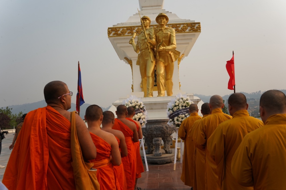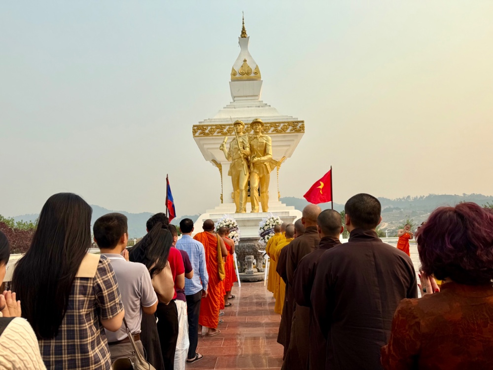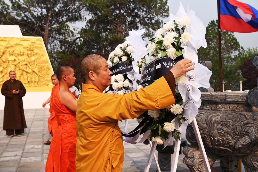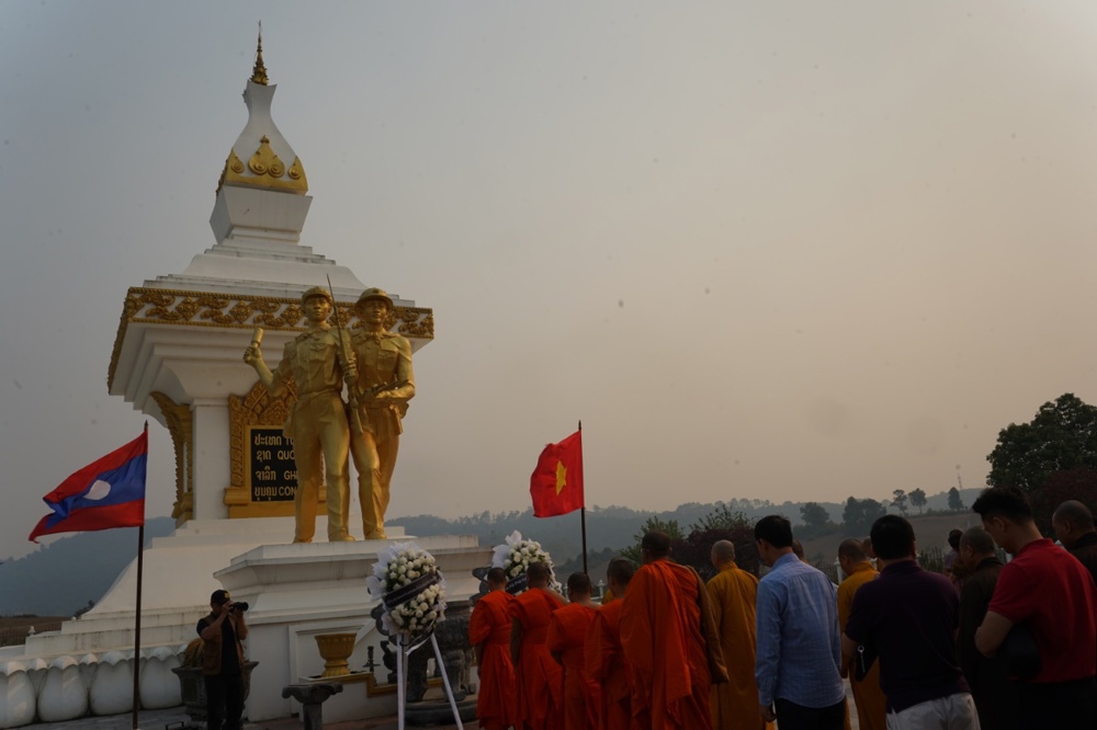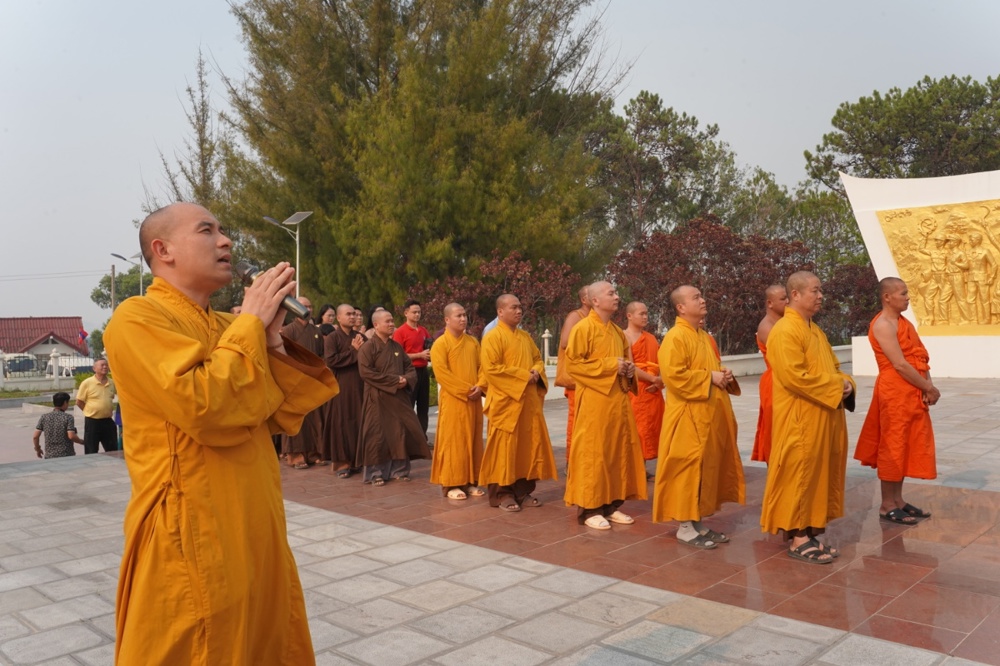 Chư Tôn đức cùng quý vị đại biểu đã dành phút mặc niệm, cầu nguyện cho hồn thiêng sông núi, anh linh các liệt sĩ gia hộ cho hai quốc gia hưng thịnh, tình đoàn kết Việt – Lào mãi bền vững.