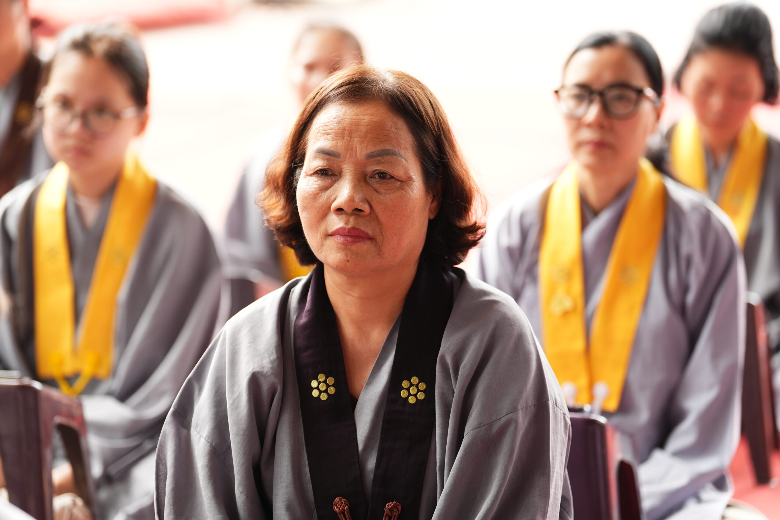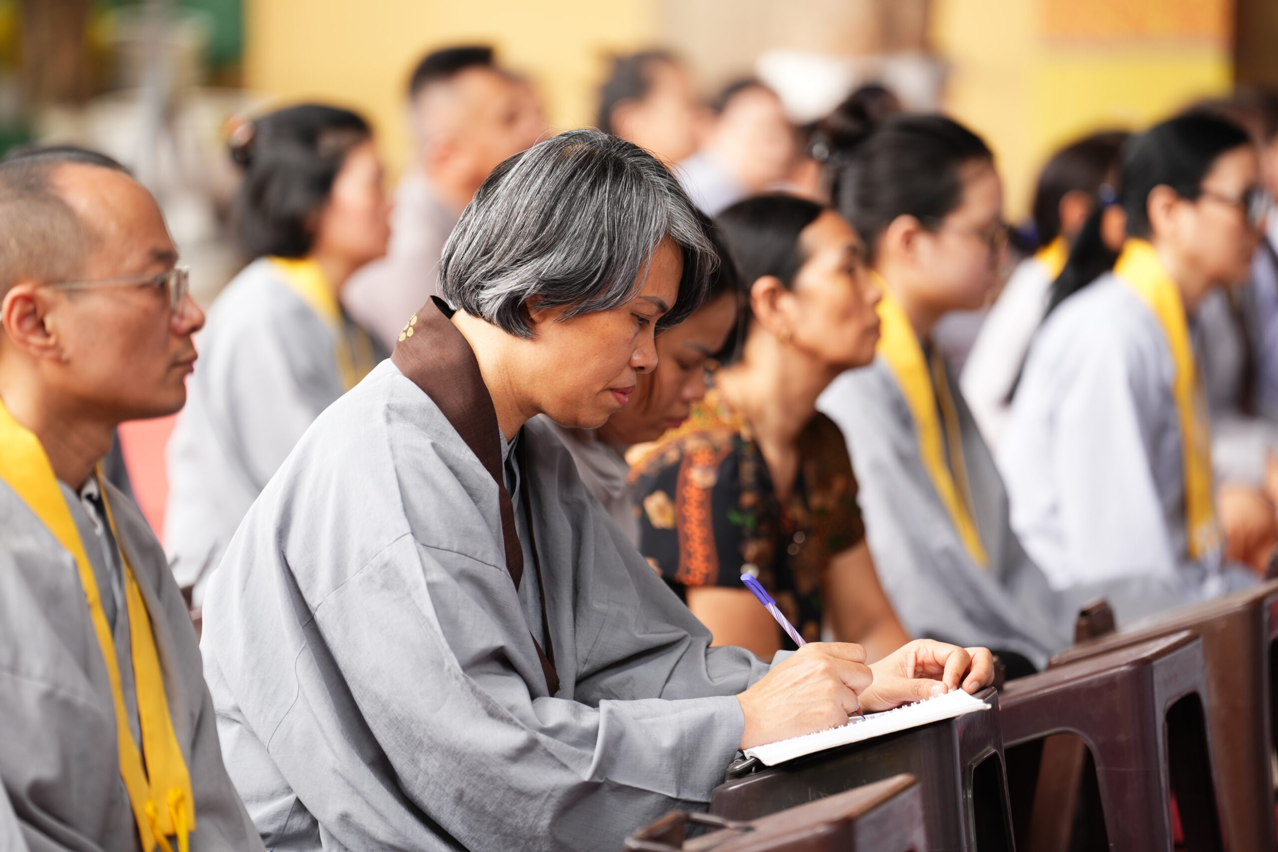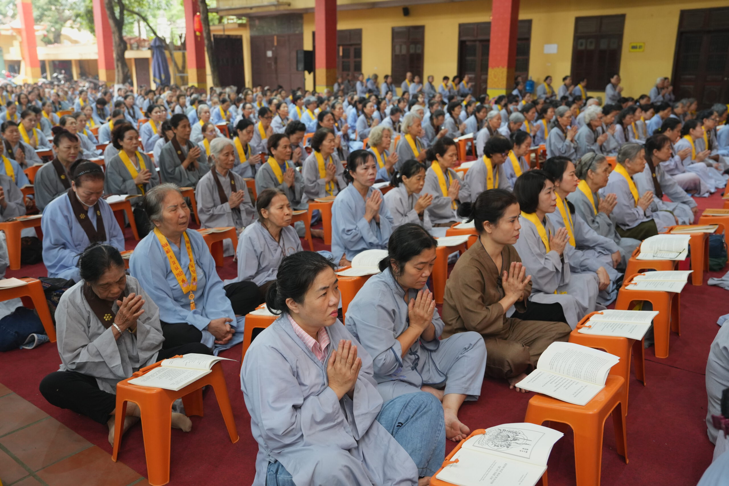 Đầu giờ chiều, Đại đức Thích Thanh Tâm – Ủy viên Thường trực, Phó Văn phòng Ban Hoằng pháp Trung ương GHPGVN đã có bài thuyết giảng với chủ đề “Sống Theo Hạnh Phật”. Đại đức nhấn mạnh, để đạt quả vị giác ngộ như Đức Như Lai, cần kiên nhẫn và quán chiếu nội tâm. Việc thọ trì Bát Quan Trai giới không chỉ là giữ giới, mà còn là hành trình tự quan sát, học hỏi giáo pháp và suy nghiệm trong từng hành động. Khi lần chuỗi hạt niệm danh hiệu Bồ Tát, mỗi hạt là một nhịp giúp hành giả nhất tâm bất loạn, duy trì chính niệm và cảm ứng đạo giao. Trên cổng chùa Bằng, ba chữ “Văn – Tư – Tu” nhắc nhở rằng sự kết hợp hài hòa giữa học hỏi, quán chiếu và thực hành là nền tảng tu học Pháp Hoa: lắng nghe, mở tâm và giữ trọn giới luật.