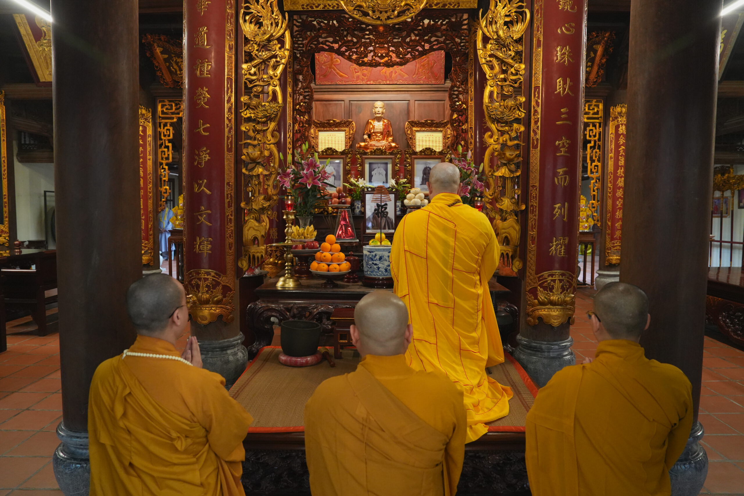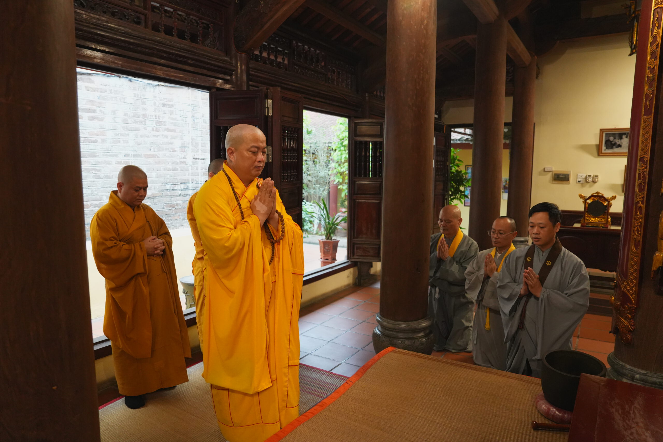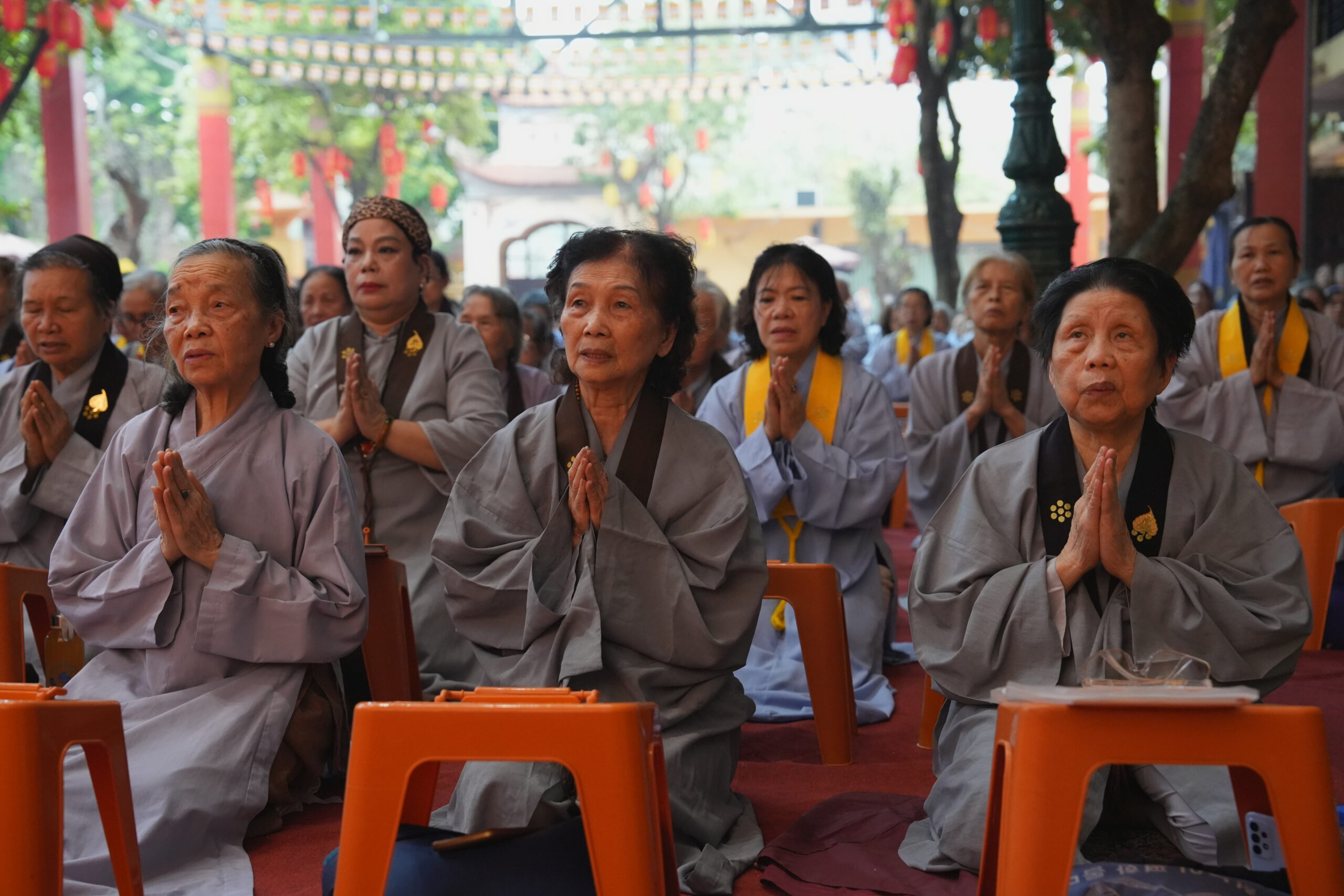 Đúng 7h30, chư Tăng bản tự quang lâm Tổ đường niêm hương bạch Phật, đỉnh lễ Tổ sư, chính thức khai mở đàn tràng tu học. Sau đó, Đại đức Thích Thanh Tâm – Ủy viên Thường trực, Phó Văn phòng Ban Hoằng pháp Trung ương GHPGVN đã trao truyền Bát quan trai giới tới toàn thể đại chúng. Từng lời giới được tuyên đọc không chỉ là khuôn phép giữ gìn thân khẩu ý, mà còn là con đường trở về nuôi dưỡng nội tâm.