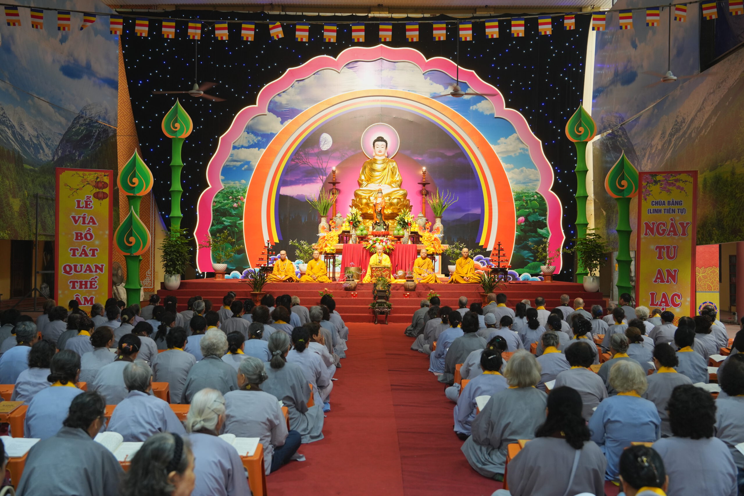 Khép lại một ngày tu, đại chúng đồng hồi hướng công đức về Bồ Tát Quan Thế Âm và Tam Bảo, nguyện cầu cho thế giới hòa bình, chúng sinh an lạc, mưa thuận gió hòa, nhân dân ấm no hạnh phúc. Dòng kinh tiếng kệ lắng sâu như suối nguồn thanh lương, gột rửa phiền não, nuôi lớn hạt giống thiện lành nơi mỗi hành giả.