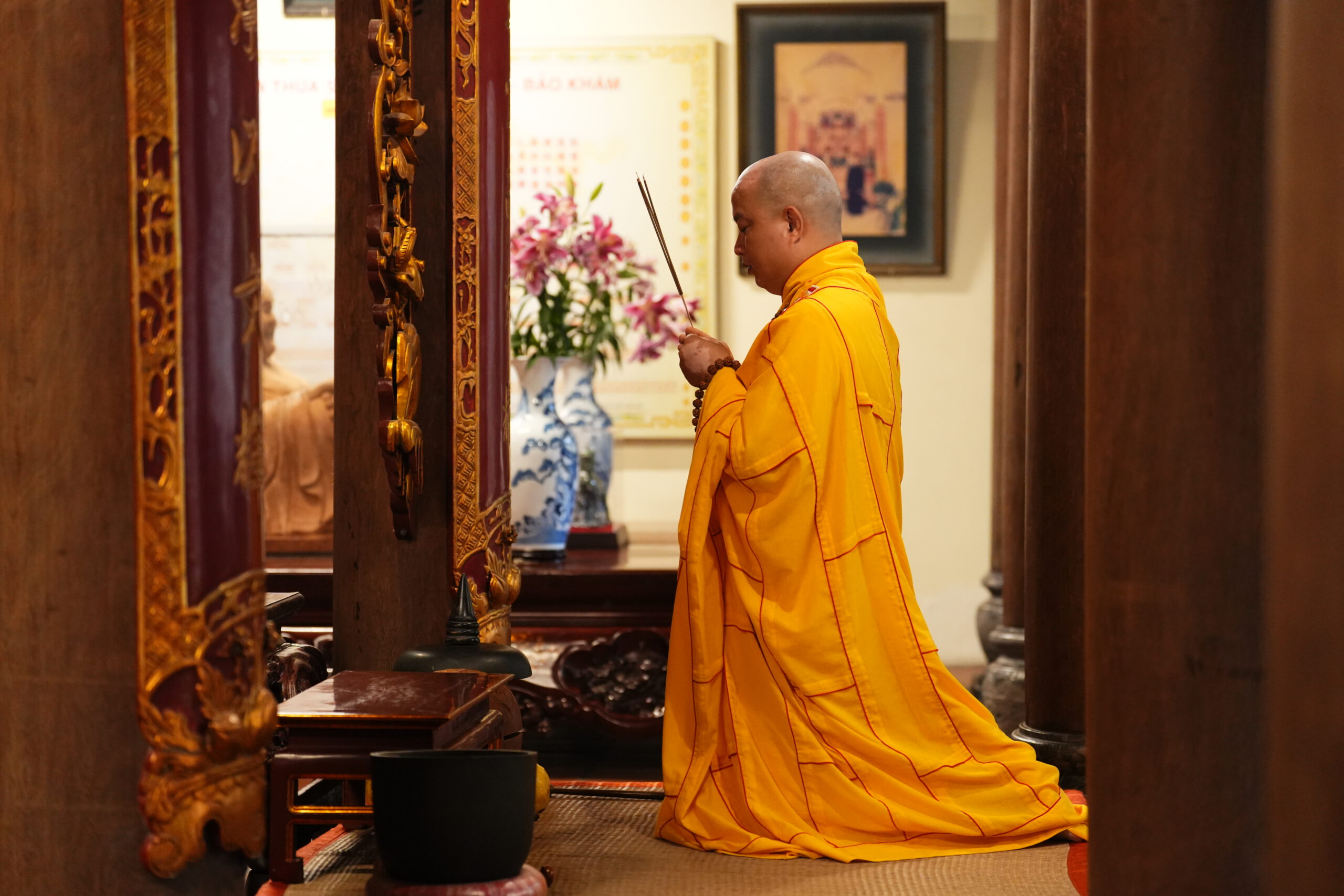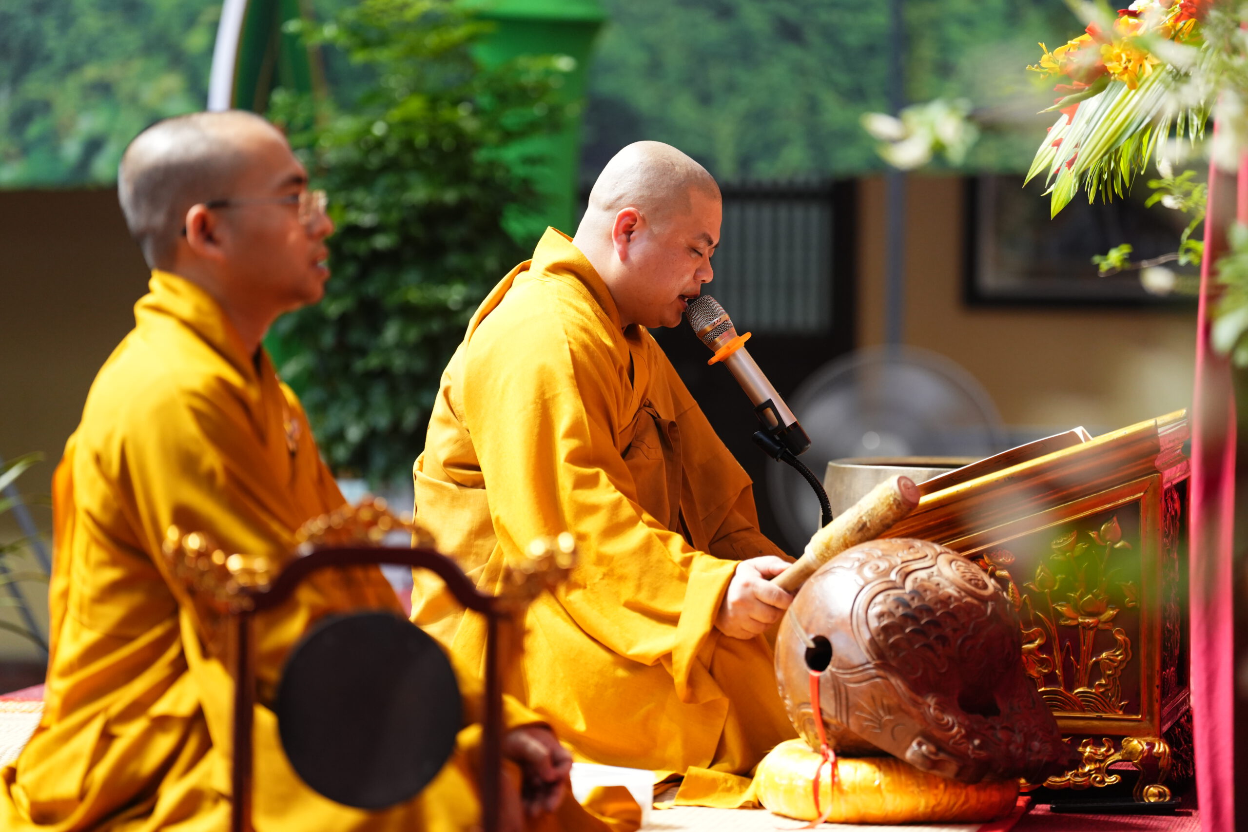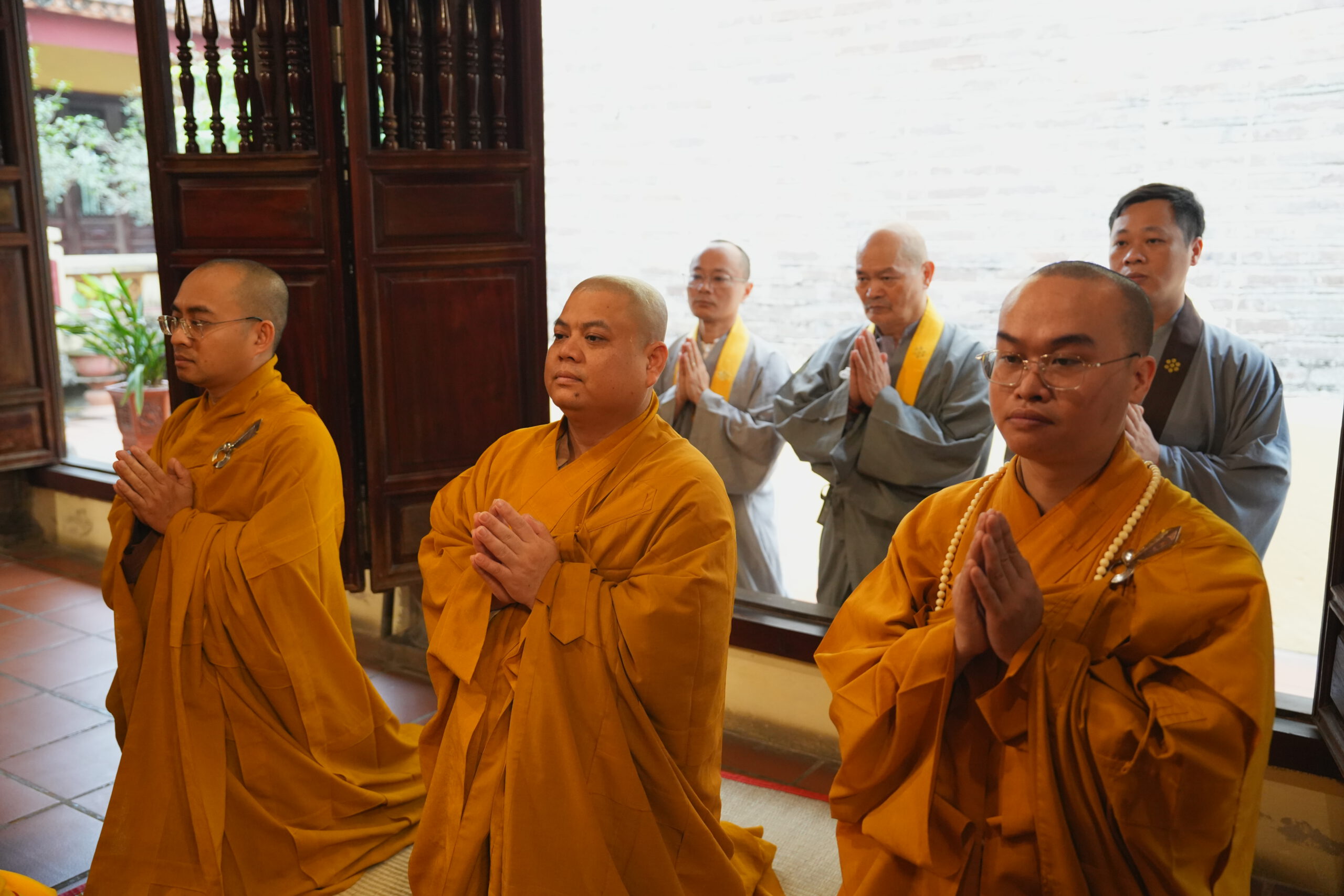 Đúng 7h30, chư Tăng bản tự quang lâm Tổ đường niêm hương bạch Phật, đỉnh lễ Tổ sư, chính thức khai mở đàn tràng tu học. Sau đó, Đại đức Thích Thanh Tâm – Ủy viên Thường trực, Phó Văn phòng Ban Hoằng pháp Trung ương GHPGVN đã trao truyền Bát quan trai giới tới toàn thể đại chúng. Từng lời giới được tuyên đọc không chỉ là khuôn phép giữ gìn thân khẩu ý, mà còn là con đường trở về nuôi dưỡng nội tâm.