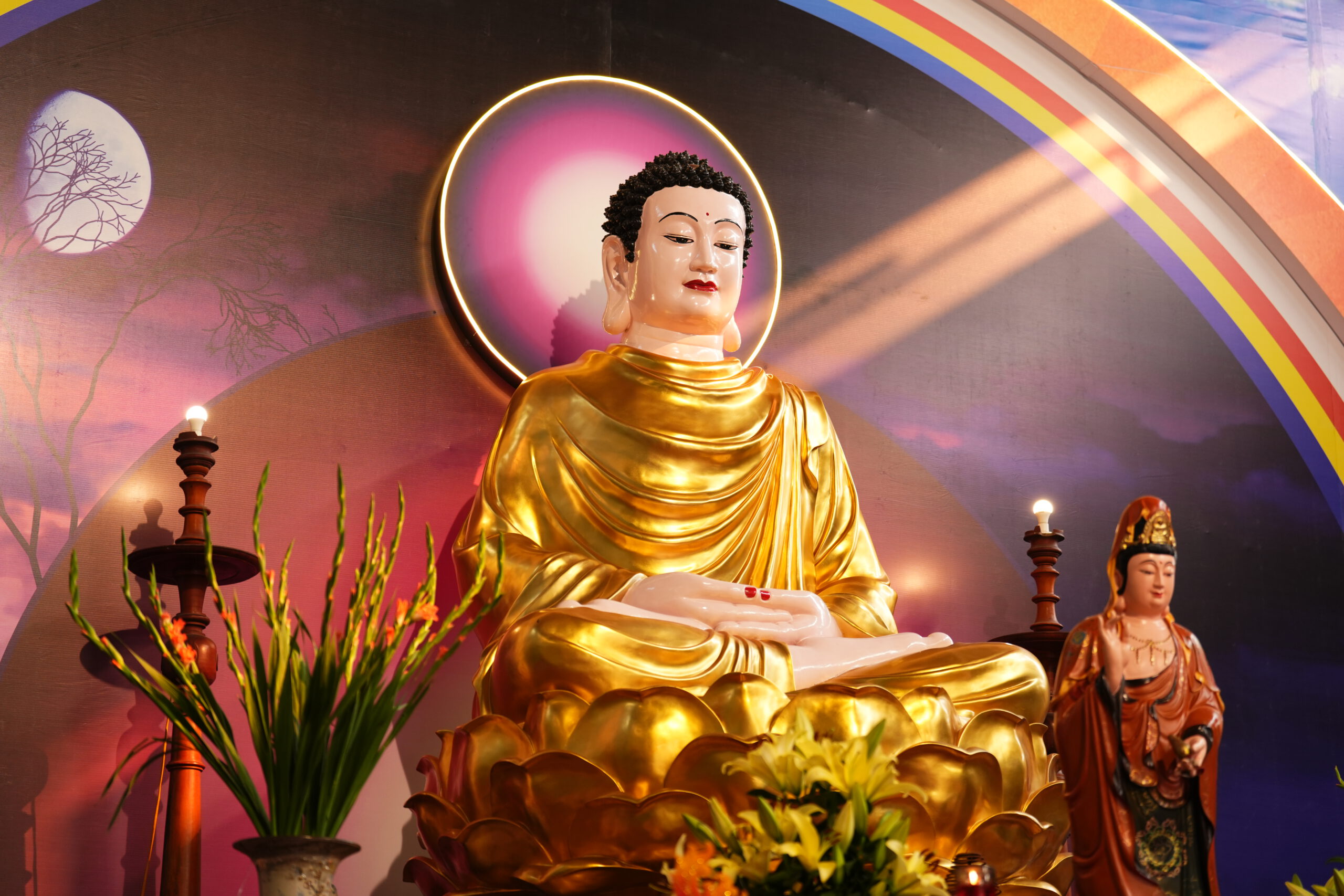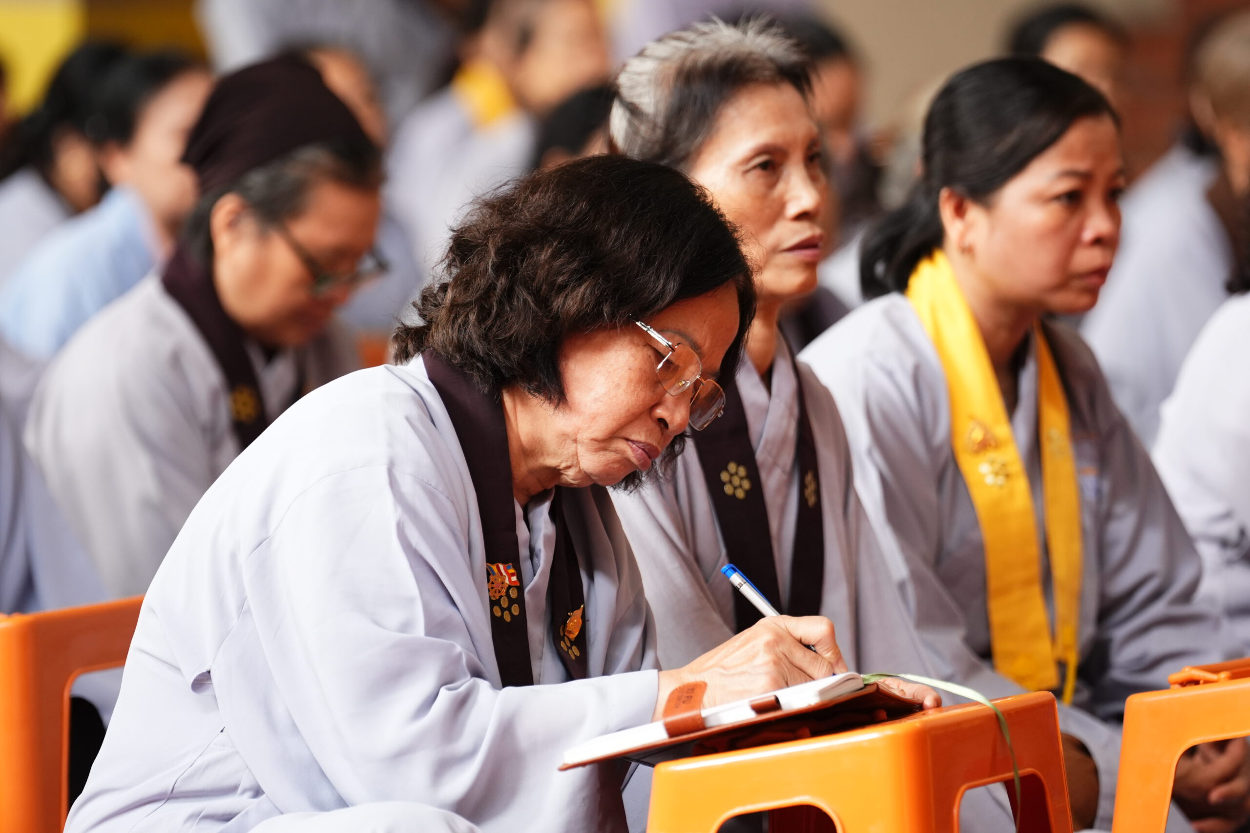 Đầu giờ chiều, Đại đức Thích Thanh Tâm – Ủy viên Thường trực, Phó Văn phòng Ban Hoằng pháp Trung ương GHPGVN đã có bài thuyết giảng với chủ đề “Sống Theo Hạnh Phật”. Đại đức nhấn mạnh, để đạt quả vị giác ngộ như Đức Như Lai, cần kiên nhẫn và quán chiếu nội tâm. Việc thọ trì Bát Quan Trai giới không chỉ là giữ giới, mà còn là hành trình tự quan sát, học hỏi giáo pháp và suy nghiệm trong từng hành động. Khi lần chuỗi hạt niệm danh hiệu Bồ Tát, mỗi hạt là một nhịp giúp hành giả nhất tâm bất loạn, duy trì chính niệm và cảm ứng đạo giao. Trên cổng chùa Bằng, ba chữ “Văn – Tư – Tu” nhắc nhở rằng sự kết hợp hài hòa giữa học hỏi, quán chiếu và thực hành là nền tảng tu học Pháp Hoa: lắng nghe, mở tâm và giữ trọn giới luật.
