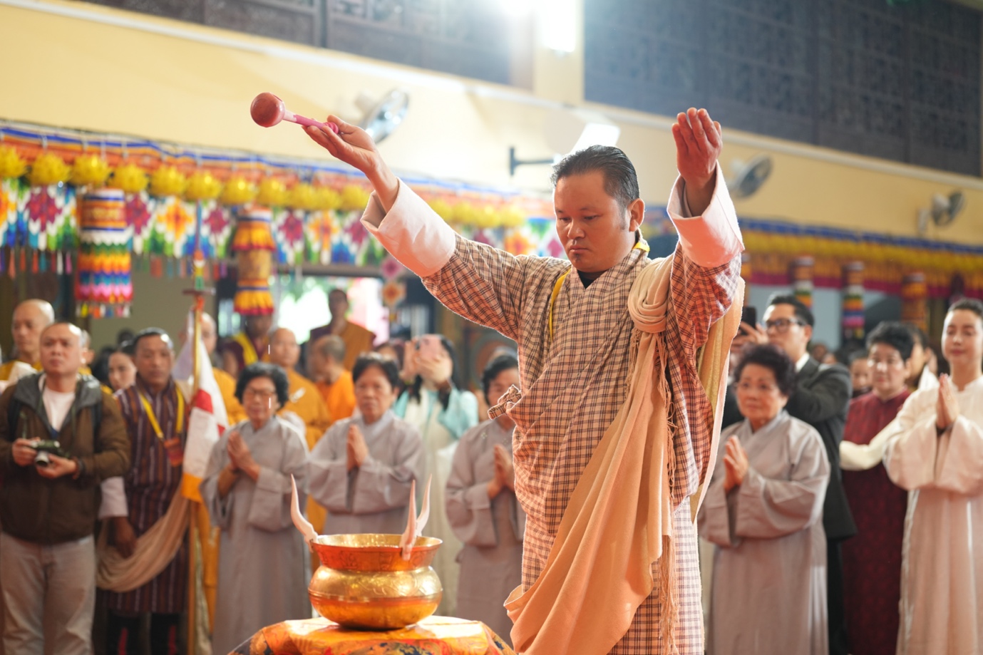 Trong niềm thành kính hướng về Tam bảo, chư Tôn đức Tăng Việt Nam và Bhutan đã cùng cử hành nghi thức niêm hương bạch Phật, nhất tâm cầu nguyện cho thế giới hòa bình, chiến tranh và xung đột sớm chấm dứt, để nhân loại được sống trong hòa hợp, an lạc và phát triển bền vững. Những lời kinh trầm hùng vang lên giữa không gian thiêng liêng như nhắc nhở con người quay về với tâm từ bi và trí tuệ, những giá trị cốt lõi của giáo pháp Đức Phật.
