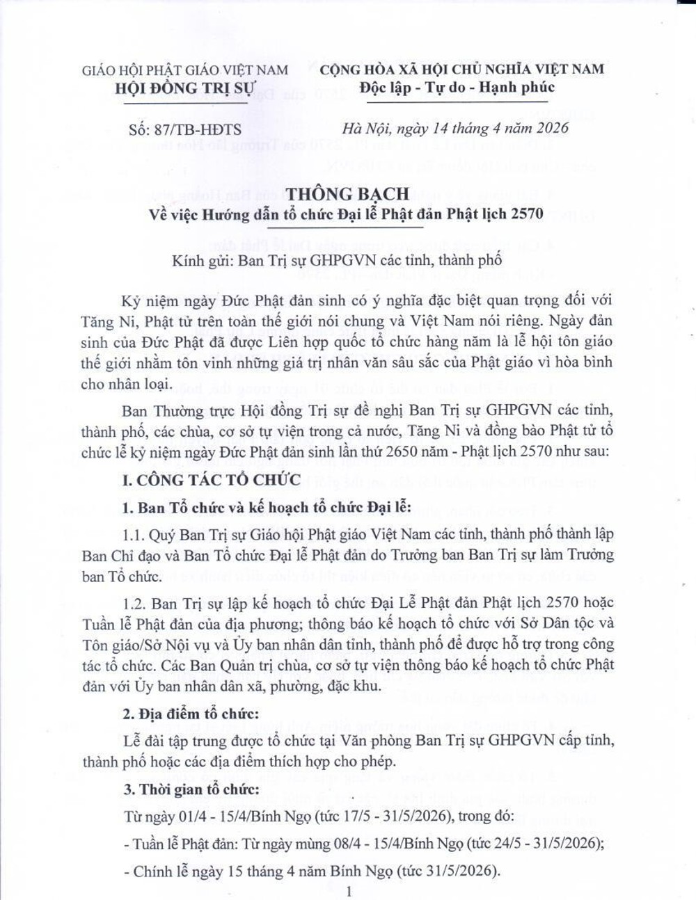 Hướng tới Đại lễ Phật đản Phật lịch 2570 – Dương lịch 2026, ngày 14/4, Trưởng lão Hòa thượng Thích Thiện Nhơn, Phó Pháp chủ HĐCM, Chủ tịch HĐTS GHPGVN ấn ký ban hành Thông bạch số 87/TB-HĐTS gửi đến Ban Trị sự GHPGVN các tỉnh, thành phố hướng dẫn tổ chức Đại lễ.