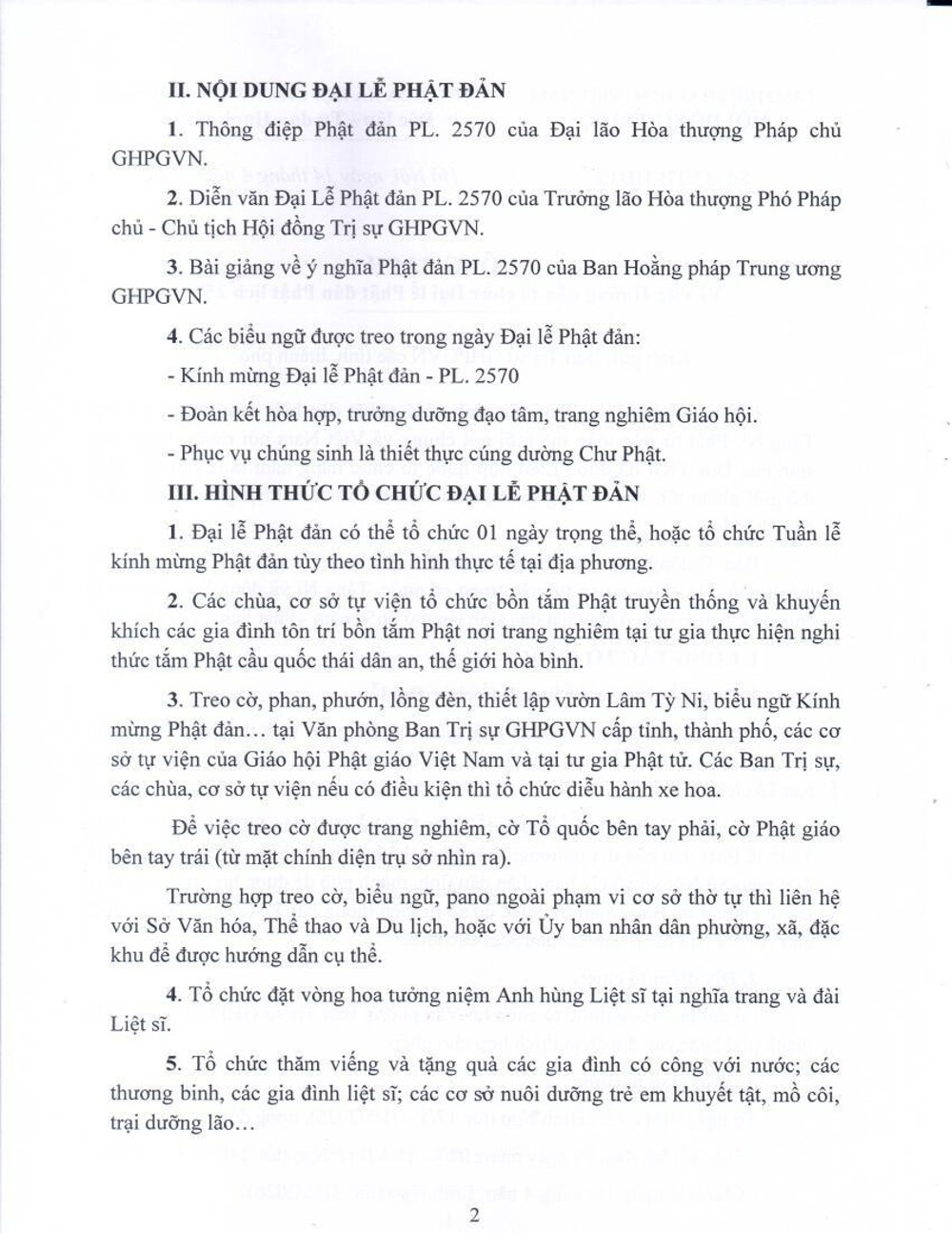 5. Ban Thường trực Hội đồng Trị sự Giáo hội Phật giáo Việt Nam đề nghị Quý Ban Trị sự GHPGVN các cấp, chư Tôn đức trụ trì các Tự viện, Tăng Ni và Phật tử hoan hỷ phát tâm cúng dường công đức, trí tuệ vào việc tổ chức Đại Lễ Phật đản Phật lịch 2570 được thành tựu viên mãn.