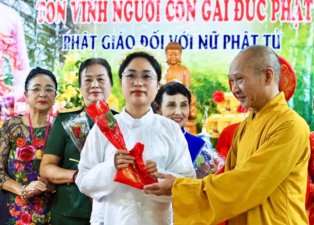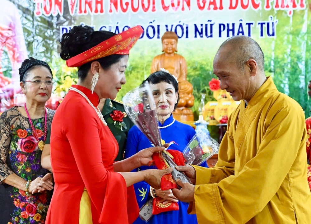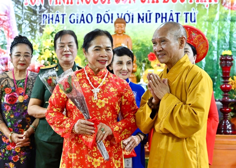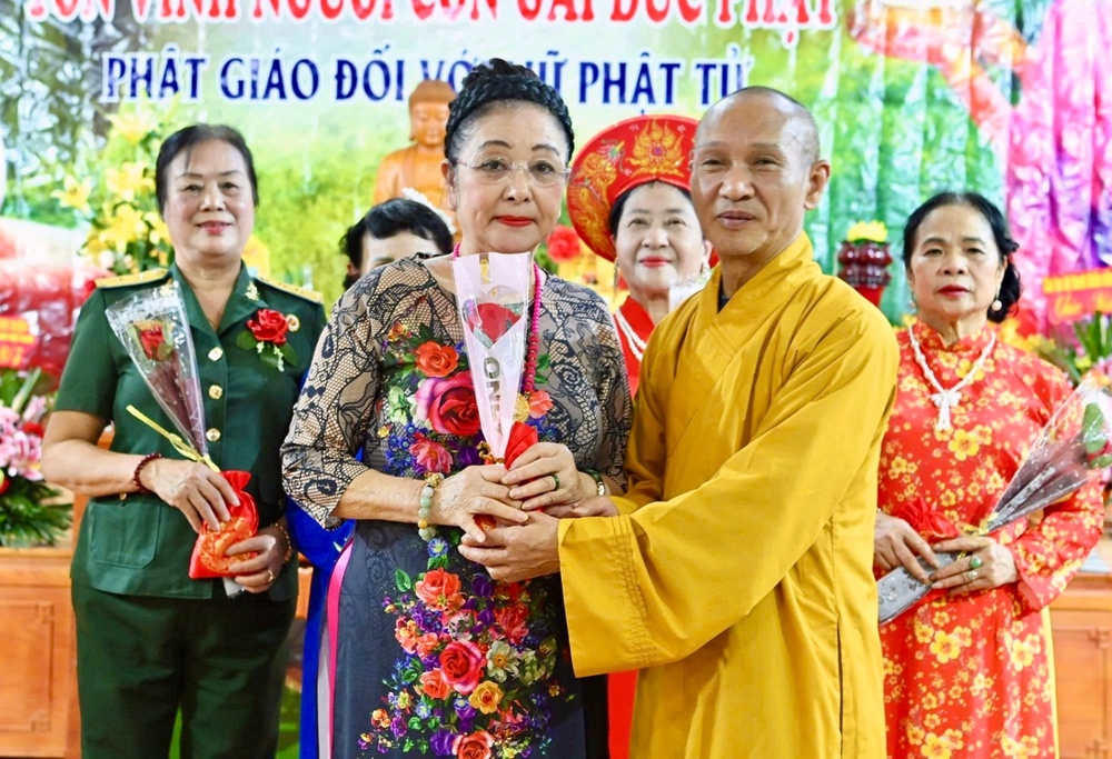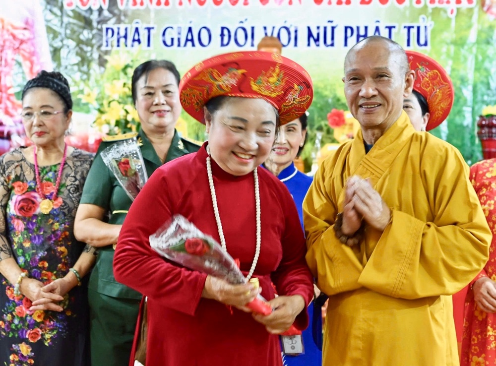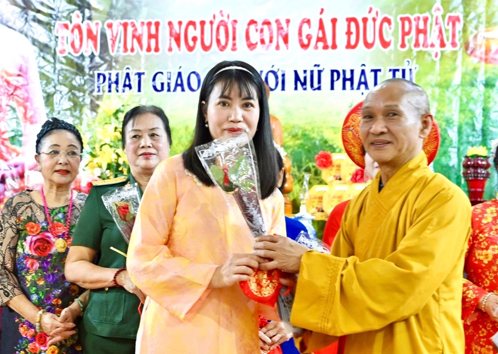 Ghi nhận những đóng góp của các nữ Phật tử đã có thành tích xuất sắc trong công tác Phật sự, Hòa thượng trực tiếp động viên trao tặng hoa và quà tặng cho các Phật tử tinh tấn, nhân Ngày Quốc tế Phụ nữ 8-3.