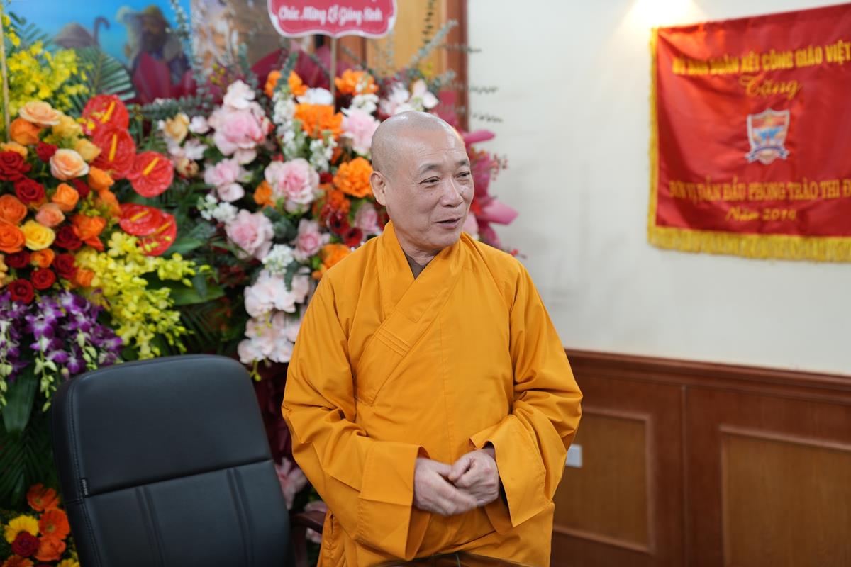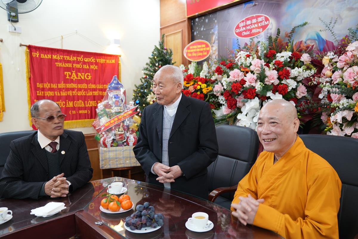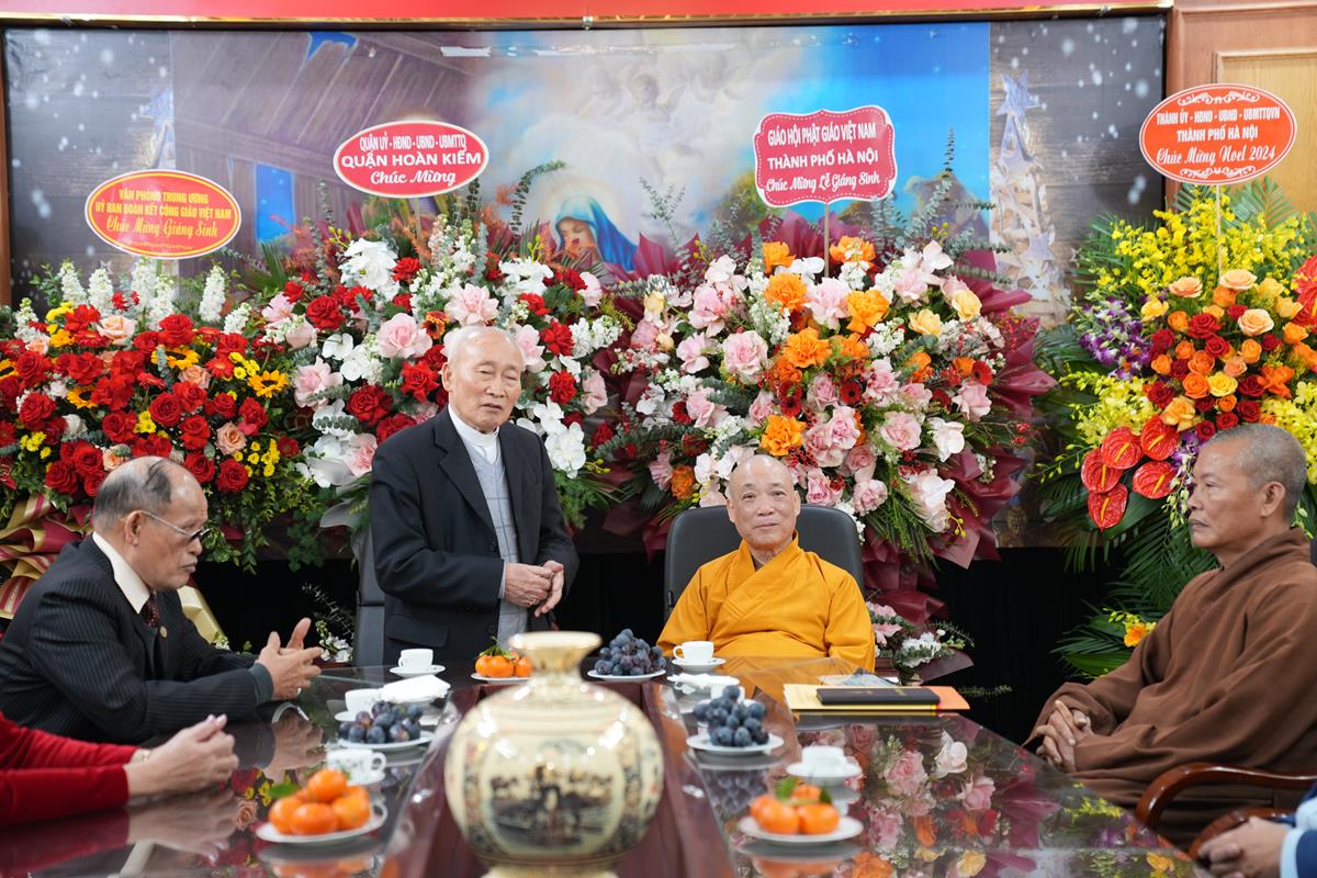 Thay mặt lãnh đạo Phật giáo thành phố, Hòa thượng Thích Bảo Nghiêm cùng Thượng tọa Thích Đạo Phong – Phó Ban kiêm Chánh thư ký BTS GHPGVN thành phố Hà Nội đã tặng hoa, gửi lời chúc mừng đến linh mục Anton Maria Dương Phú Oanh – Chủ tịch Ủy ban Đoàn kết Công giáo Việt Nam thành phố Hà Nội, cùng các vị trong Ban Thường trực Ủy ban Đoàn kết Công giáo Việt Nam TP Hà Nội, các linh mục và đồng bào Công giáo Thủ đô một mùa Giáng sinh và năm mới 2025 an lành, hạnh phúc.