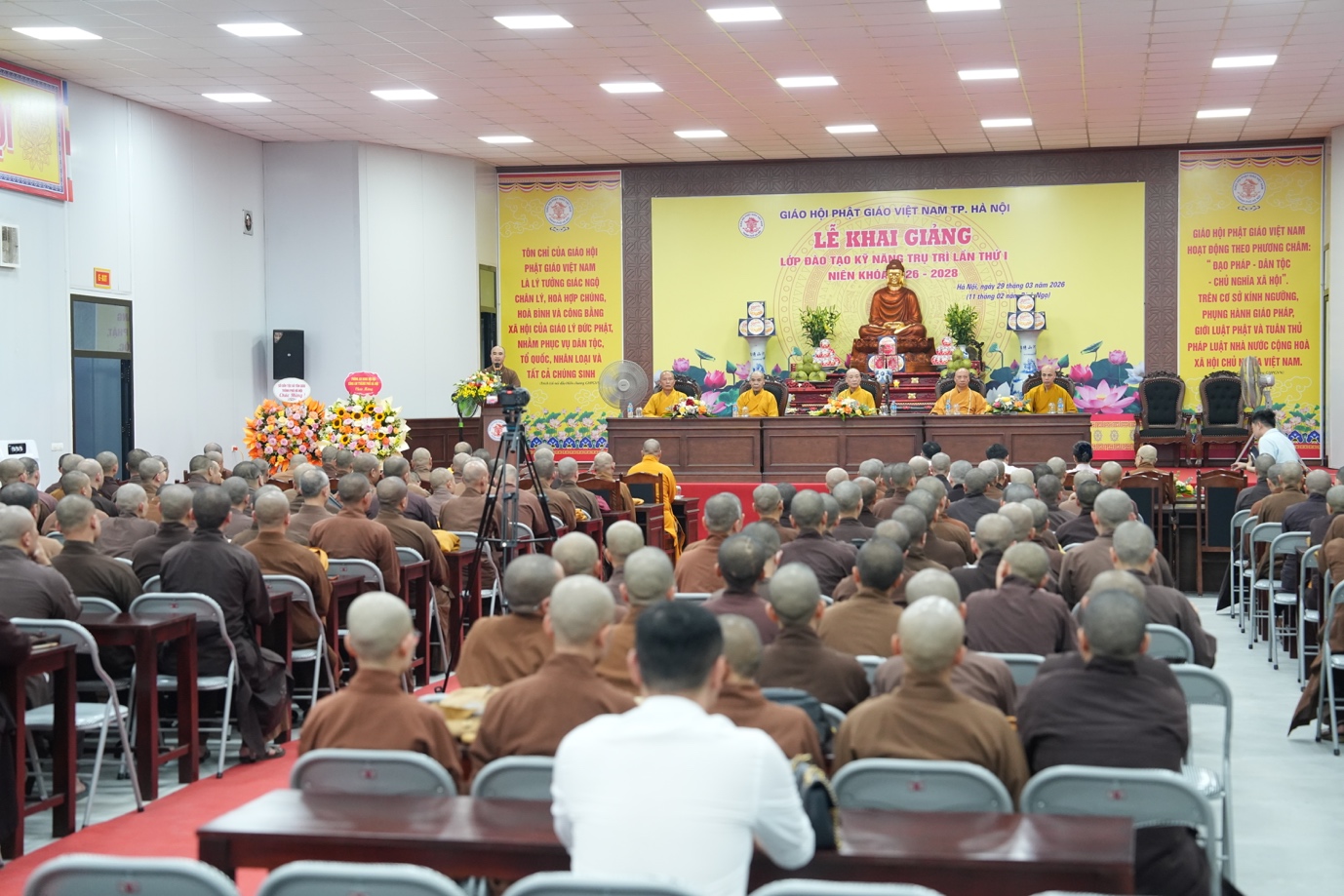 Tại Lễ khai giảng, Thượng tọa Thích Đạo Phong – Ủy viên HĐTS, Phó ban kiêm Chánh thư ký BTS GHPGVN thành phố báo cáo công tác tuyển sinh lớp học và chương trình đào tạo. Theo đó, Lớp đào tạo bồi dưỡng trụ trì khóa I của Phật giáo Hà Nội niên khóa 2026 – 2028 có tổng 396 vị, trong đó chư Tăng 107 vị, chư Ni 289 vị. Chương trình đào tạo có 15 môn: Kinh nghiệm trụ trì, Luật Tứ Phần – Các pháp Yết ma; Quan hệ đối ngoại quốc tế; Kiến trúc mỹ thuật Phật giáo; Giáo dục Phật giáo; Giới luật Phật giáo; Hoằng pháp trụ trì; Thiền lâm bảo huấn – Truy môn cảnh huấn; Văn bản quản lý Giáo hội; Nghi lễ Phật giáo; Kỹ năng tổ chức đạo tràng, hướng dẫn Phật tử và truyền thông trong thời đại công nghệ số; Lịch sử các ngôi chùa Hà Nội; Giới luật của Ni giới; Luật tín ngưỡng, tôn giáo sửa đổi; Chuyển đổi số và dịch vụ hành chính công. Ngoài ra, Thượng tọa cũng thông báo quy chế đào tạo đến toàn bộ Tăng Ni học viên.