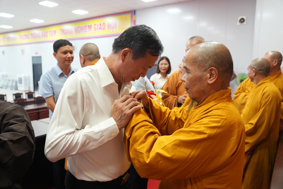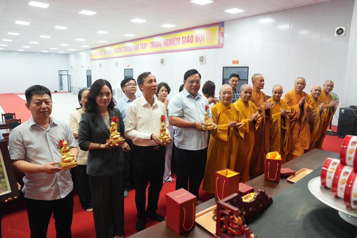 Trong không khí trang nghiêm và ấm áp đạo tình, Thứ trưởng Nguyễn Hải Trung cùng lãnh đạo Ban Tôn giáo Chính phủ và Sở dân tộc – Tôn giáo đã trao tặng lẵng hoa chúc mừng Ban Trị sự GHPGVN thành phố Hà Nội. Đặc biệt, chư Tôn đức lãnh đạo BTS Phật giáo Thủ đô đã gài lên ngực áo quý vị đại biểu những đóa hoa hiếu đạo, tuy nhỏ bé nhưng chan chứa đạo tình, nhắc nhớ mỗi người về tứ trọng ân, về nghĩa cử tri ân và báo ân – cội nguồn tinh thần của mùa Vu Lan – Báo hiếu. Hình ảnh ấy vừa thân tình, vừa thiêng liêng, kết nối hồn dân tộc với tinh hoa Phật giáo, làm cho buổi gặp gỡ trở nên thắm đượm đạo vị, gợi lên niềm xúc động sâu xa nơi người tham dự.
