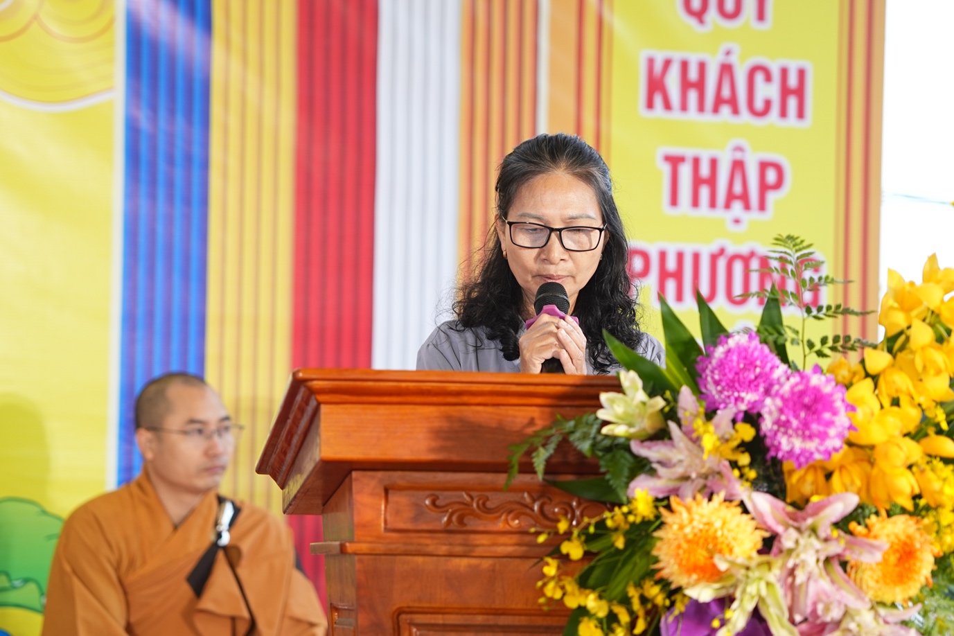 trưởng ban Xây dựng chùa Thanh Huệ báo cáo tổng kết xây dựng.