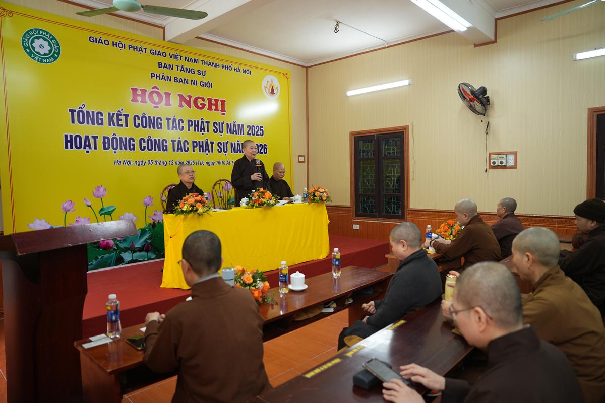 Tại hội nghị, sau lời phát biểu khai mạc của Ni trưởng Thích Đàm Thành, chư Ni đã lắng nghe Ni sư Thích Đàm Luyện trình bày báo cáo tổng kết công tác Phật sự năm 2025. Theo báo cáo, năm 2025 – năm thứ ba của nhiệm kỳ 2022–2027, Phân ban Ni giới TP Hà Nội đã nỗ lực triển khai đồng bộ nhiều hoạt động trọng tâm trên các lĩnh vực: giáo dục Tăng Ni, an cư kiết hạ, hoằng pháp, hướng dẫn Phật tử tu học, công tác nghi lễ, xây dựng – trùng tu – tôn tạo các tự viện, và các chương trình từ thiện xã hội.