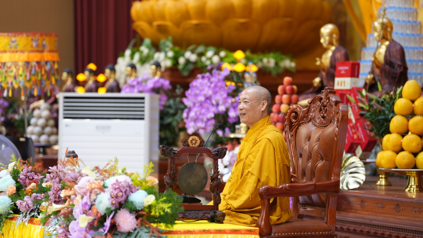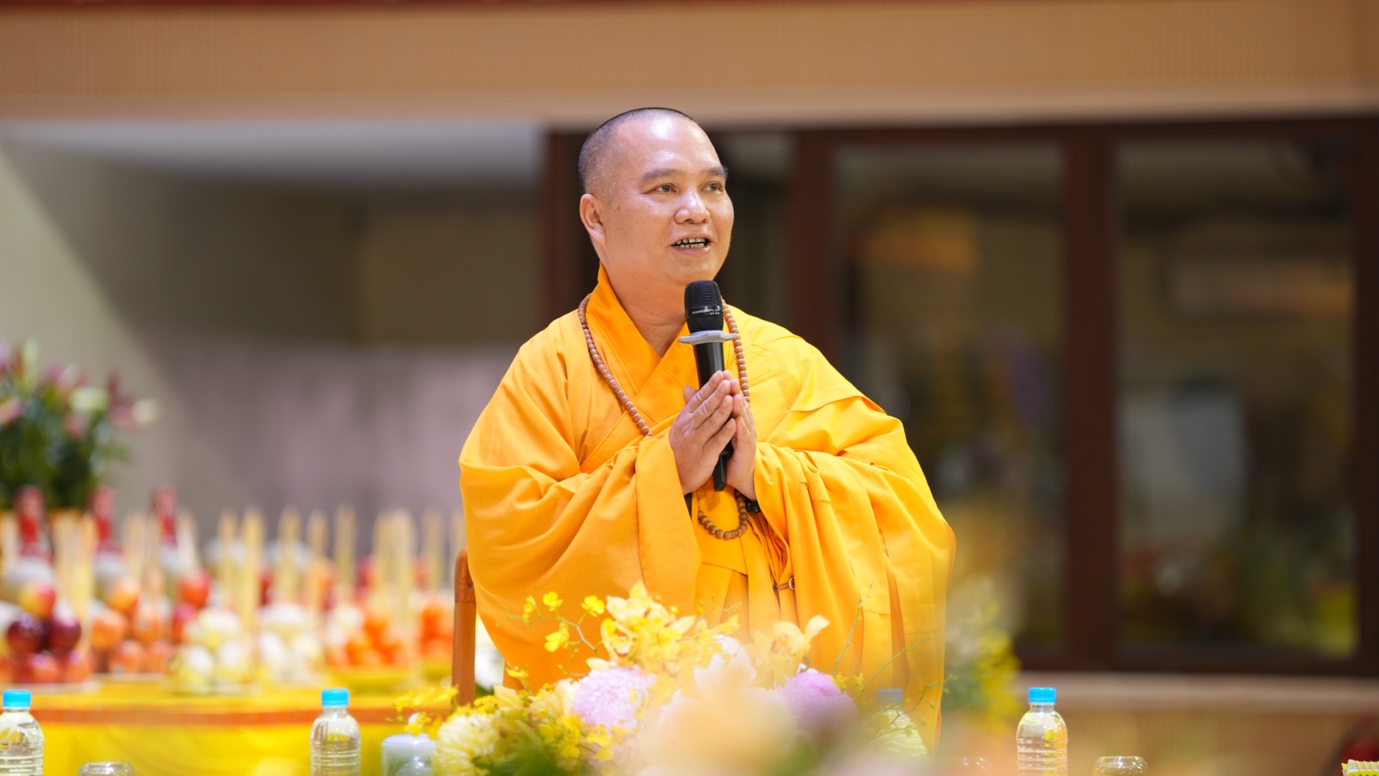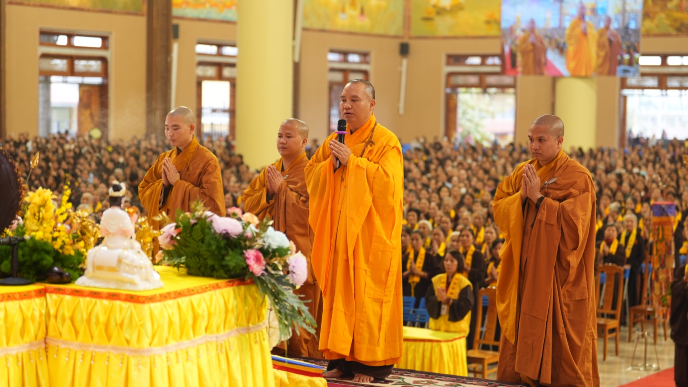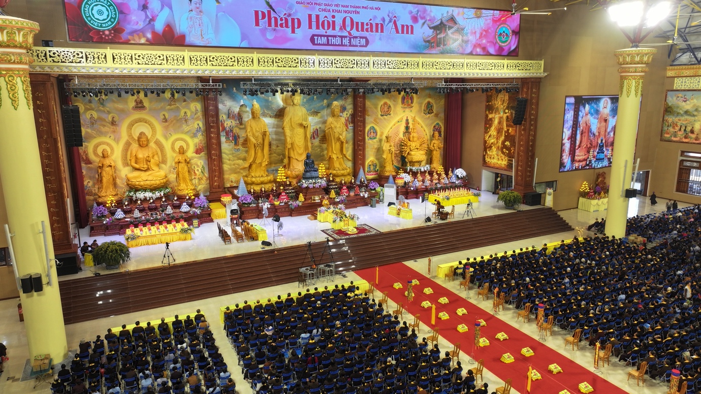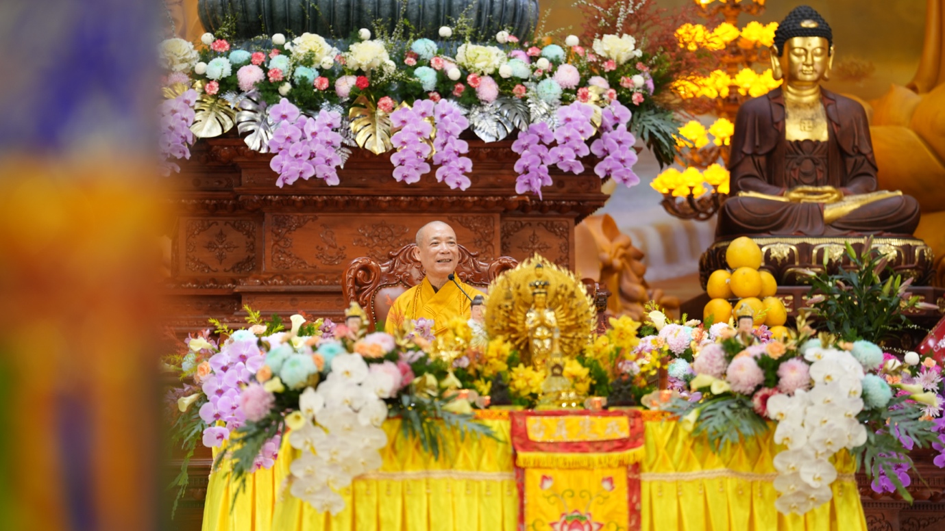 Hòa thượng cũng nhấn mạnh “Trong phẩm Phổ Môn của Kinh Diệu Pháp Liên Hoa, Đức Phật Thích Ca Mâu Ni đã tán thán công hạnh của Bồ Tát Quán Thế Âm với tâm từ rộng lớn, luôn dùng “từ nhãn thị chúng sinh” – lấy đôi mắt từ bi để nhìn cuộc đời, lắng nghe và cảm thông trước mọi nỗi khổ đau của muôn loài. Sự vân tập của các Phật tử tại pháp hội này chính là năng lượng tu tập lớn để cùng nhau hồi hướng cho đất nước chấm dứt chiến tranh, đất nước phát triển hội nhập và toàn thể mọi người đều được bình an”.