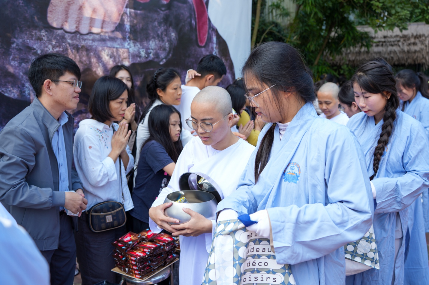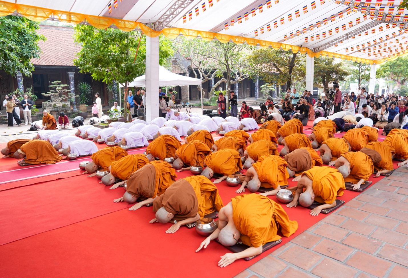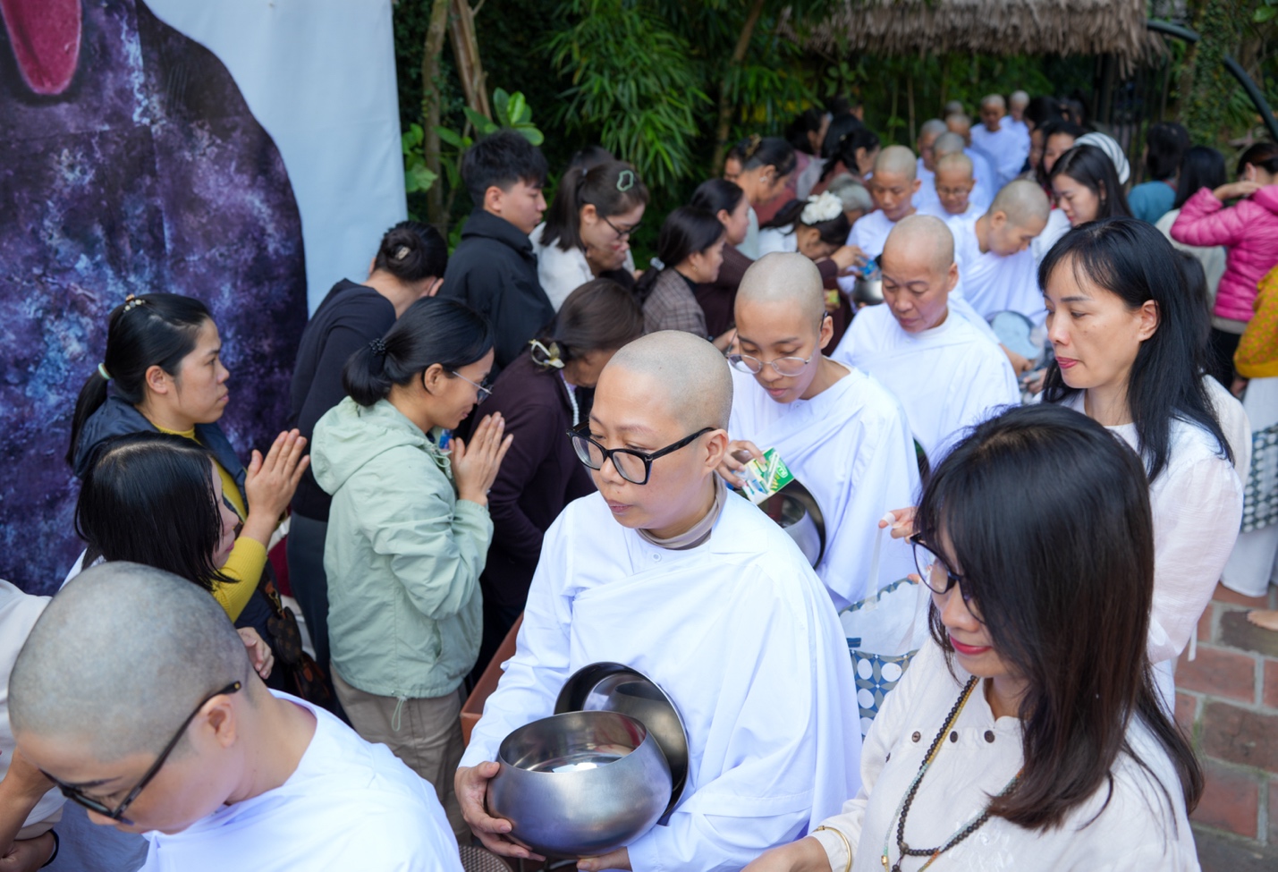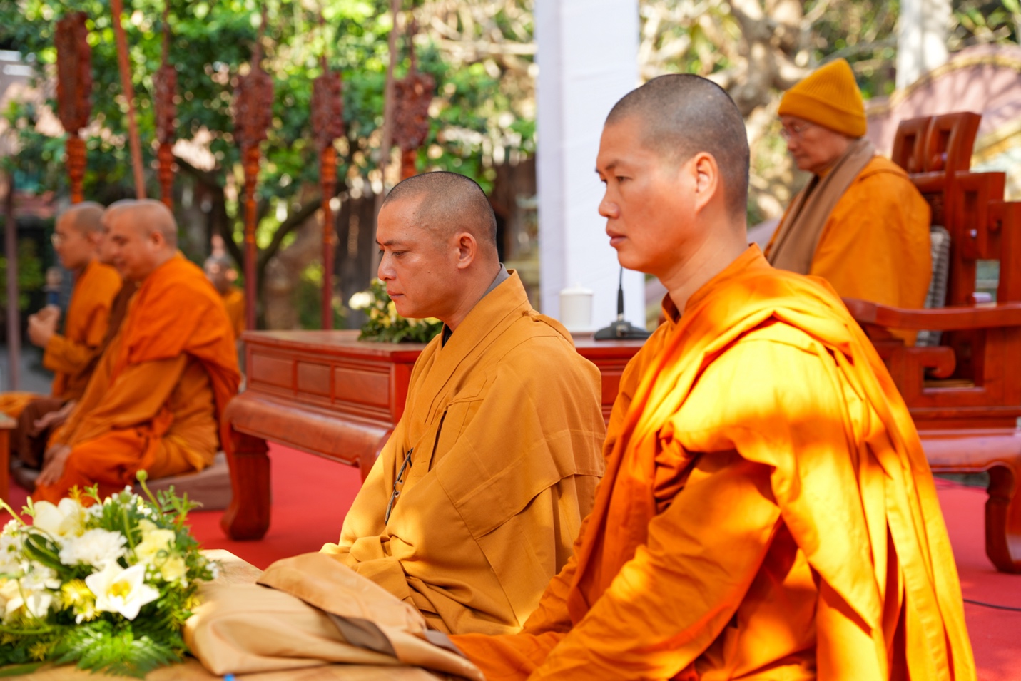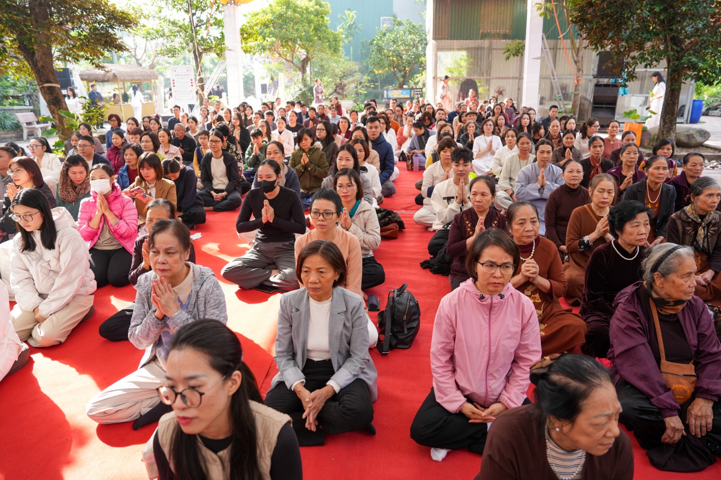 Trong không khí trang nghiêm và thanh tịnh, chư tôn đức Tăng đã cử hành nghi thức xuất gia gieo duyên cho các thiền sinh. 60 hành giả đồng quỳ trước Tam bảo, chắp tay trang nghiêm, lắng nghe lời chỉ dạy của chư Tôn đức về ý nghĩa của việc phát tâm xuất gia gieo duyên, buông bỏ nếp sống thường nhật để bước vào đời sống phạm hạnh trong một khoảng thời gian nhất định.