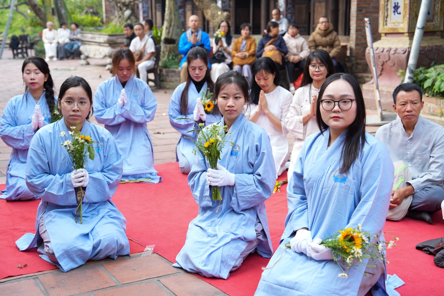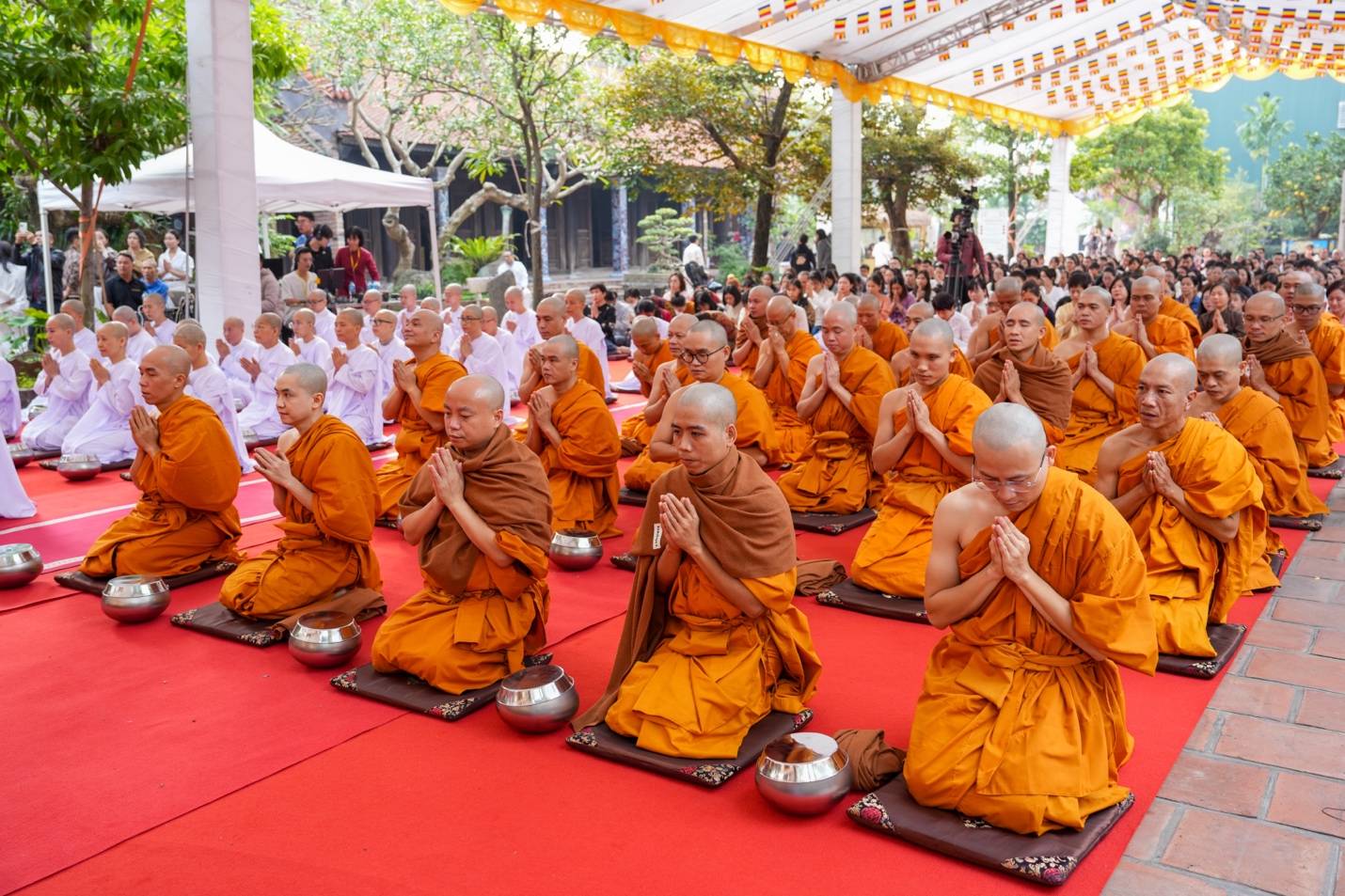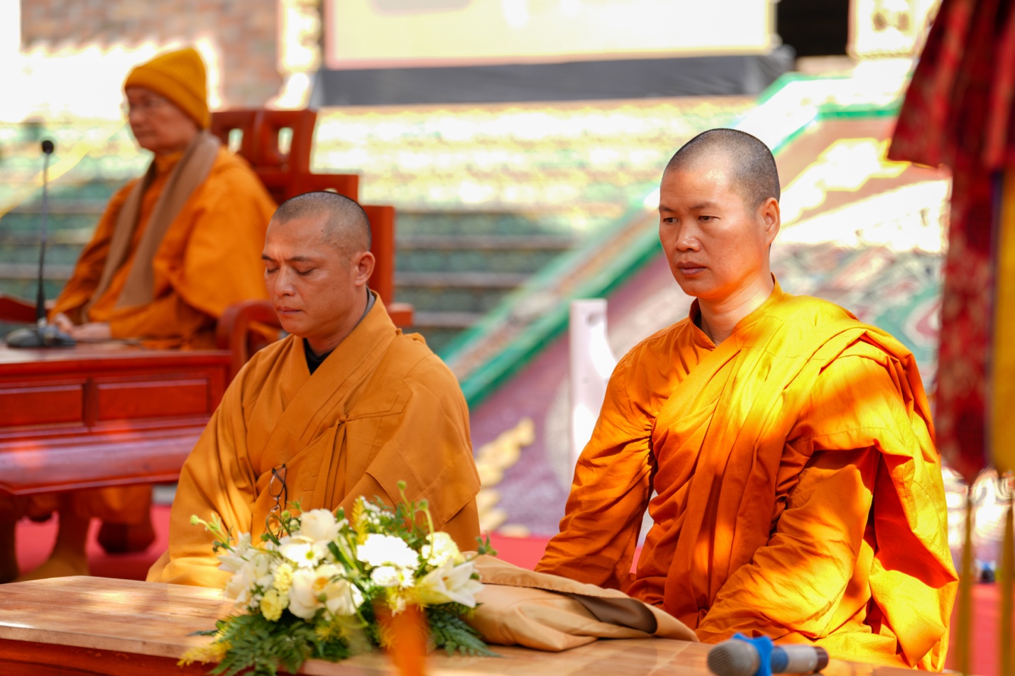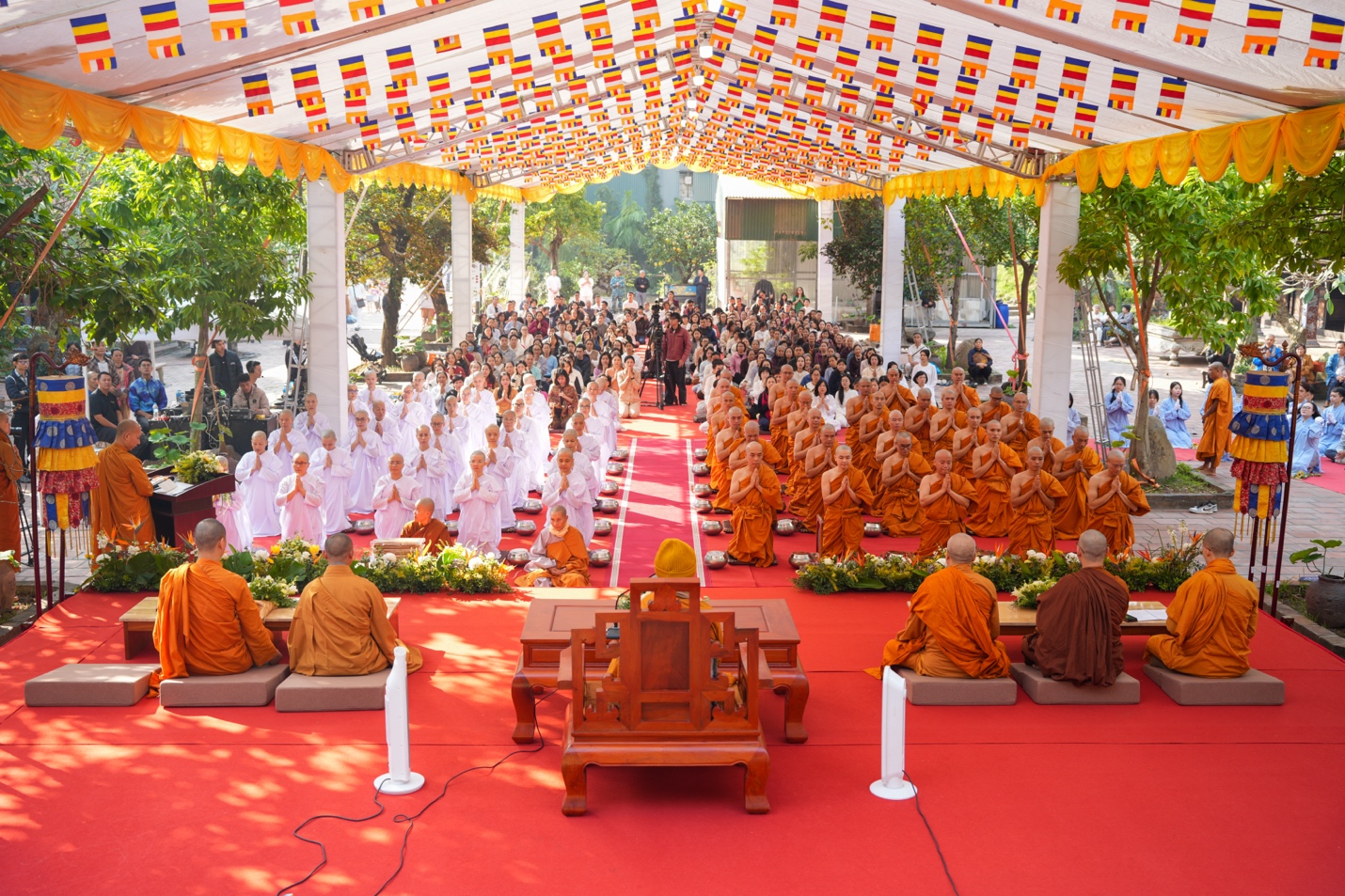 Trong không khí trang nghiêm và thanh tịnh, chư tôn đức Tăng đã cử hành nghi thức xuất gia gieo duyên cho các thiền sinh. 60 hành giả đồng quỳ trước Tam bảo, chắp tay trang nghiêm, lắng nghe lời chỉ dạy của chư Tôn đức về ý nghĩa của việc phát tâm xuất gia gieo duyên, buông bỏ nếp sống thường nhật để bước vào đời sống phạm hạnh trong một khoảng thời gian nhất định.