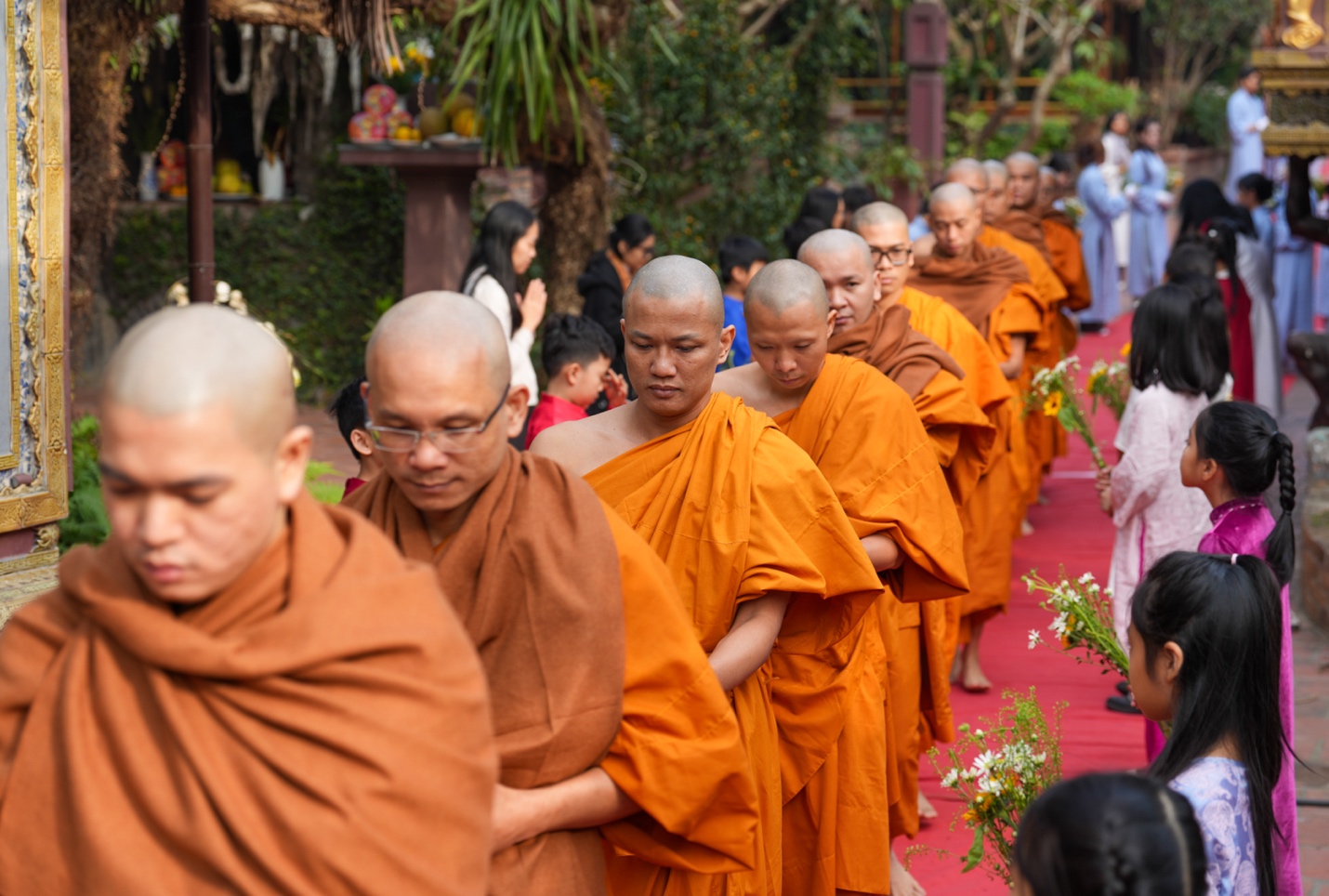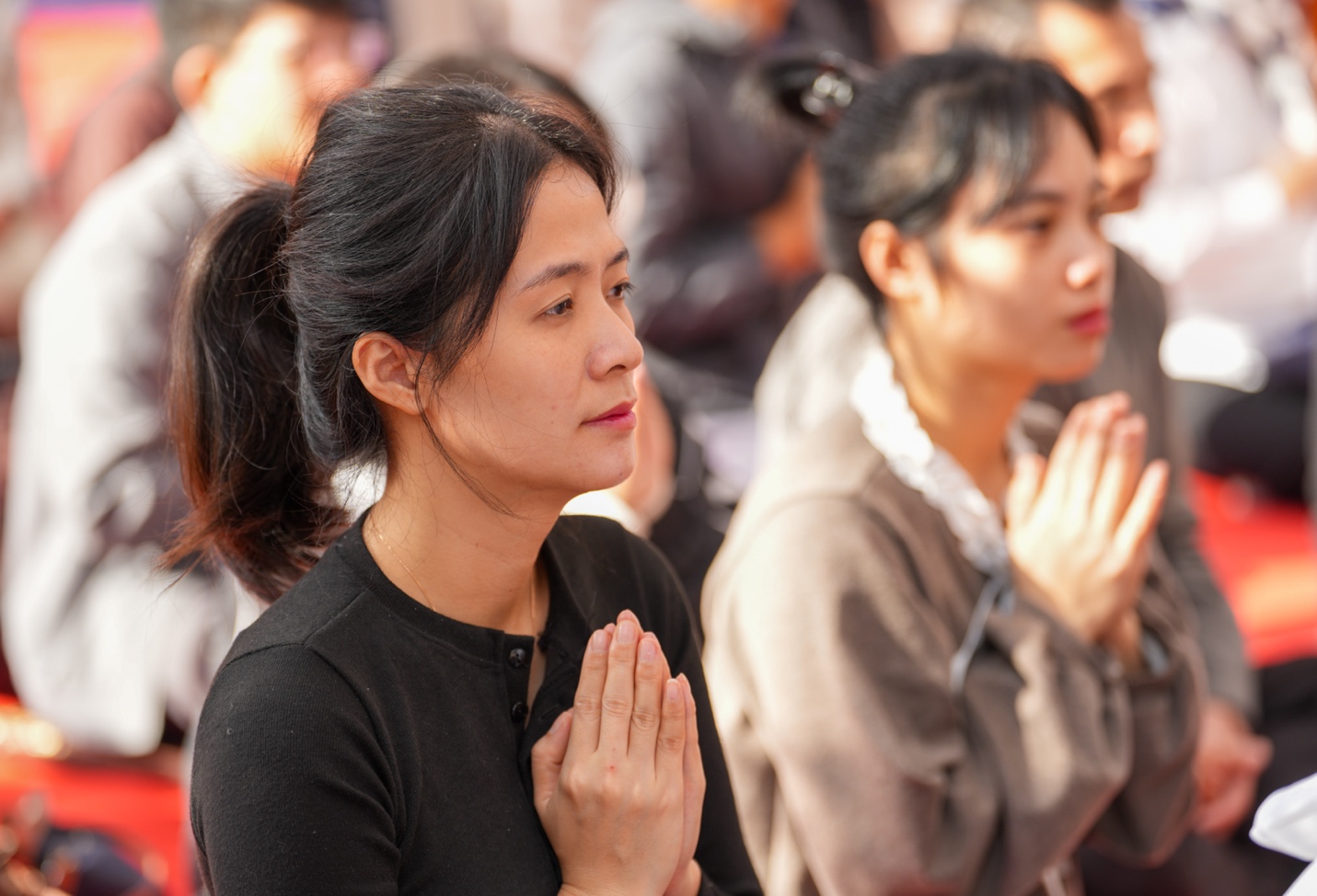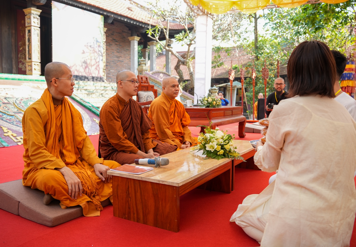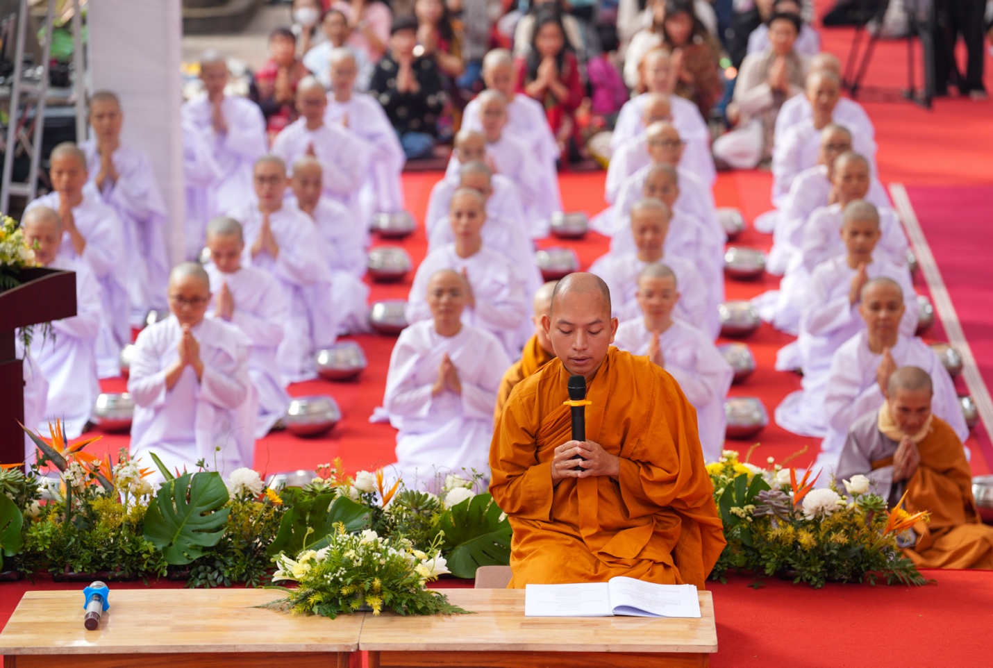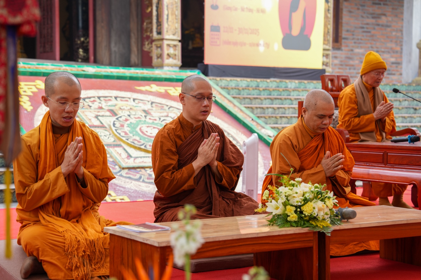 Trong không khí trang nghiêm và thanh tịnh, chư tôn đức Tăng đã cử hành nghi thức xuất gia gieo duyên cho các thiền sinh. 60 hành giả đồng quỳ trước Tam bảo, chắp tay trang nghiêm, lắng nghe lời chỉ dạy của chư Tôn đức về ý nghĩa của việc phát tâm xuất gia gieo duyên, buông bỏ nếp sống thường nhật để bước vào đời sống phạm hạnh trong một khoảng thời gian nhất định.
