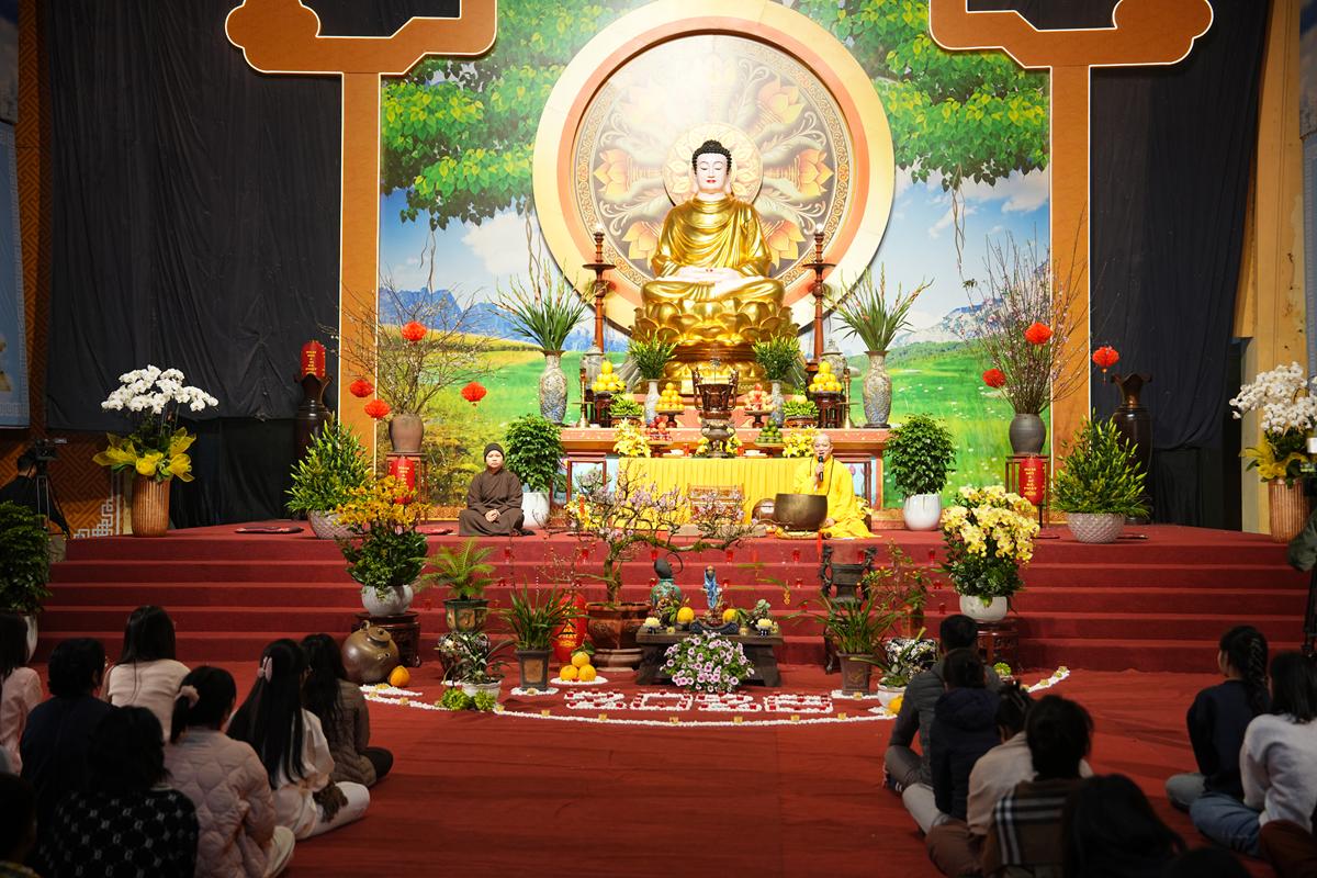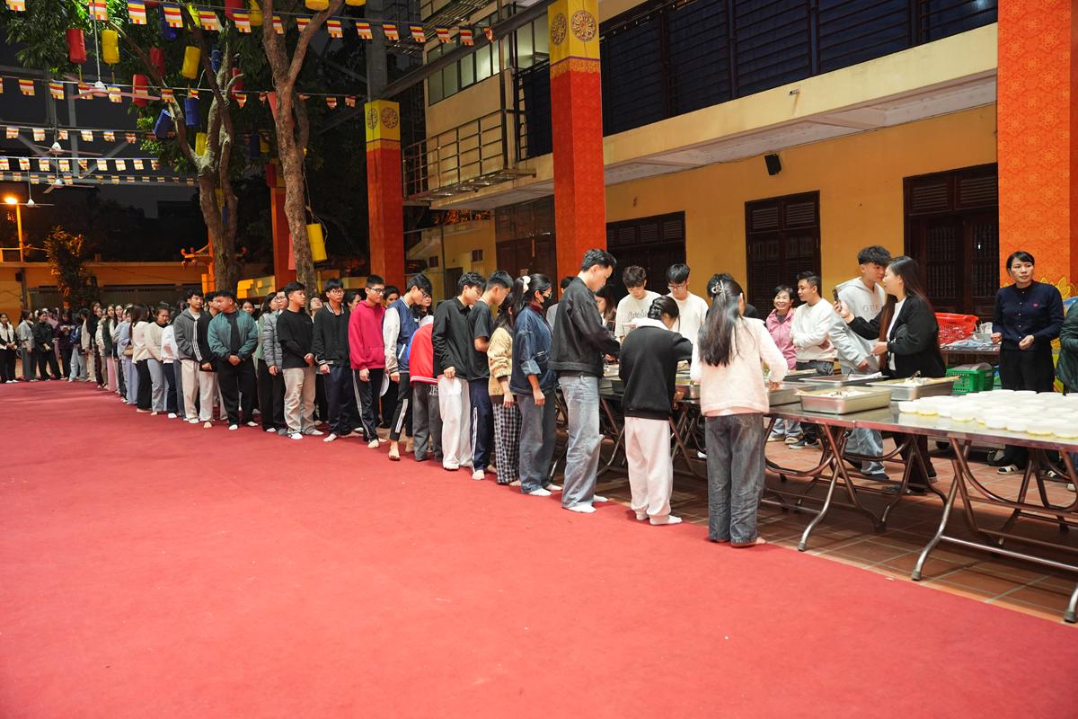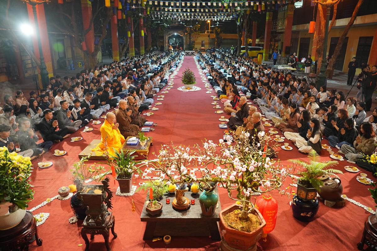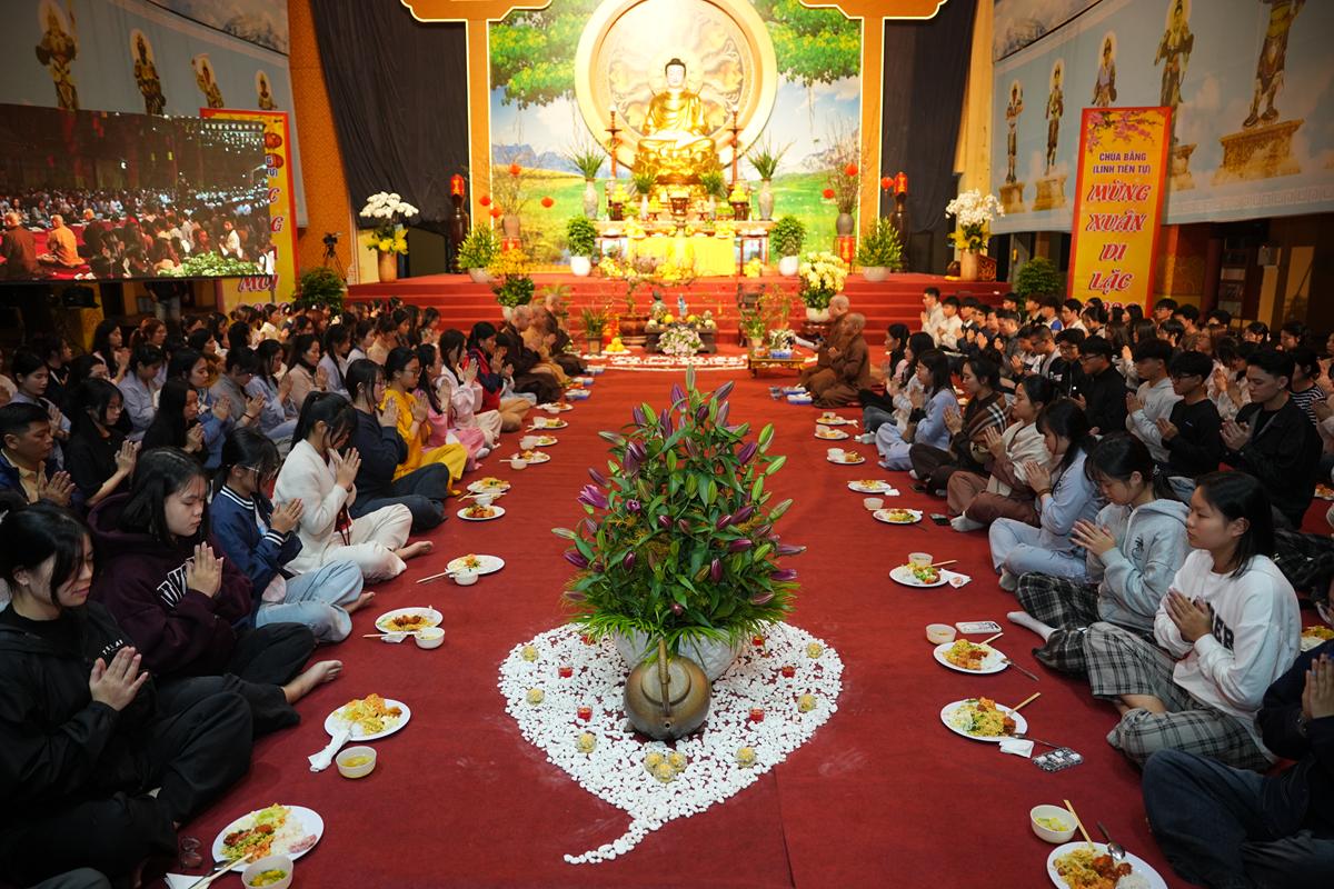 Trước khi dùng bữa, đối trước Phật đài trang nghiêm, dưới sự chủ trì và hướng dẫn của Hòa thượng trụ trì Thích Bảo Nghiêm – Phó Chủ tịch Hội đồng Trị sự GHPGVN, Trưởng ban Hoằng pháp Trung ương, Trưởng ban Trị sự GHPGVN TP. Hà Nội, các khóa sinh đã thực hiện nghi thức phụng thỉnh Tổ tiên đầy thiêng liêng.