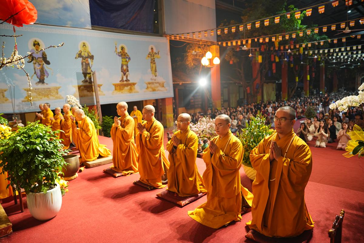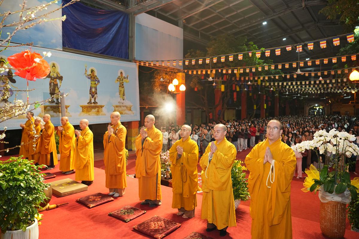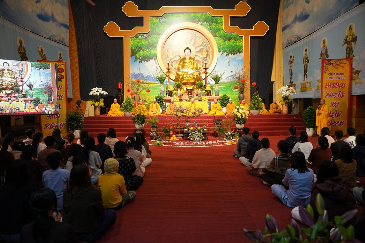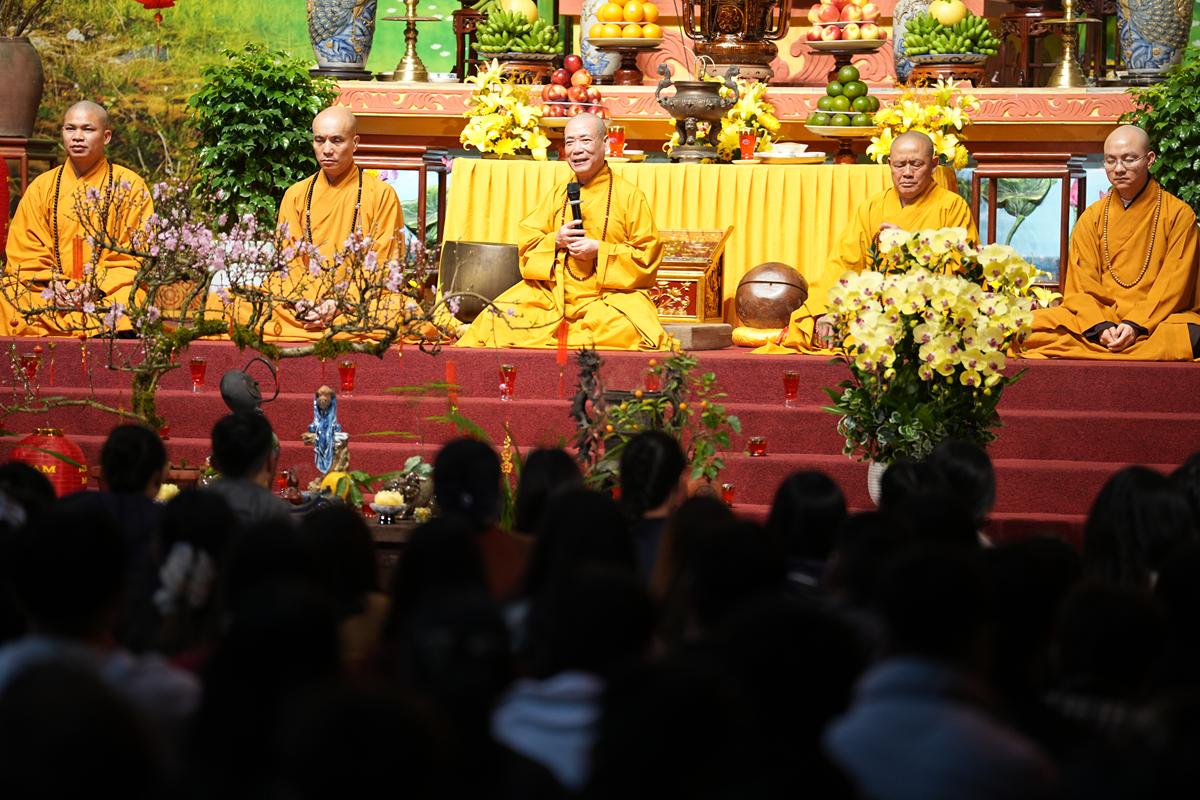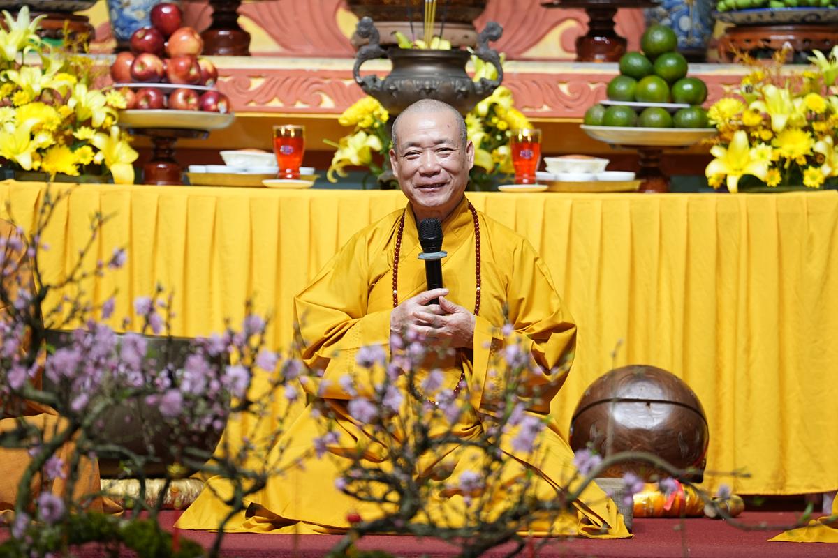 Tại đây, Hòa thượng bày tỏ niềm hoan hỷ khi chứng kiến sự hiện diện đông đủ của chư Tăng Ni, các bạn trẻ, các em thiếu nhi và nhiều gia đình cùng trở về chùa tu học trong thời khắc đặc biệt của năm mới. Hòa thượng nhấn mạnh: “Nhất nhật tương phùng, vạn kiếp nhân duyên” – một ngày được gặp nhau nơi cửa Phật là kết tinh của vô lượng nhân duyên lành từ nhiều đời nhiều kiếp.