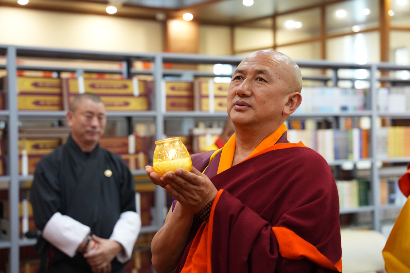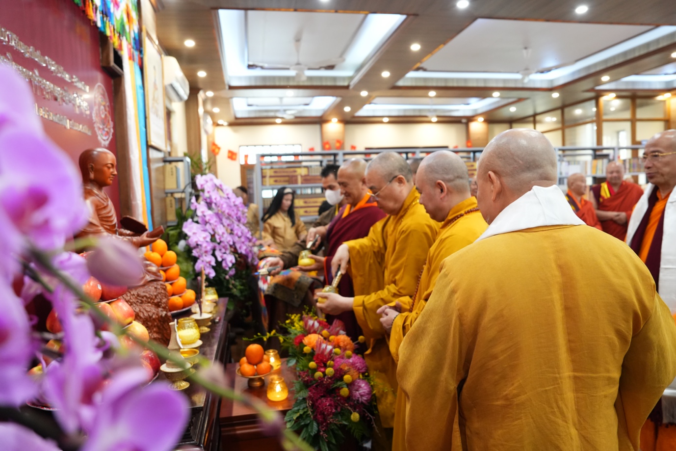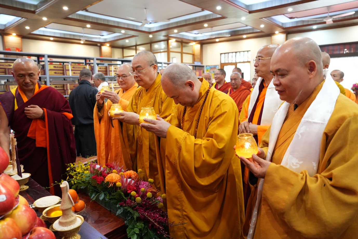 Tiếp đó, trong không gian trang nghiêm trước Phật đài, chư tôn đức hai nước đã cùng thắp sáng những ngọn đèn hoa đăng, nguyện cầu ánh sáng từ bi và trí tuệ của Phật pháp lan tỏa khắp muôn nơi, đem lại hòa bình và an lạc cho thế giới.