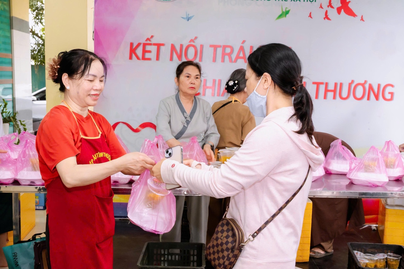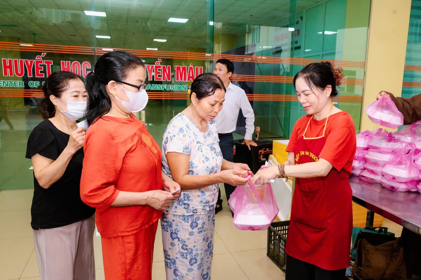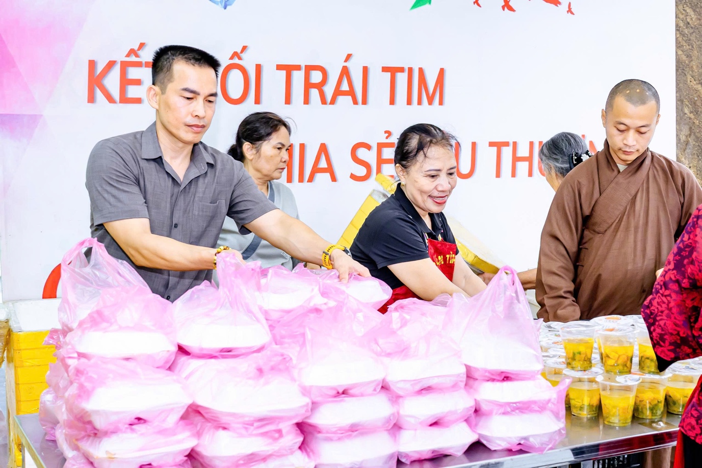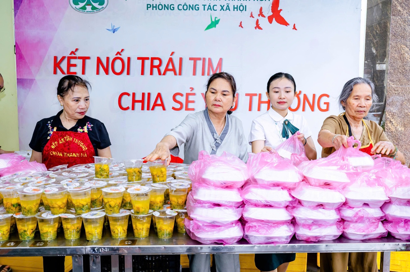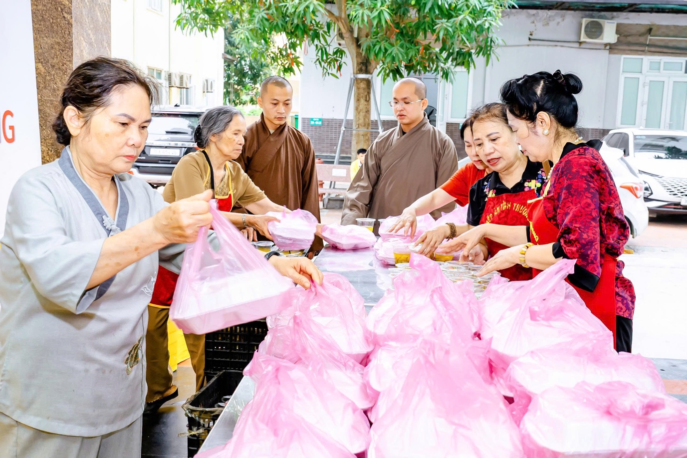 Mỗi tuần hai lần, gần 1000 suất cơm chay kèm theo sữa và trái cây được chuẩn bị chu đáo, sạch sẽ và trao tận tay người bệnh. Từng phần ăn giản dị nhưng chứa đựng biết bao tâm huyết, là kết tinh của tình thương, của sự quan tâm chân thành và tinh thần “cứu khổ ban vui” trong đạo Phật.