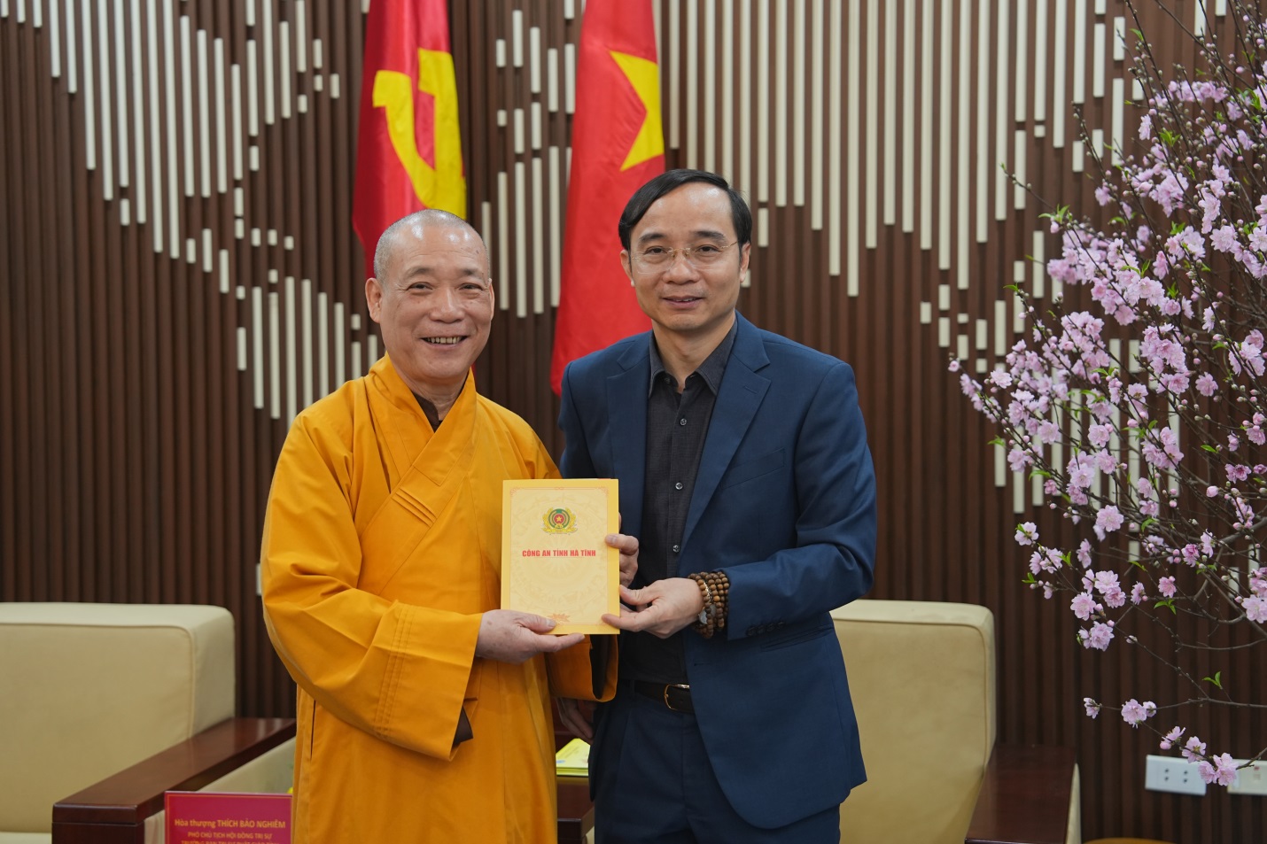 Tiếp đó, phái đoàn Ban Trị sự GHPGVN tỉnh Hà Tĩnh đã đến chúc Tết Công an tỉnh Hà Tĩnh. Tại trụ sở Công an Tỉnh, Thiếu tướng Nguyễn Xuân Thao – Ủy viên Ban Thường vụ Tỉnh ủy, Giám đốc Công an tỉnh đã thân mật tiếp đoàn.