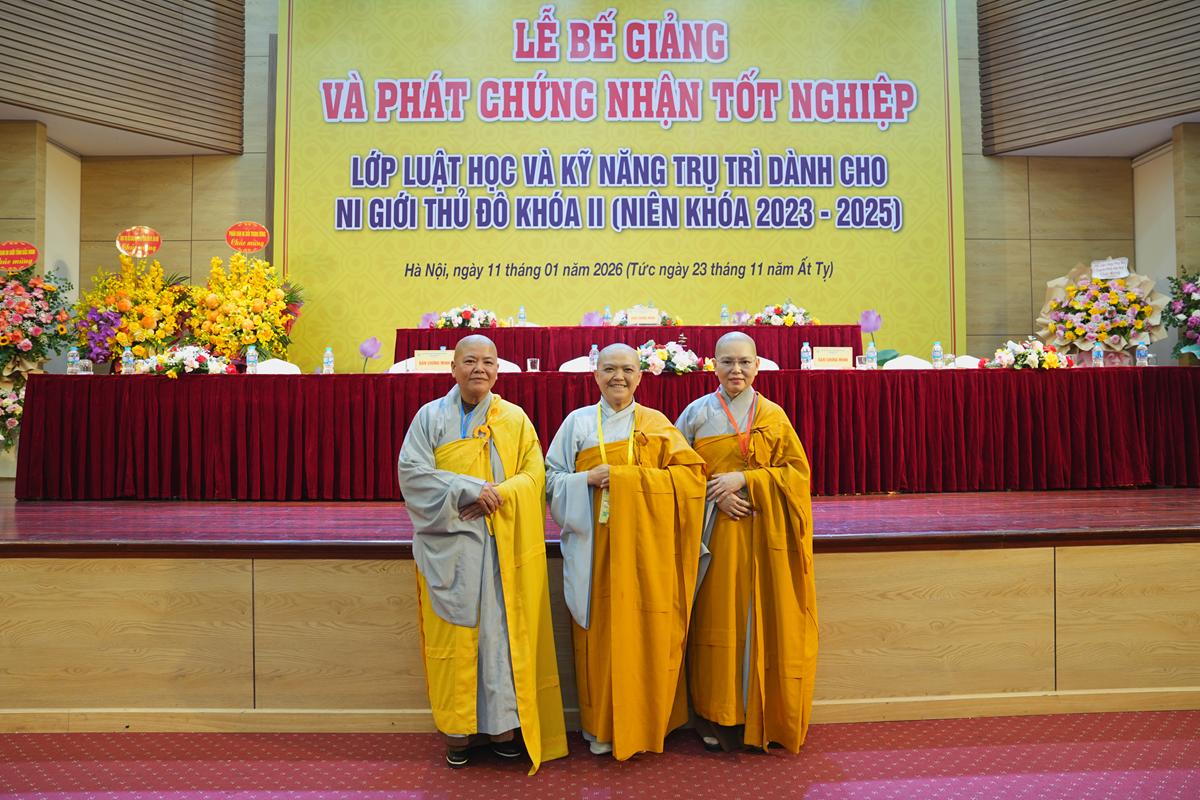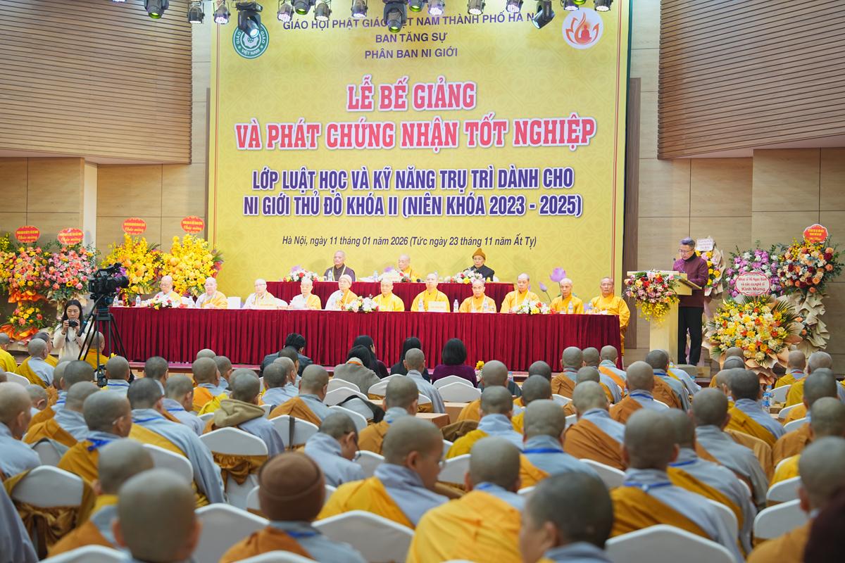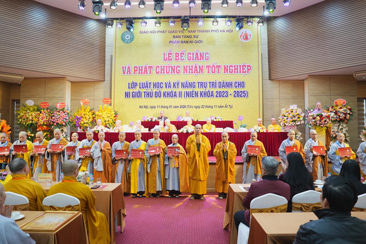 Sáng ngày 11/01/2026 (nhằm ngày 23/11 năm Ất Tỵ), tại Trung tâm Phụ nữ và Phát triển (phường Tây Hồ, TP. Hà Nội), Phân ban Ni giới GHPGVN TP. Hà Nội đã long trọng tổ chức Lễ bế giảng và trao chứng nhận tốt nghiệp Lớp Luật học và Kỹ năng trụ trì dành cho Ni giới Thủ đô khóa II (niên khóa 2023 – 2025). Buổi lễ diễn ra trong không khí trang nghiêm, ấm áp đạo tình, đánh dấu một chặng đường tu học đầy ý nghĩa của Ni giới Thủ đô trên nền tảng Giới luật Phật đà.