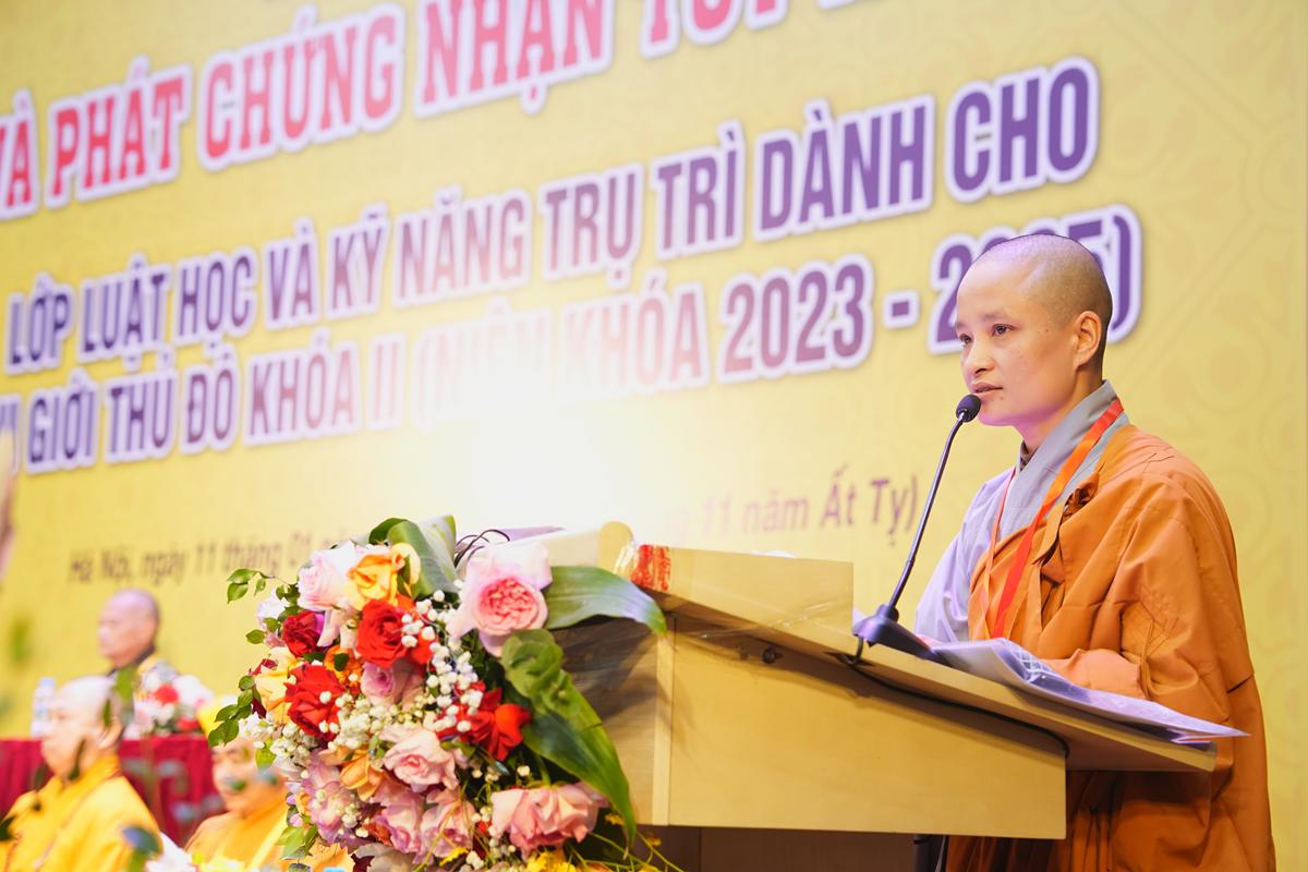 Đại diện Phân ban Ni giới Trung ương GHPGVN, Ni trưởng Thích Nữ Nhật Khương đã thành kính tri ân chư tôn đức giáo thọ sư, những bậc đã đem trọn tâm huyết, trí tuệ và kinh nghiệm để truyền trao Luật học cùng các kỹ năng thiết yếu trong công tác trụ trì cho chư Ni suốt ba năm qua. Đồng thời, Ni trưởng ghi nhận và tán thán tinh thần cầu học, tấn tu nghiêm túc của toàn thể chư Ni học viên trong suốt thời gian tham dự khóa học.