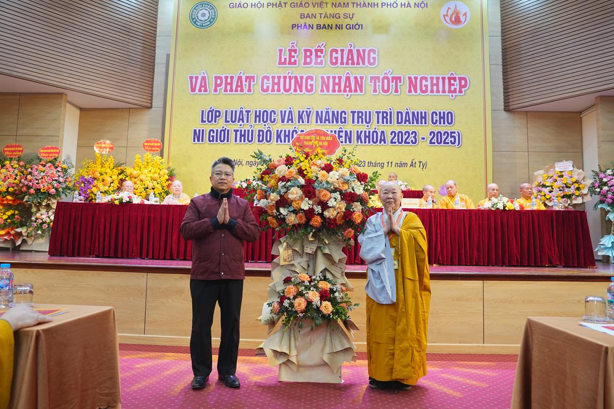 Phát biểu tại buổi lễ, Ông Phan Vũ – Phó Giám đốc Sở Dân tộc và Tôn giáo TP. Hà Nội bày tỏ niềm vui mừng khi được tham dự Lễ bế giảng và trao chứng chỉ tốt nghiệp Khóa Luật học – Kỹ năng trụ trì dành cho Ni giới khóa 2023–2025, do Phân ban Ni giới Phật giáo Hà Nội tổ chức; đồng thời nhấn mạnh:“Việc Phân ban Ni giới Phật giáo Hà Nội tổ chức khóa đào tạo Luật học và kỹ năng trụ trì cho Ni giới là hoạt động thiết thực, thể hiện tinh thần chủ động, trách nhiệm trong việc nâng cao nhận thức pháp luật, kỹ năng quản lý, điều hành cơ sở tôn giáo, góp phần bảo đảm hoạt động tôn giáo diễn ra ổn định, đúng quy định và phù hợp với yêu cầu thực tiễn.”