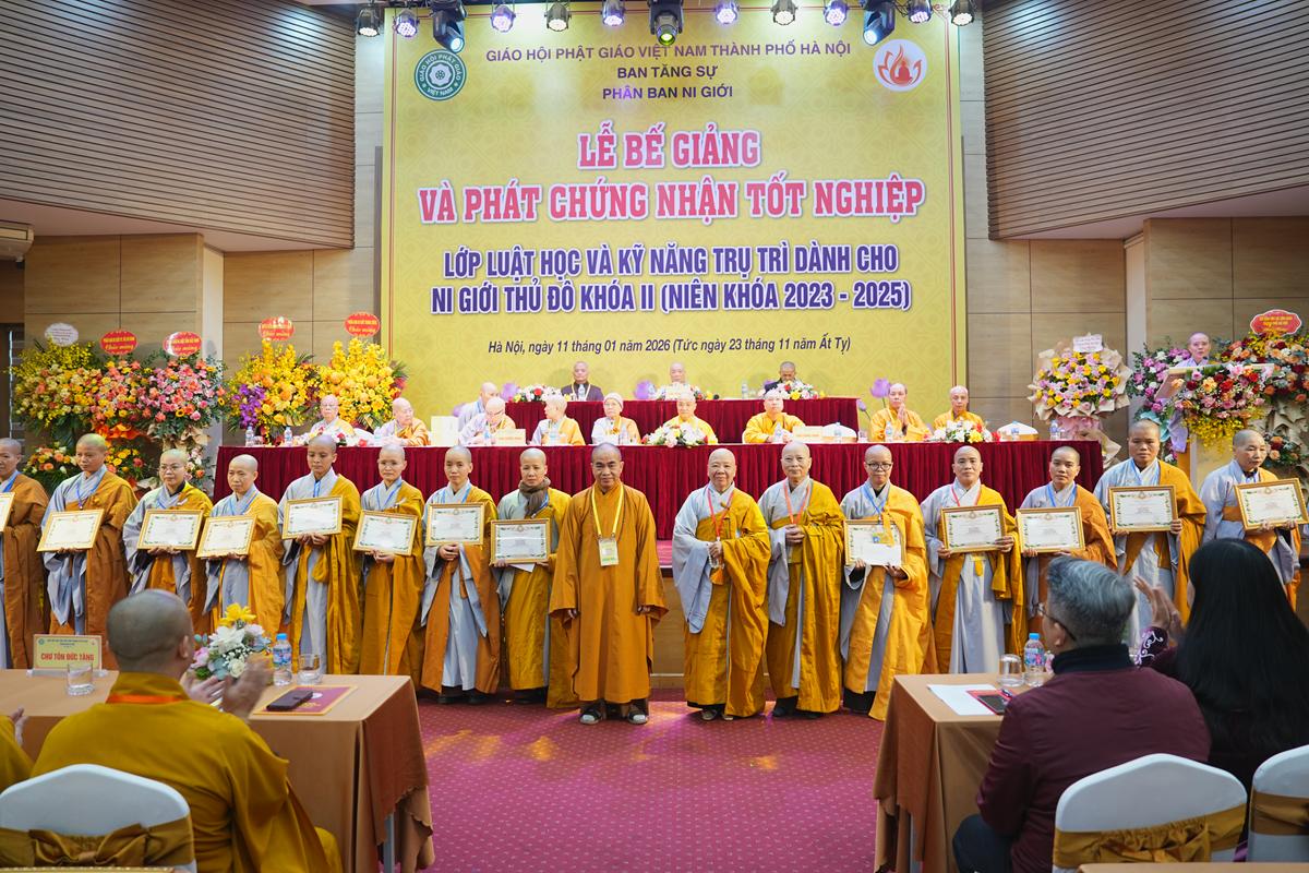 Sáng ngày 11/01/2026 (nhằm ngày 23/11 năm Ất Tỵ), tại Trung tâm Phụ nữ và Phát triển (phường Tây Hồ, TP. Hà Nội), Phân ban Ni giới GHPGVN TP. Hà Nội đã long trọng tổ chức Lễ bế giảng và trao chứng nhận tốt nghiệp Lớp Luật học và Kỹ năng trụ trì dành cho Ni giới Thủ đô khóa II (niên khóa 2023 – 2025). Buổi lễ diễn ra trong không khí trang nghiêm, ấm áp đạo tình, đánh dấu một chặng đường tu học đầy ý nghĩa của Ni giới Thủ đô trên nền tảng Giới luật Phật đà.