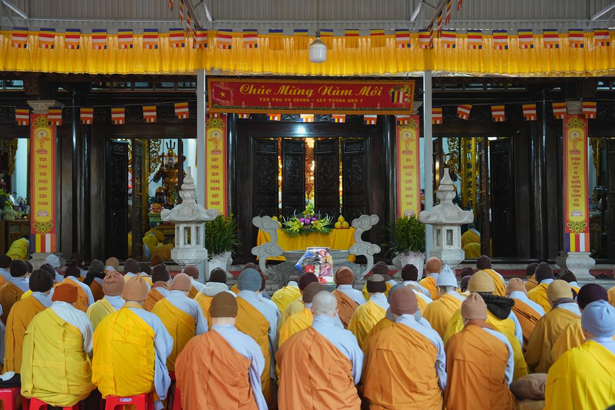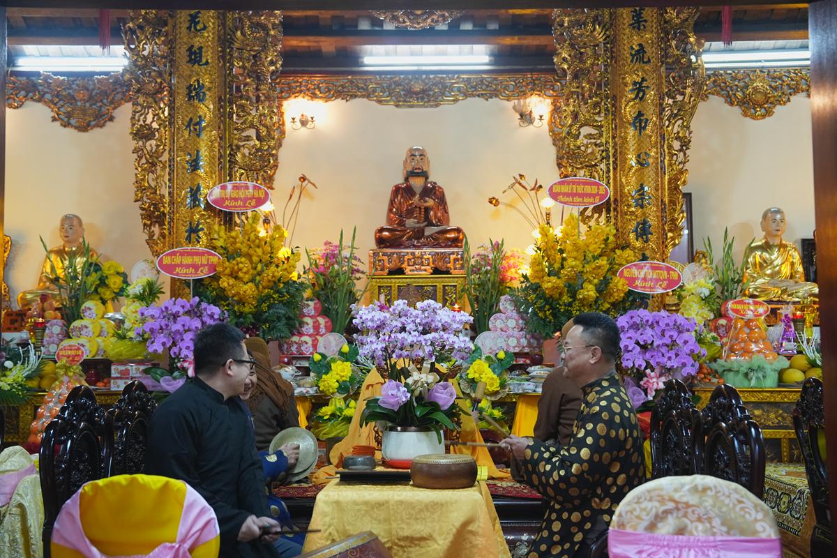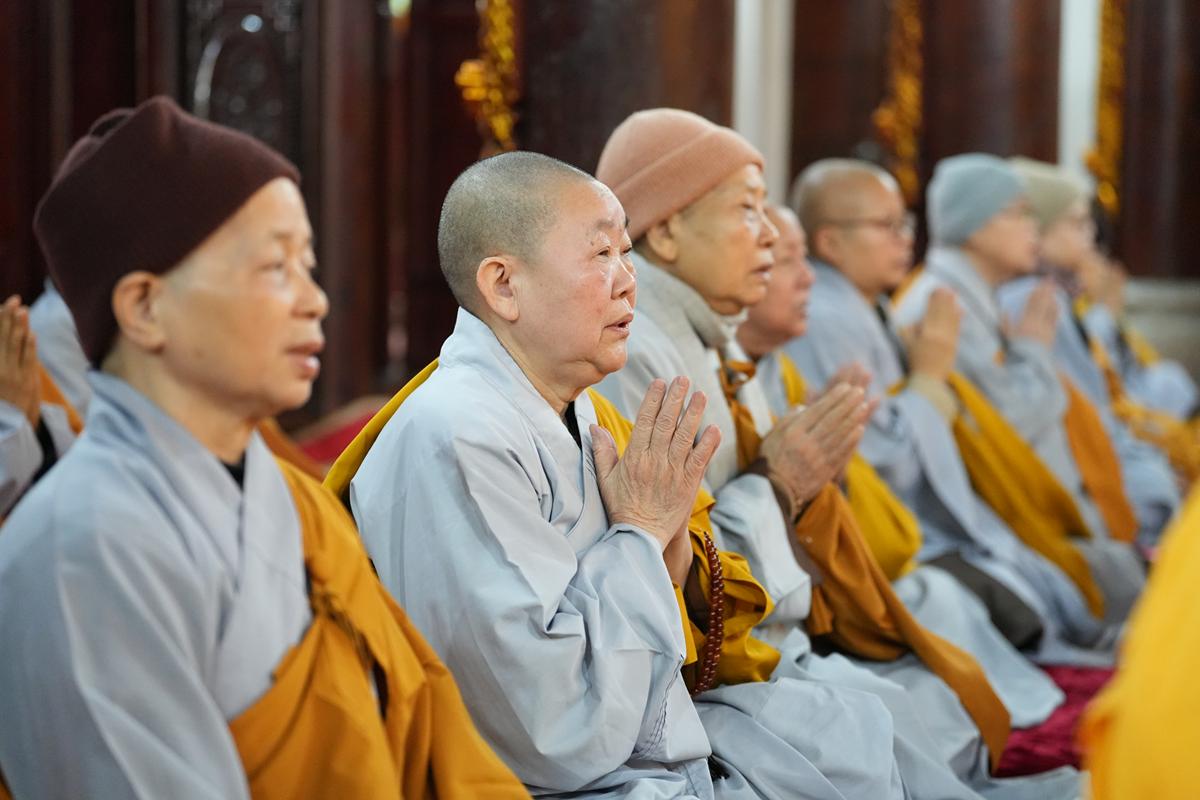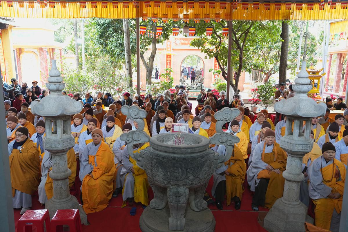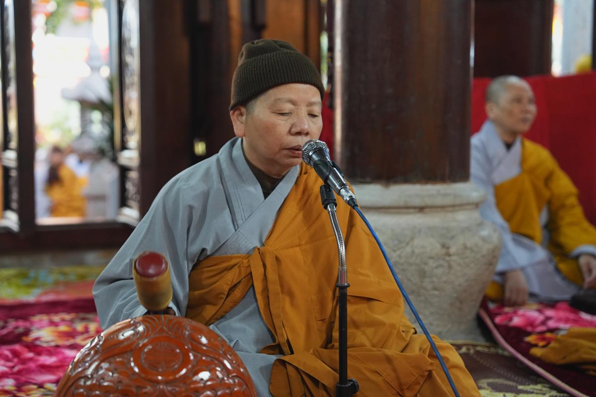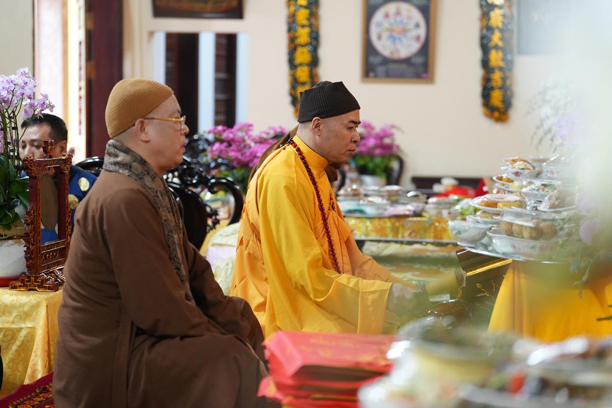 Tại chính điện và Tổ đường, chư Tôn đức đã trang nghiêm cử hành nghi thức cúng Phật và cúng Giác linh. Tiếp đó, chư Tôn đức Tăng Ni đã quang lâm Đại Hùng Bảo Điện, đồng tâm cử hành thời kinh A Di Đà, nhất tâm cầu nguyện cho Giác linh cố Ni trưởng cao đăng thượng phẩm, quả chứng vô sinh, sớm hồi quy Tịnh cảnh.