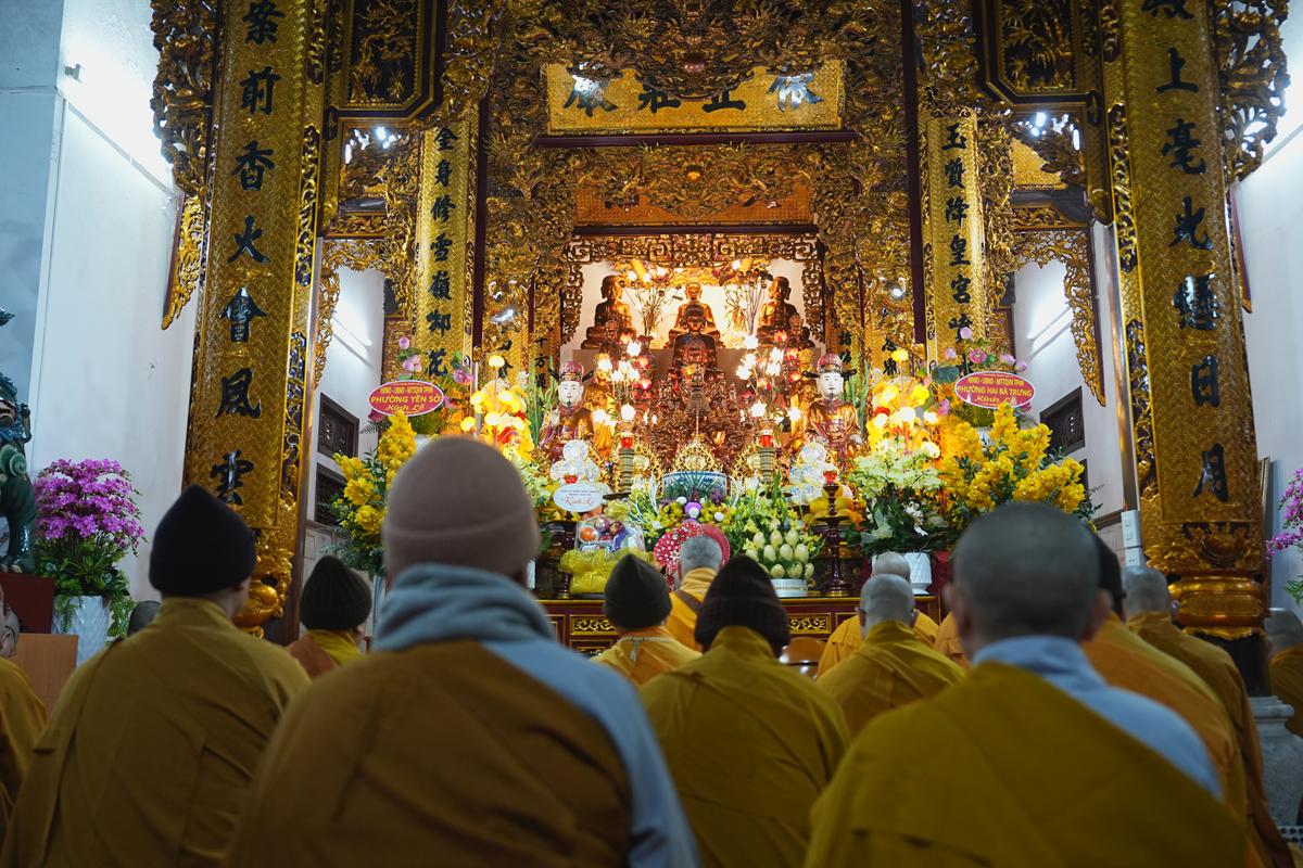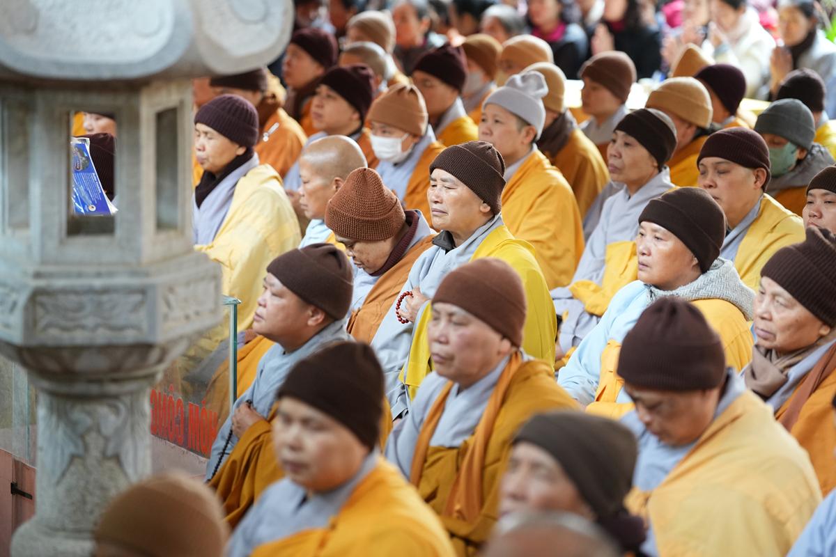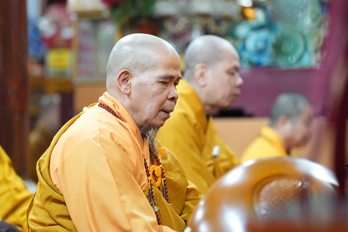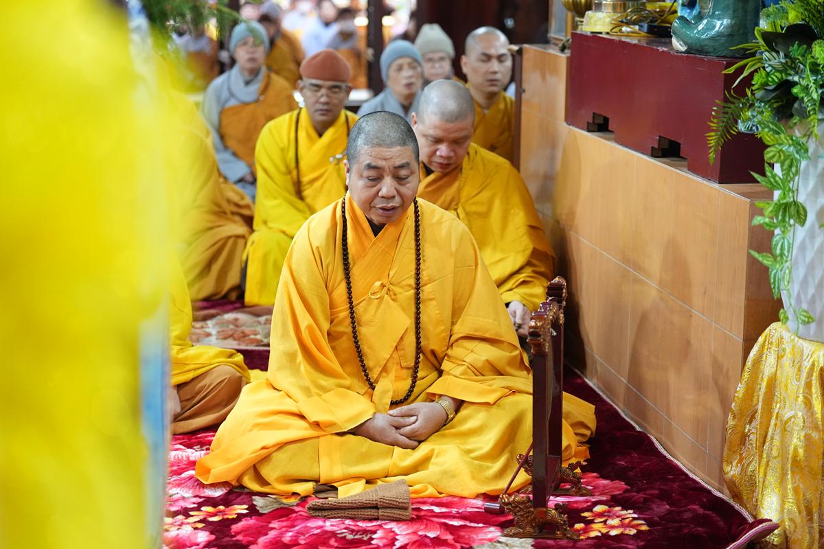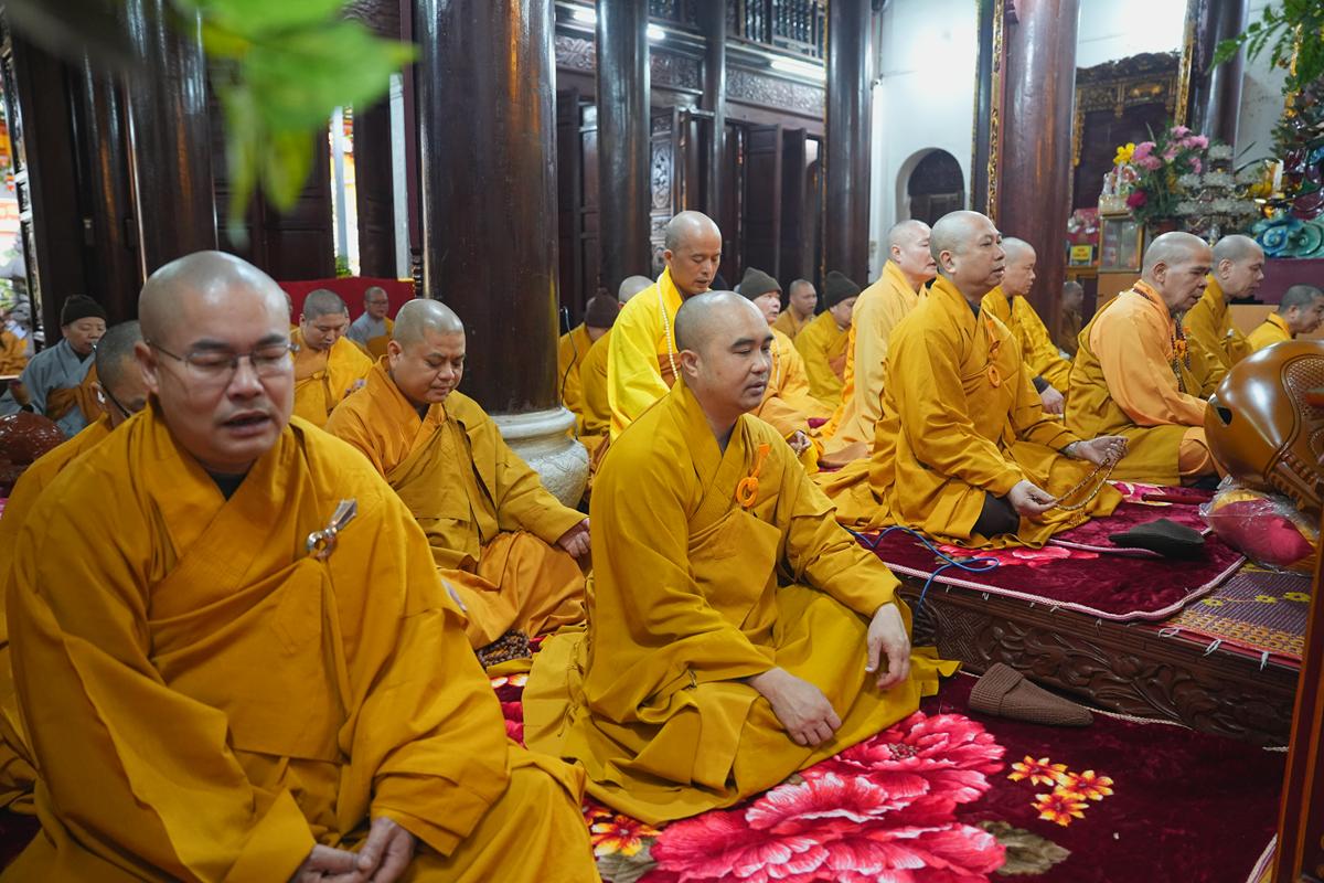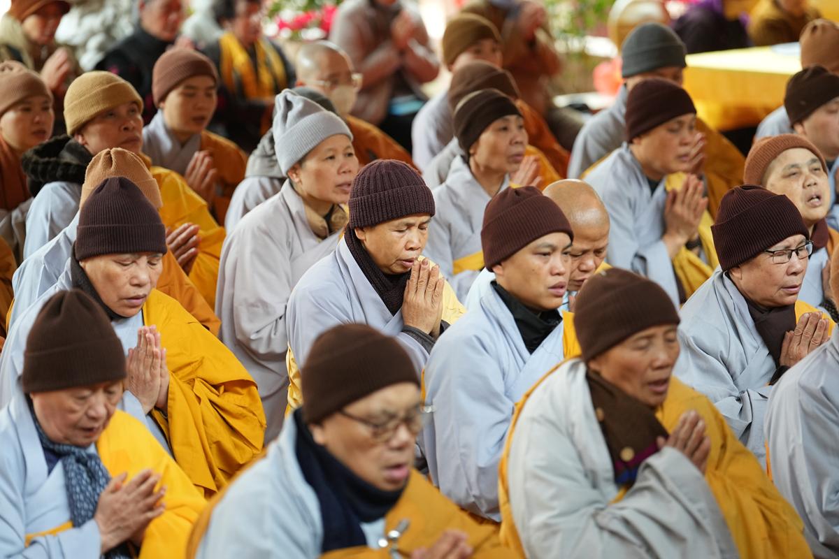 Tại chính điện và Tổ đường, chư Tôn đức đã trang nghiêm cử hành nghi thức cúng Phật và cúng Giác linh. Tiếp đó, chư Tôn đức Tăng Ni đã quang lâm Đại Hùng Bảo Điện, đồng tâm cử hành thời kinh A Di Đà, nhất tâm cầu nguyện cho Giác linh cố Ni trưởng cao đăng thượng phẩm, quả chứng vô sinh, sớm hồi quy Tịnh cảnh.