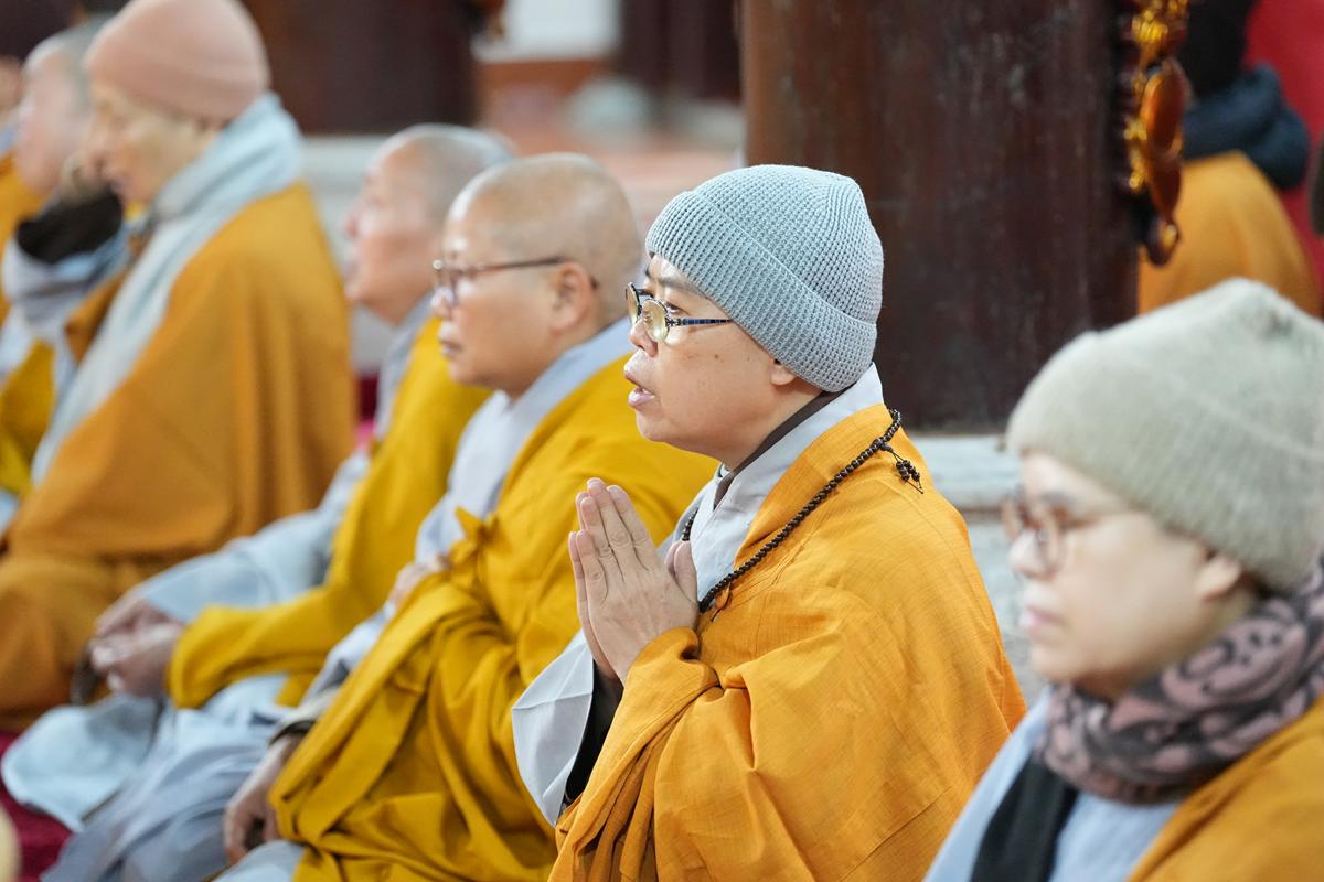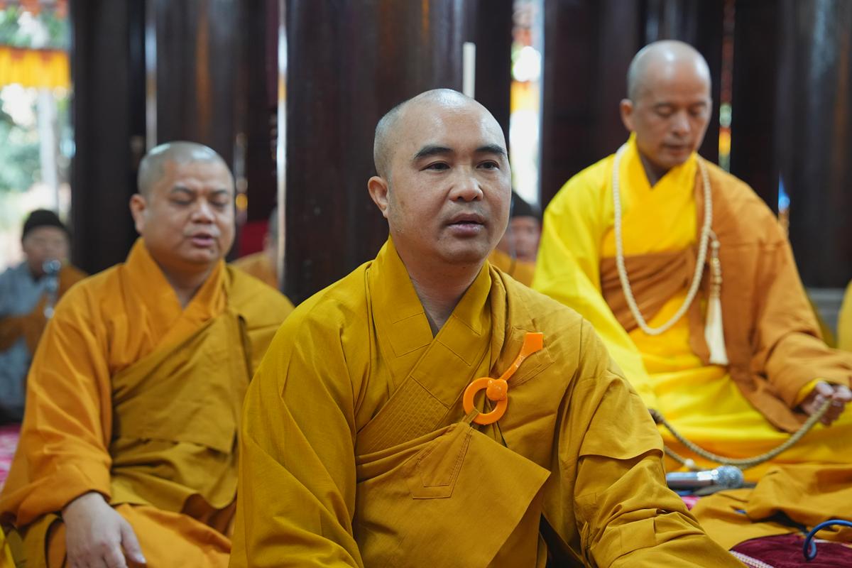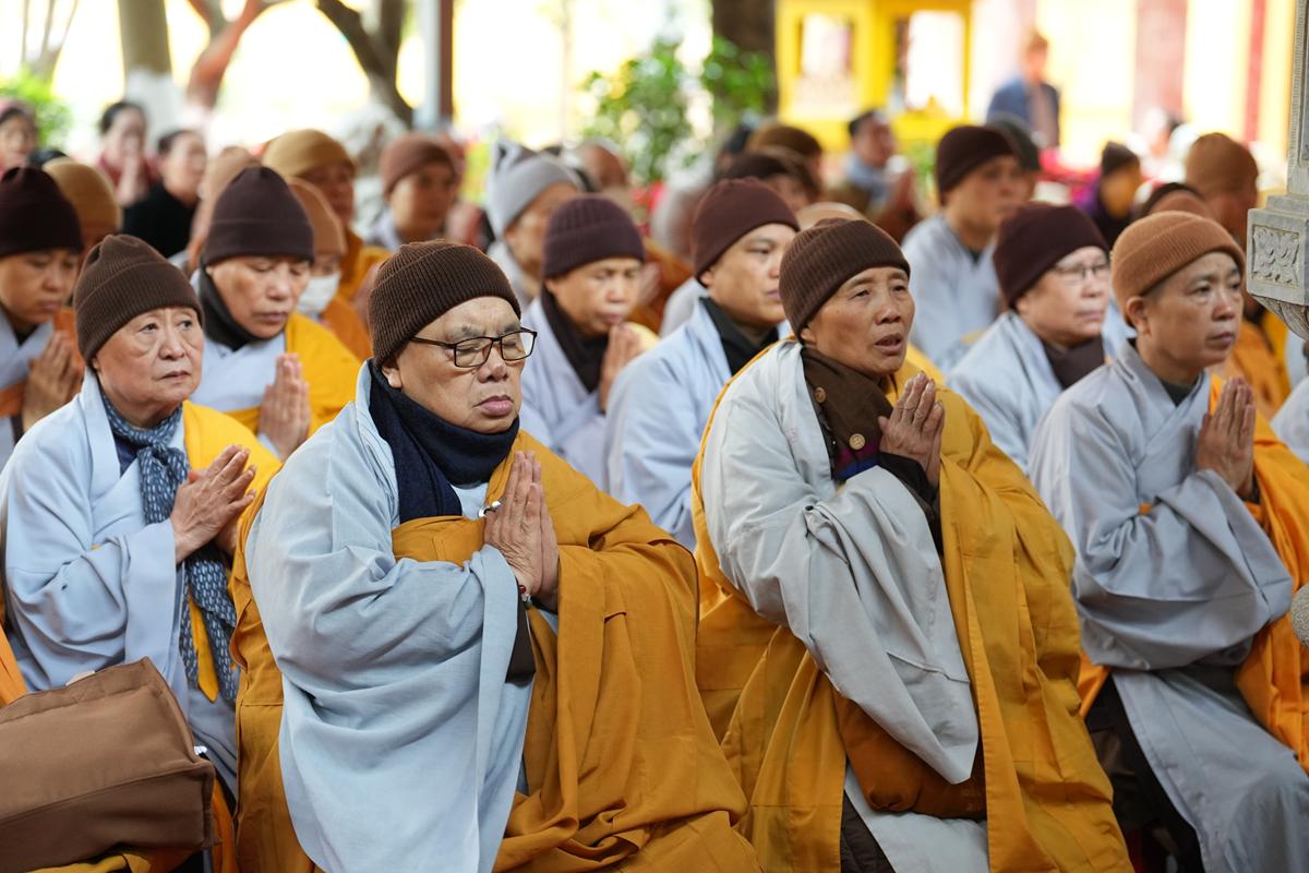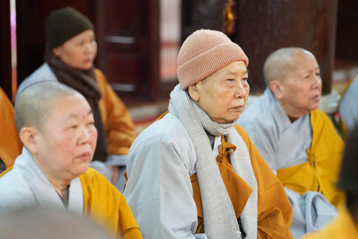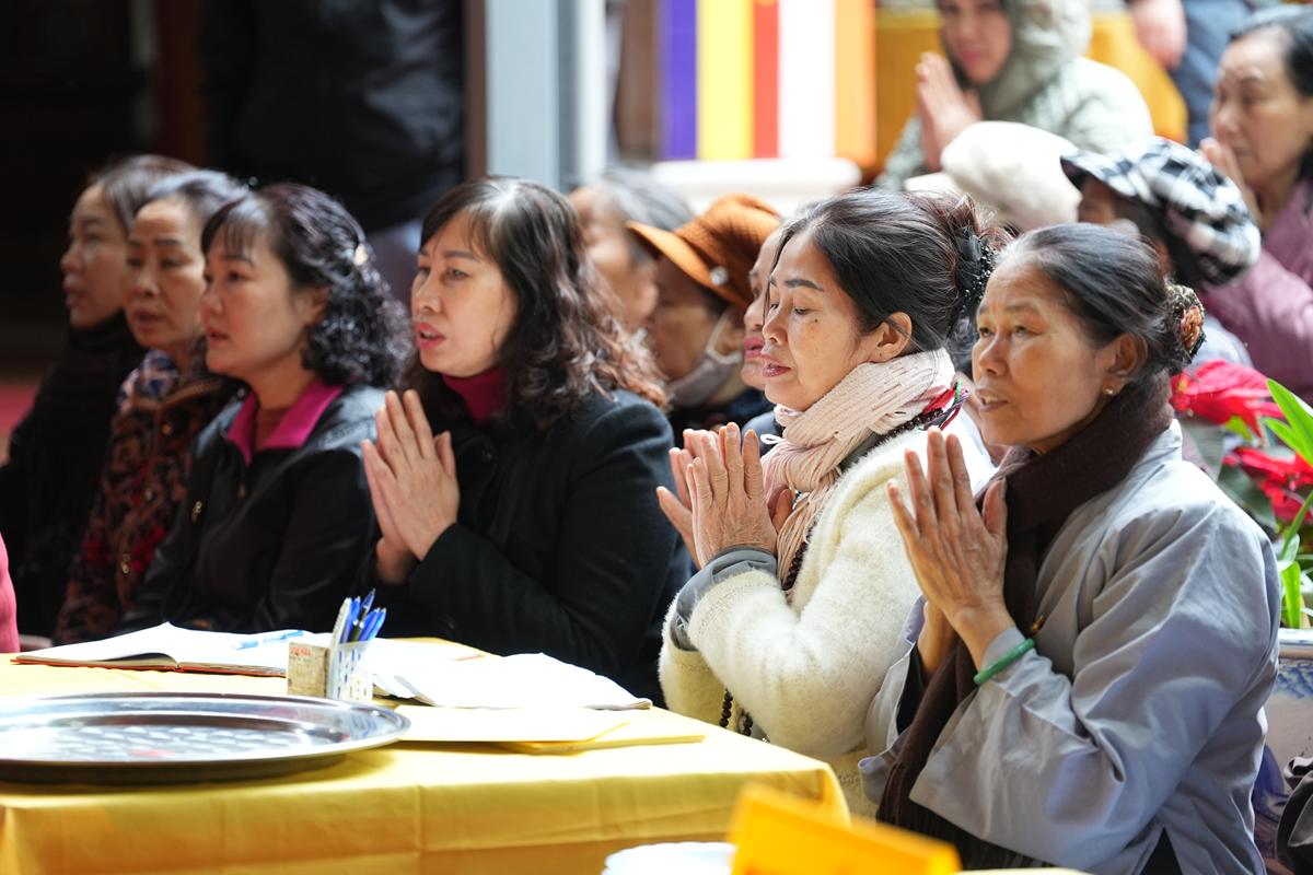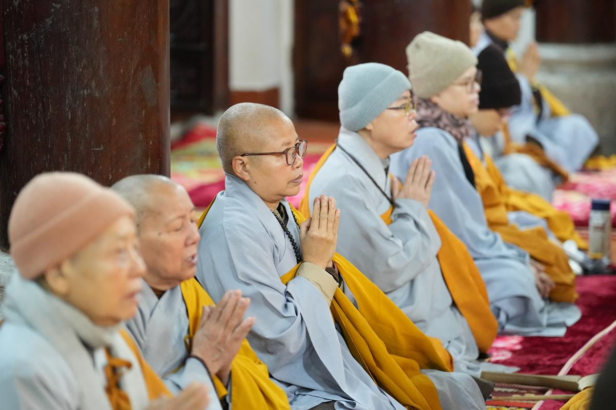 Tại chính điện và Tổ đường, chư Tôn đức đã trang nghiêm cử hành nghi thức cúng Phật và cúng Giác linh. Tiếp đó, chư Tôn đức Tăng Ni đã quang lâm Đại Hùng Bảo Điện, đồng tâm cử hành thời kinh A Di Đà, nhất tâm cầu nguyện cho Giác linh cố Ni trưởng cao đăng thượng phẩm, quả chứng vô sinh, sớm hồi quy Tịnh cảnh.
