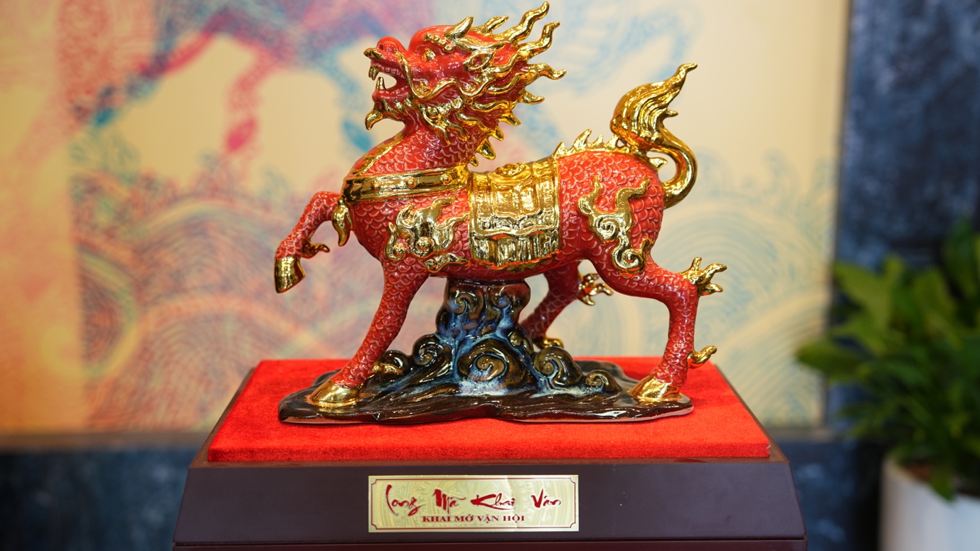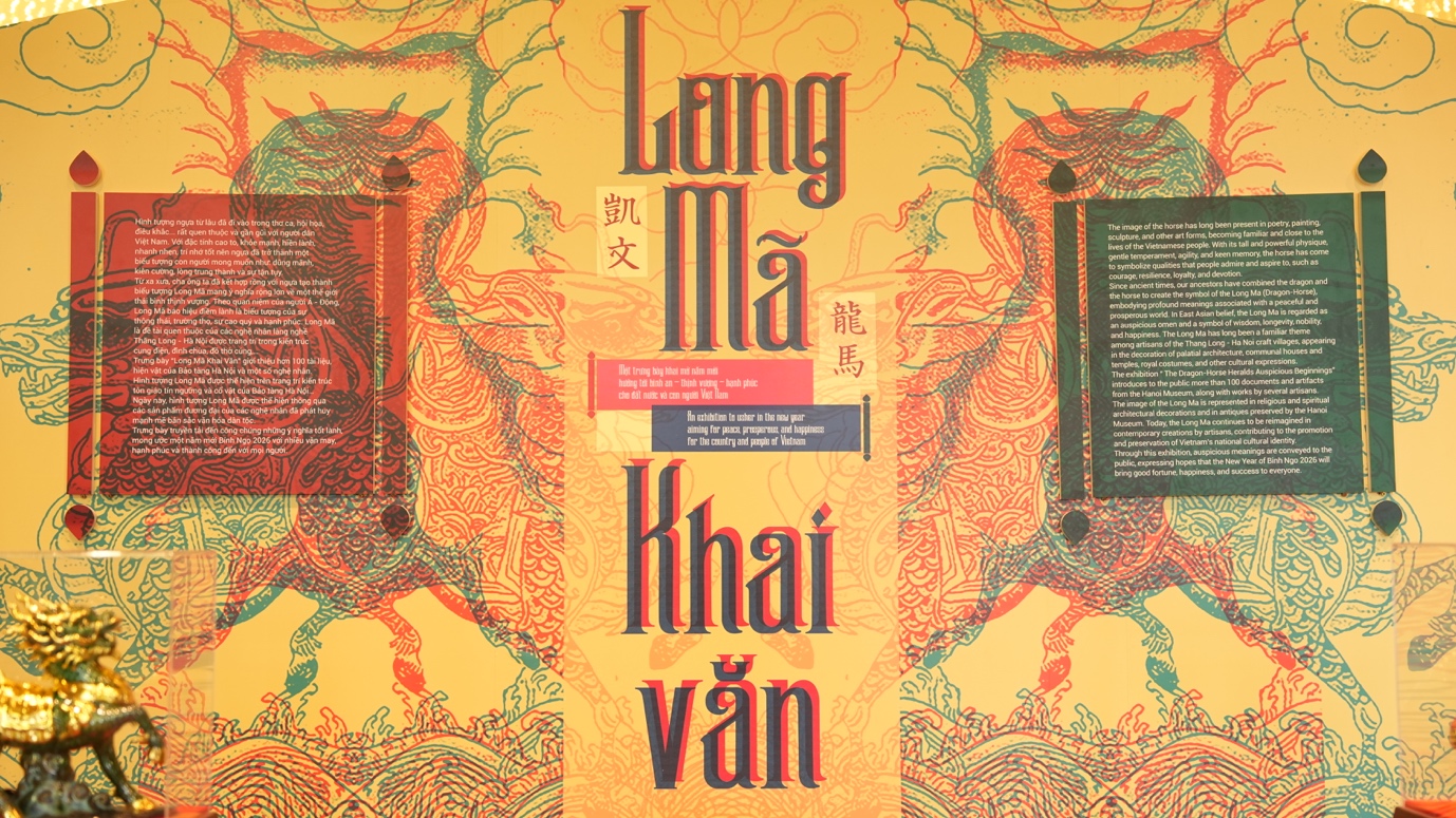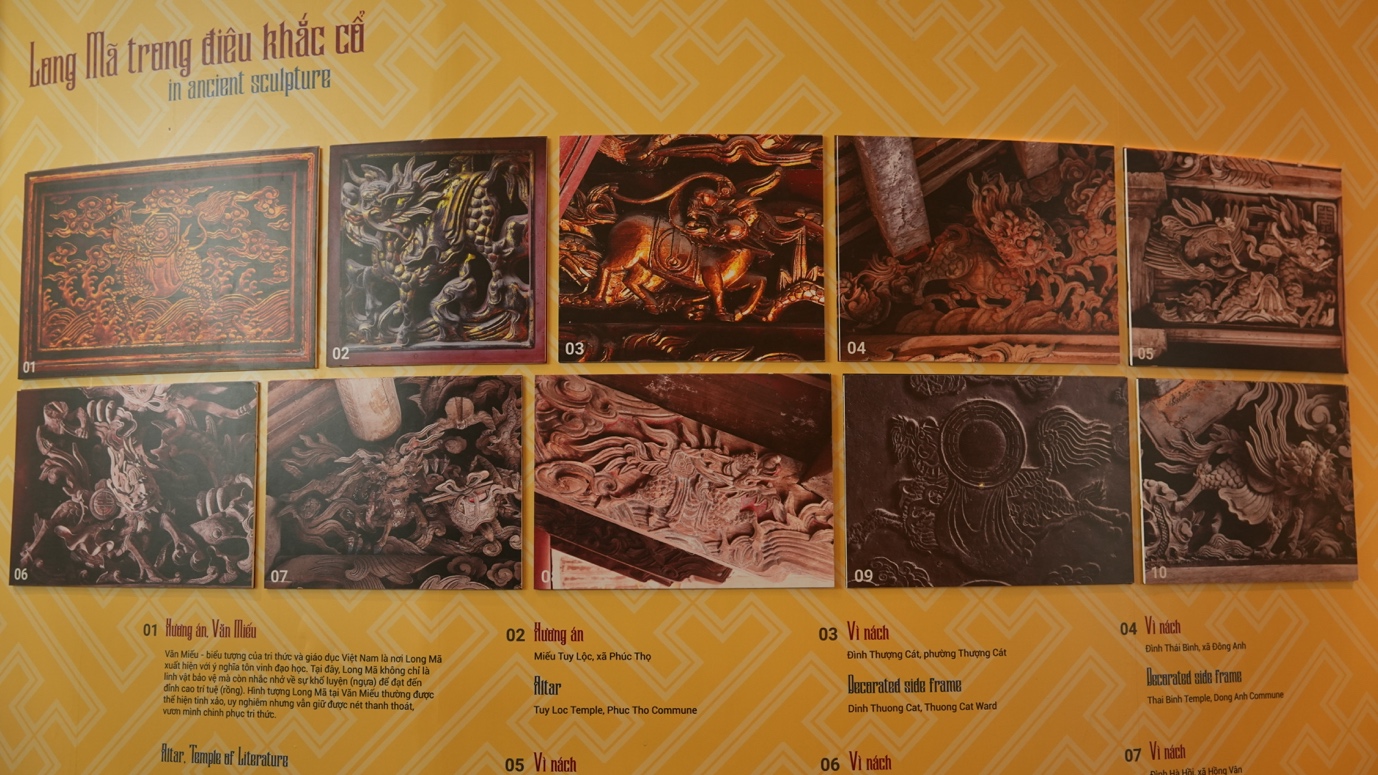 Trưng bày “Long Mã khai văn” giới thiệu hơn 100 tài liệu, hiện vật của Bảo tàng Hà Nội và các nghệ nhân nhằm bảo tồn các di sản văn hóa, phát huy mạnh mẽ bản sắc văn hóa dân tộc. Long Mã là linh vật có sự kết hợp giữa rồng và ngựa. Từ xa xưa, cha ông ta đã kết hợp rồng với ngựa tạo thành biểu tượng Long Mã mang ý nghĩa rộng lớn về một thế giới thái bình, thịnh vượng. Theo quan niệm của người Á – Đông, Long mã báo hiệu điềm lành, là biểu tượng của sự thông thái, trường thọ, sự cao quý và hạnh phúc. Long Mã cũng là đề tài quen thuộc của các nghệ nhân làng nghề Thăng Long – Hà Nội được trang trí trong kiến trúc cung điện, đình chùa, đồ thờ cúng.