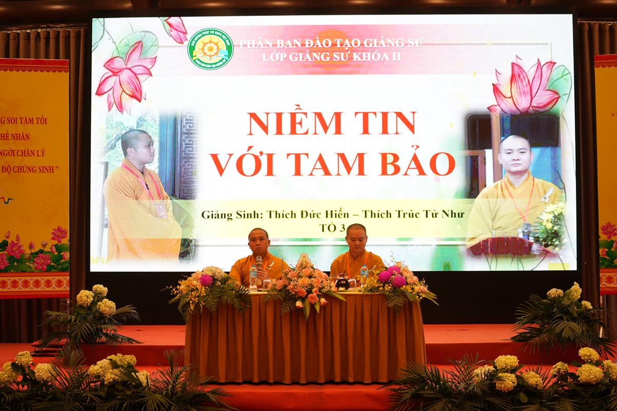 Ở tổ 3, Sư cô Thích Đàm Đĩnh và Sư cô Thích Nữ Phương Nguyên cùng giảng giải về “Ý nghĩa tụng kinh, niệm Phật”, là hai phương pháp tu tập hữu hiệu để thanh lọc tâm hồn, giảm trừ phiền não, góp phần mang lại đời sống an lạc và nội tâm vững chãi. Việc tụng kinh, niệm Phật không chỉ giúp tích lũy công đức và chuyển hóa nghiệp chướng, mà còn tạo điều kiện thuận duyên cho sự vãng sinh về cõi Tịnh độ. Tiếp nối chương trình là bài giảng với chủ đề “Niềm tin với Tam Bảo”, do Đại đức Thích Đức Hiến và Đại đức Thích Trúc Tử Như diễn giải. Trong bài giảng, hai vị giảng sinh đã chia sẻ sâu sắc về ý nghĩa và vai trò của Tam Bảo trong đời sống tu tập cũng như trong hành trình nuôi dưỡng niềm tin vững chắc của người Phật tử. Bằng ngôn ngữ giản dị, gần gũi nhưng đầy trí tuệ, bài giảng đã giúp đại chúng hiểu rõ hơn về giá trị của niềm tin chân chính, từ đó củng cố lòng hướng thiện và tinh tiến tu hành trong cuộc sống hằng ngày.