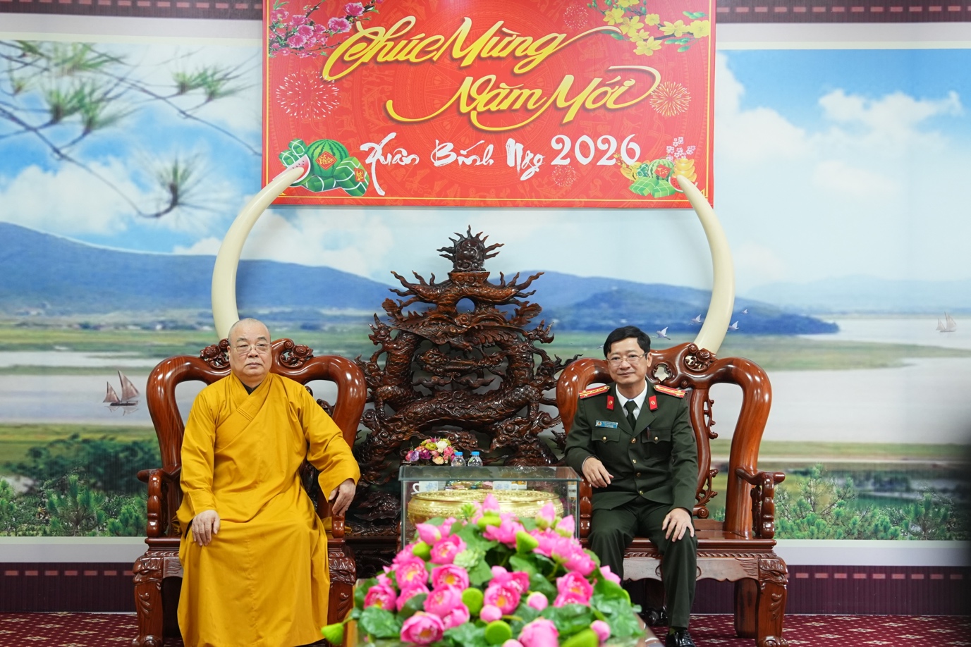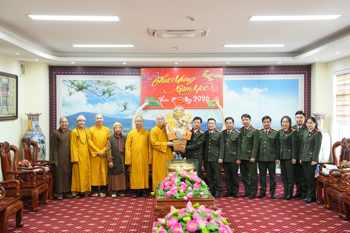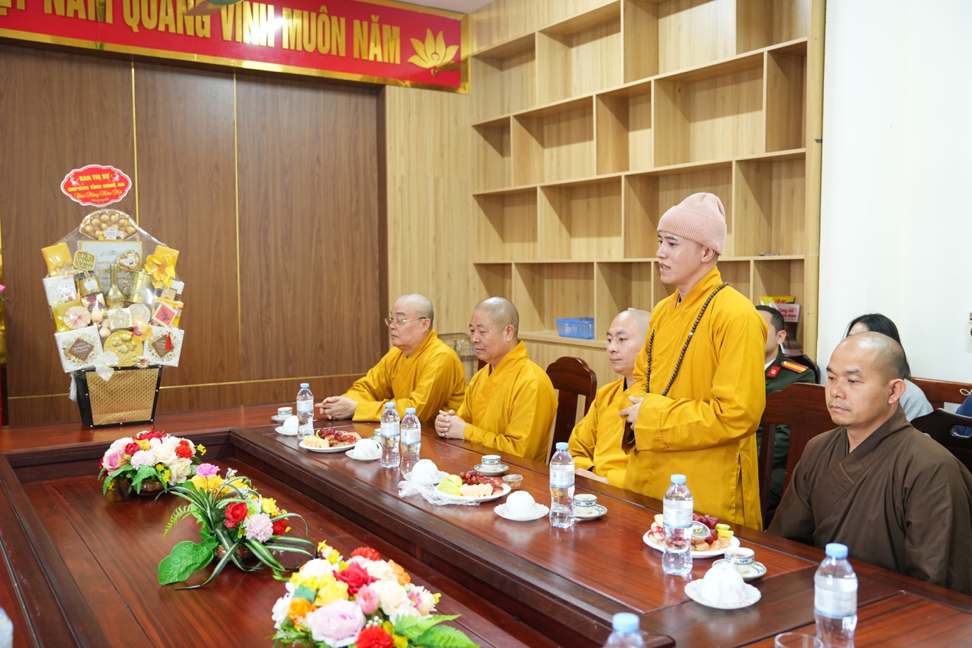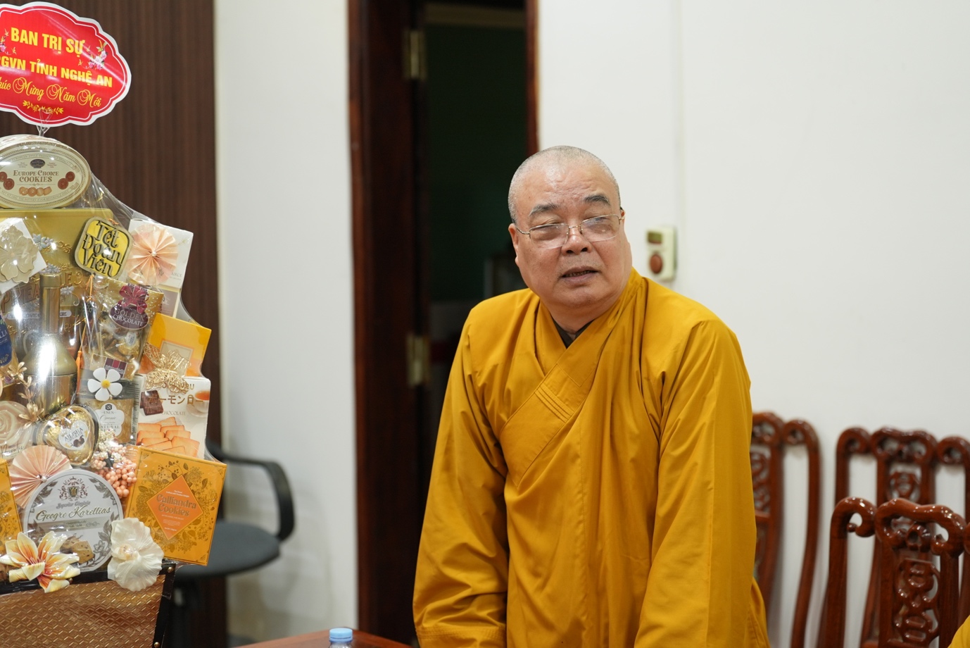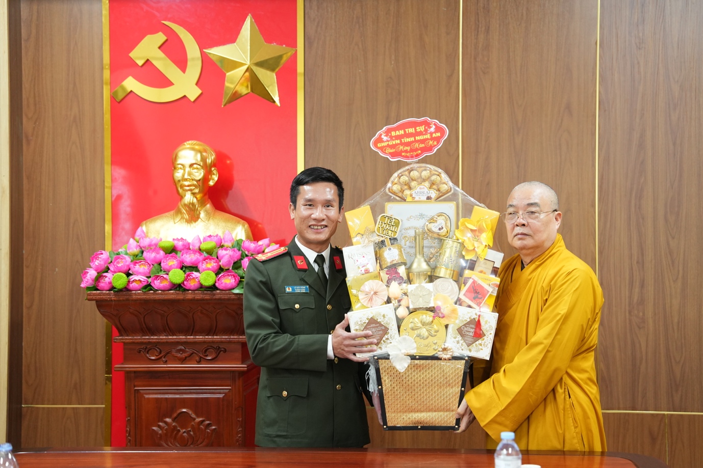 Trong không khí thân mật, Thượng tá Lê Đức Dũng – Trưởng Phòng An ninh nội địa, Công an tỉnh Nghệ An gửi lời chúc Xuân an lạc đến phái đoàn. Sự quan tâm của Phật giáo là nguồn động viên lớn với các cán bộ chiến sĩ công an để tiếp tục cống hiến vì sự nghiệp an ninh Tổ quốc. Trong nhiều năm qua, hai bên đã phối hợp chặt chẽ để xây dựng, phát triển GHPGVN tỉnh; và chư Tăng Ni, Phật tử trên địa bàn tỉnh đã đóng góp không nhỏ giữ gìn sự yên bình của địa phương. Thượng tá mong muốn Phòng An ninh nội địa và GHPGVN tỉnh tiếp tục phối hợp, chăm lo an sinh xã hội, an ninh trật tự cho nhân dân xứ Nghệ.