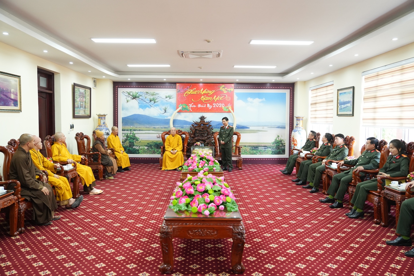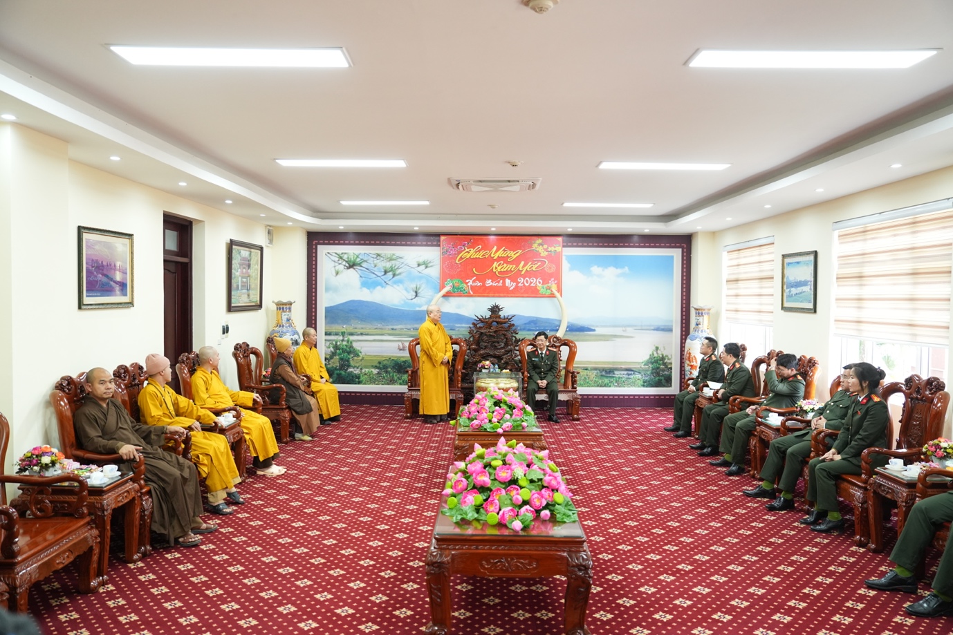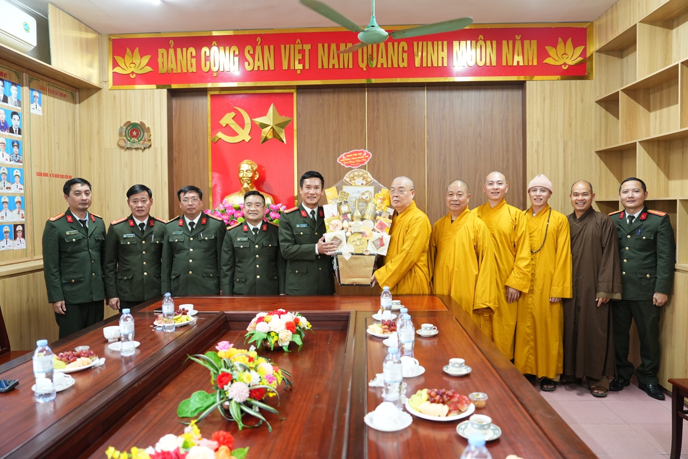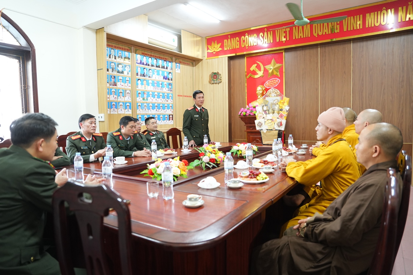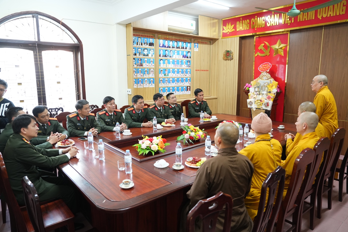 Tiếp đoàn, Đại tá Trần Ngọc Tuấn – Phó Giám đốc Công an tỉnh Nghệ An bày tỏ niềm vui mừng được đón nhận tình cảm của phái đoàn GHPGVN tỉnh. Đại tá gửi lời cảm ơn, lời chúc năm mới tốt đẹp nhất đến Trưởng lão Hòa thượng Thích Thanh Nhiễu cùng Tăng Ni, Phật tử Nghệ An. Năm 2025 có nhiều sự kiện lớn của đất nước như Lễ kỷ niệm 80 năm Cách mạng tháng Tám thành công và Quốc khánh nước Cộng hòa xã hội chủ nghĩa Việt Nam; Lễ kỷ niệm 50 năm Ngày Giải phóng miền Nam, thống nhất đất nước; sáp nhập các đơn vị hành chính địa phương;… Để đạt được thành tựu như ngày hôm nay là nhờ có sự nỗ lực của các cấp các ngành, trong đó có chư Tăng Ni, Phật tử. Đại tá đánh giá cao sự phối hợp, chung tay của GHPGVN tỉnh cũng như sự quan tâm của chư tôn đức lãnh đạo BTS tỉnh để hoàn thành mọi nhiệm vụ đề ra.