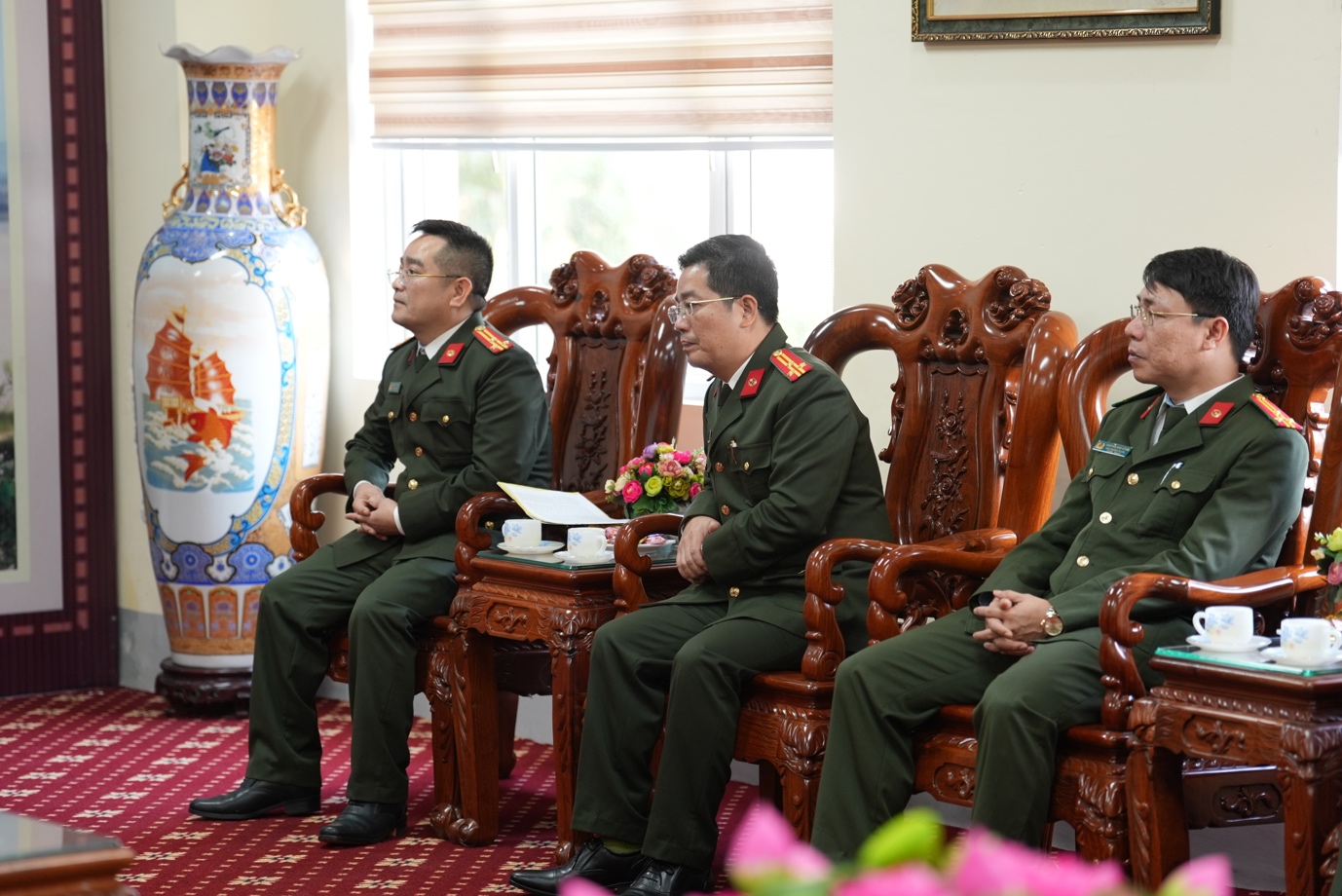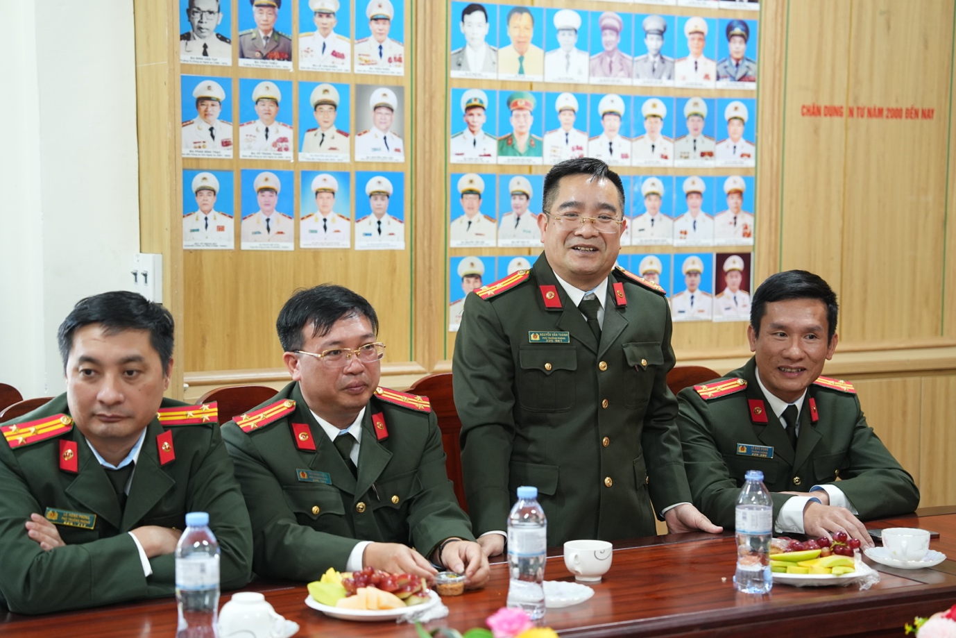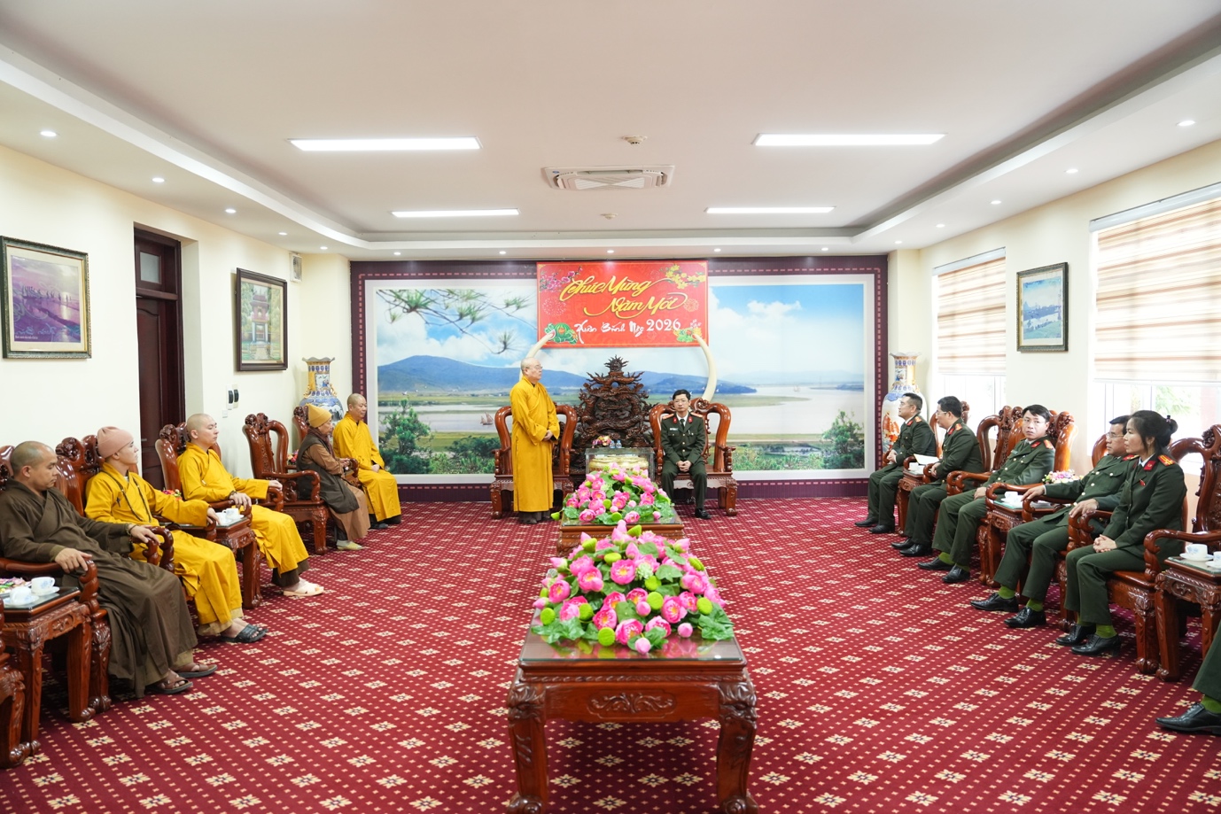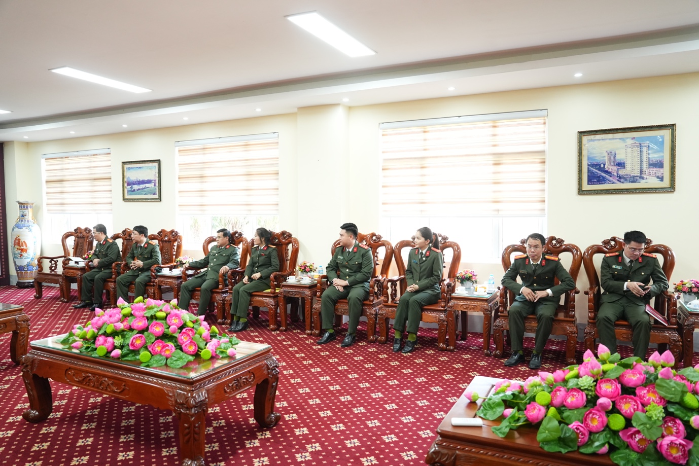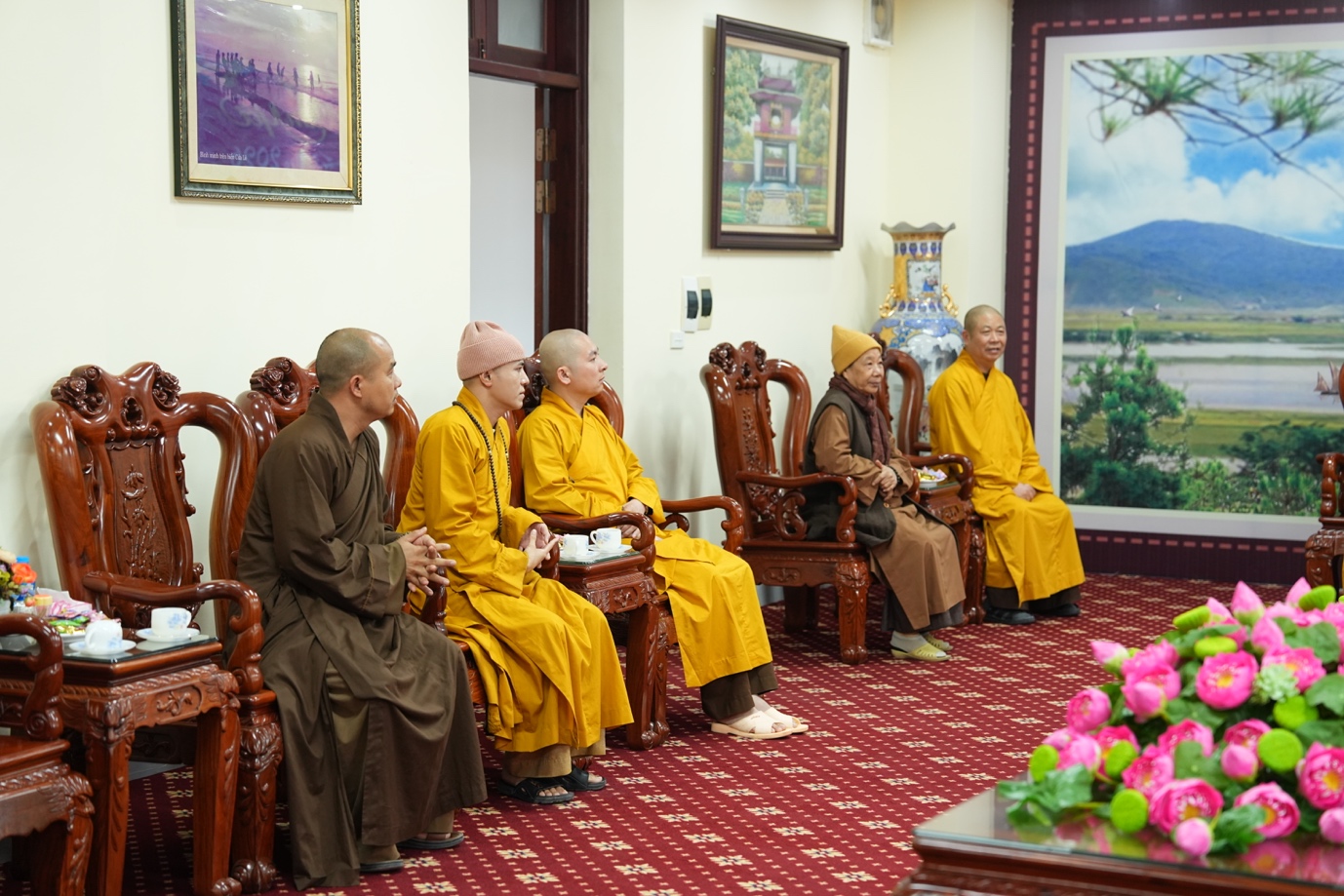 Tiếp đoàn, Đại tá Trần Ngọc Tuấn – Phó Giám đốc Công an tỉnh Nghệ An bày tỏ niềm vui mừng được đón nhận tình cảm của phái đoàn GHPGVN tỉnh. Đại tá gửi lời cảm ơn, lời chúc năm mới tốt đẹp nhất đến Trưởng lão Hòa thượng Thích Thanh Nhiễu cùng Tăng Ni, Phật tử Nghệ An. Năm 2025 có nhiều sự kiện lớn của đất nước như Lễ kỷ niệm 80 năm Cách mạng tháng Tám thành công và Quốc khánh nước Cộng hòa xã hội chủ nghĩa Việt Nam; Lễ kỷ niệm 50 năm Ngày Giải phóng miền Nam, thống nhất đất nước; sáp nhập các đơn vị hành chính địa phương;… Để đạt được thành tựu như ngày hôm nay là nhờ có sự nỗ lực của các cấp các ngành, trong đó có chư Tăng Ni, Phật tử. Đại tá đánh giá cao sự phối hợp, chung tay của GHPGVN tỉnh cũng như sự quan tâm của chư tôn đức lãnh đạo BTS tỉnh để hoàn thành mọi nhiệm vụ đề ra.