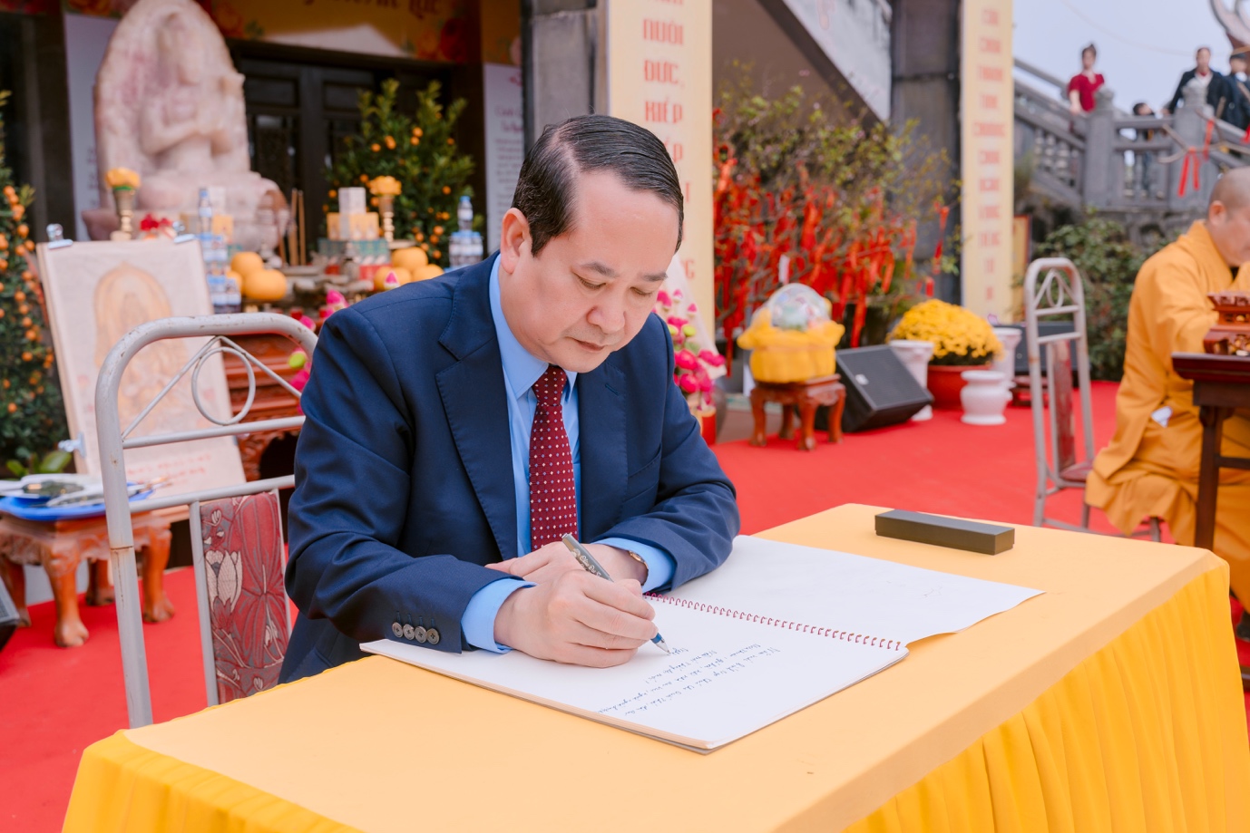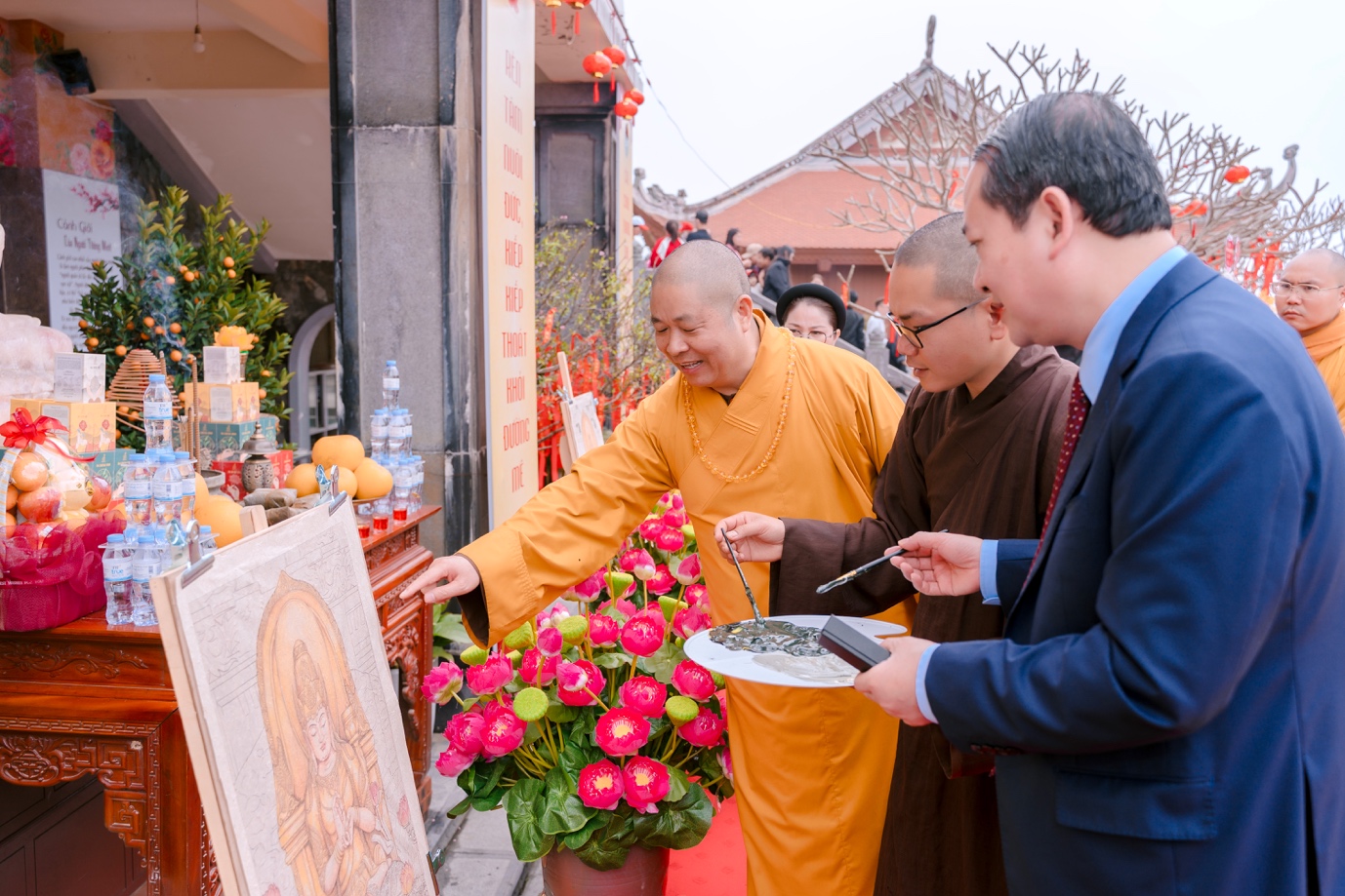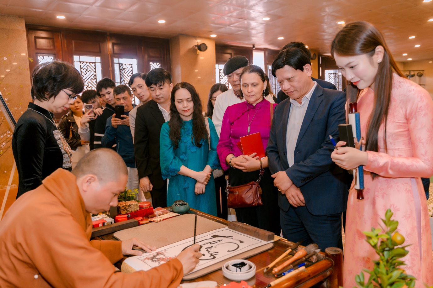 Ngay sau phần lễ, chư Tăng Ni và lãnh đạo tỉnh Nghệ An đã khai bút, khai ấn và tặng bút viết cho du khách thập phương. Ban Tổ chức cũng bố trí nhiều điểm viết chữ thư pháp để tặng du khách.