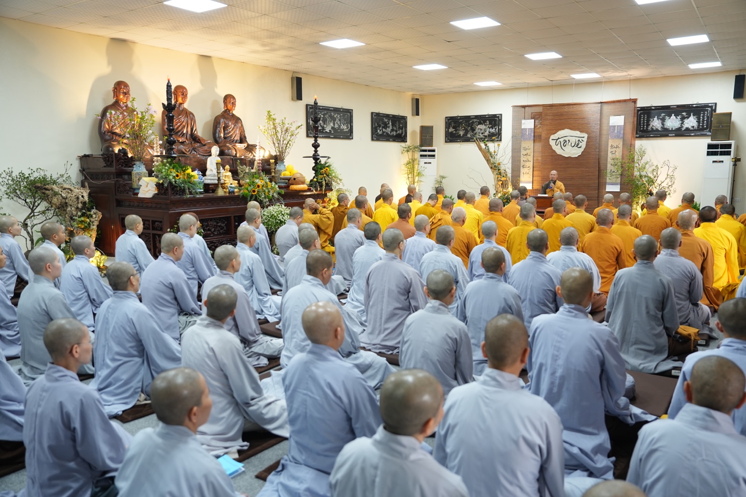Sau thời khóa thiền tọa, tụng kinh và thiền hành buổi sáng, tại thiền đường, đại chúng trang nghiêm lắng nghe thời pháp thoại của Thượng tọa Thích Pháp Từ về Phương pháp nuôi dưỡng năng lực chính niệm.
