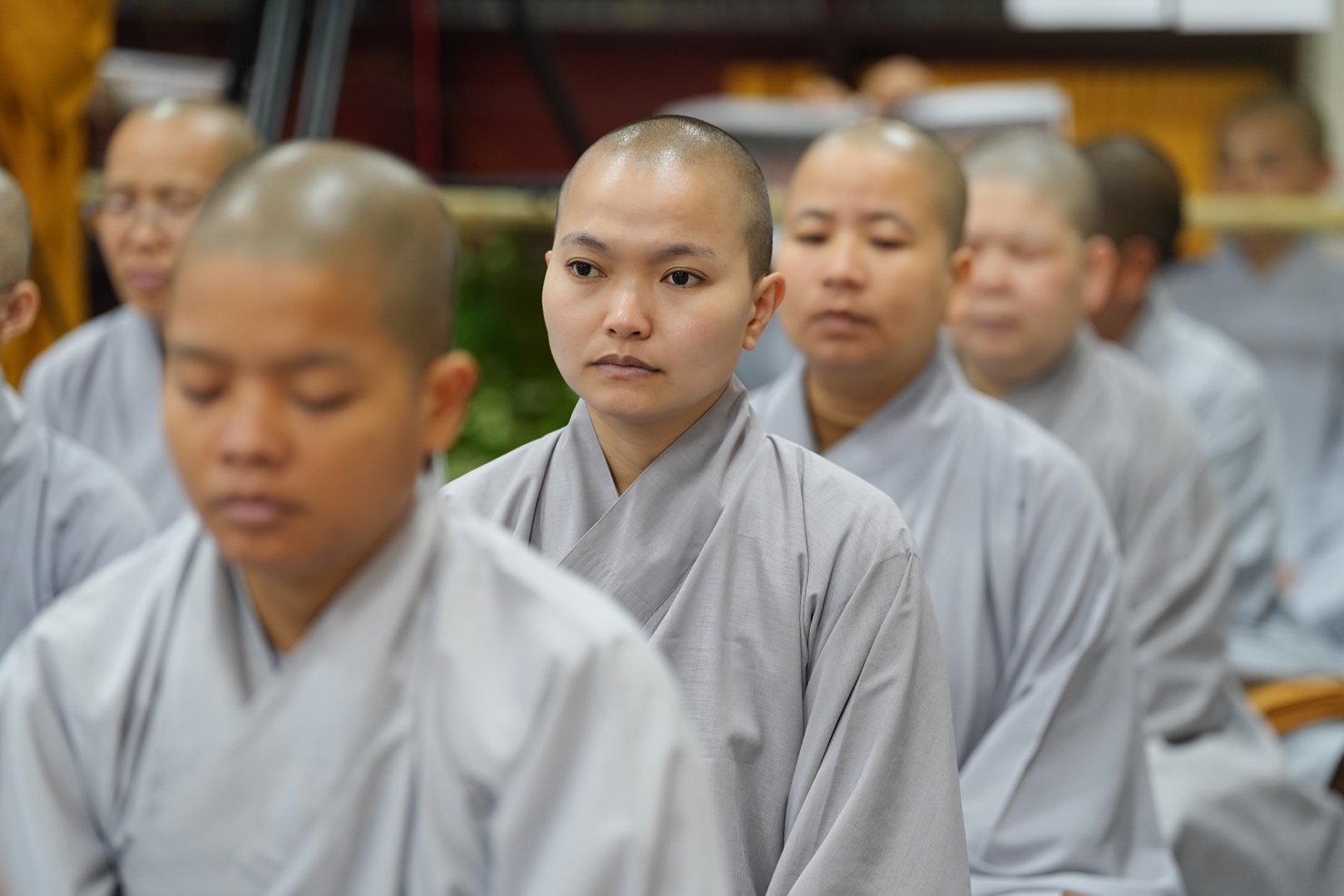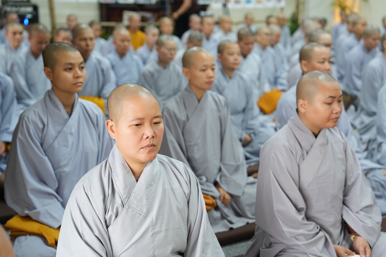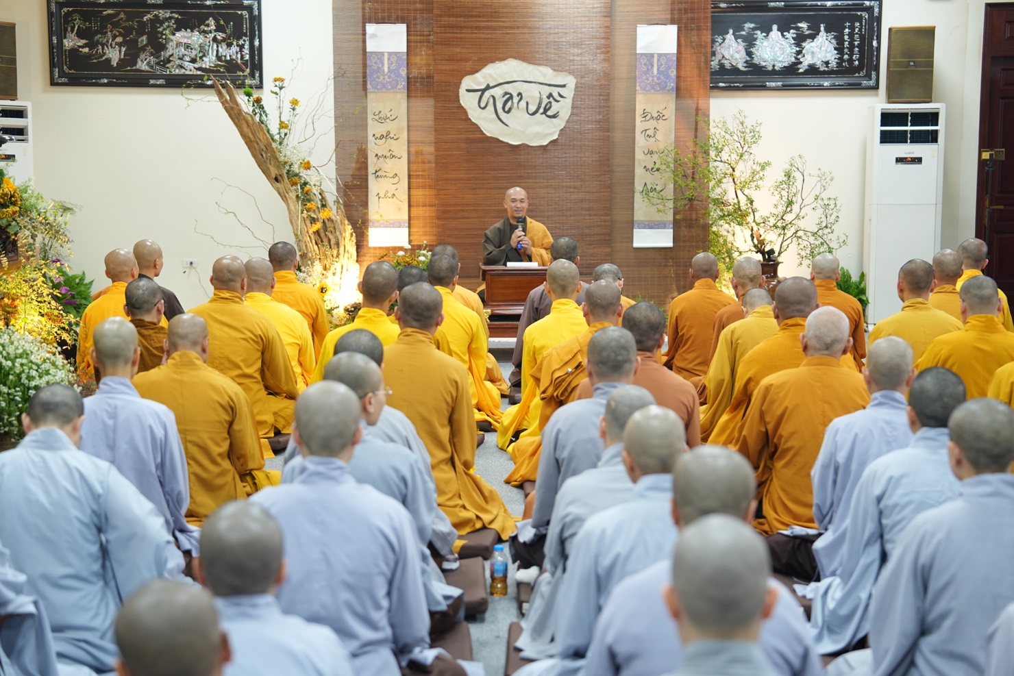 Sau thời khóa thiền tọa, tụng kinh và thiền hành buổi sáng, tại thiền đường, đại chúng trang nghiêm lắng nghe thời pháp thoại của Thượng tọa Thích Pháp Từ về Phương pháp nuôi dưỡng năng lực chính niệm.