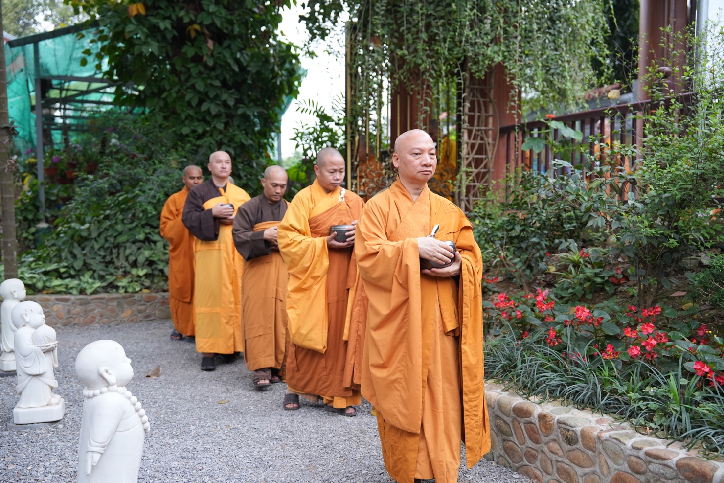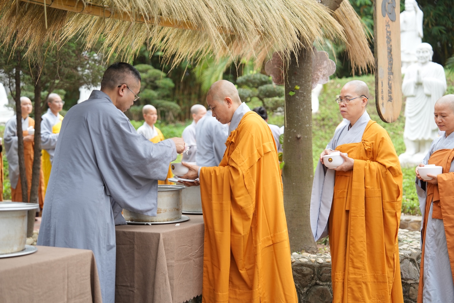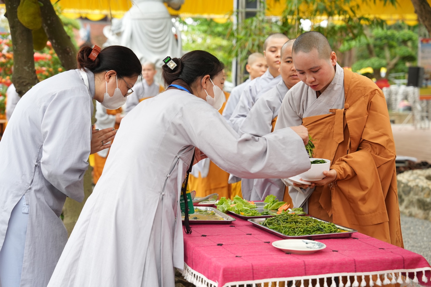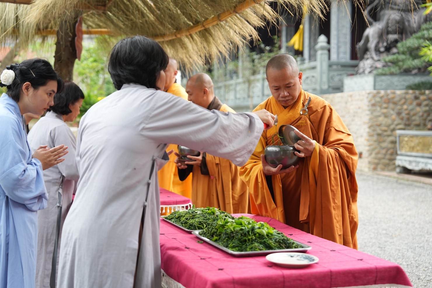 Trong khuôn khổ khóa tu, hình ảnh chư Tăng Ni thực hành hạnh khất thực trong bữa trưa nay đã trở thành điểm nhấn sâu sắc. Từng bước chân an lạc, từng chiếc bình bát nâng trong tay đã tái hiện sinh động hình ảnh của Đức Phật và Tăng đoàn thuở xưa. Đây không chỉ là nghi thức truyền thống, mà là pháp tu căn bản nuôi dưỡng tâm khiêm cung, buông bỏ ngã chấp.