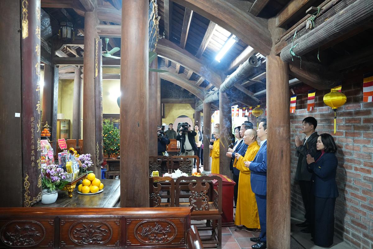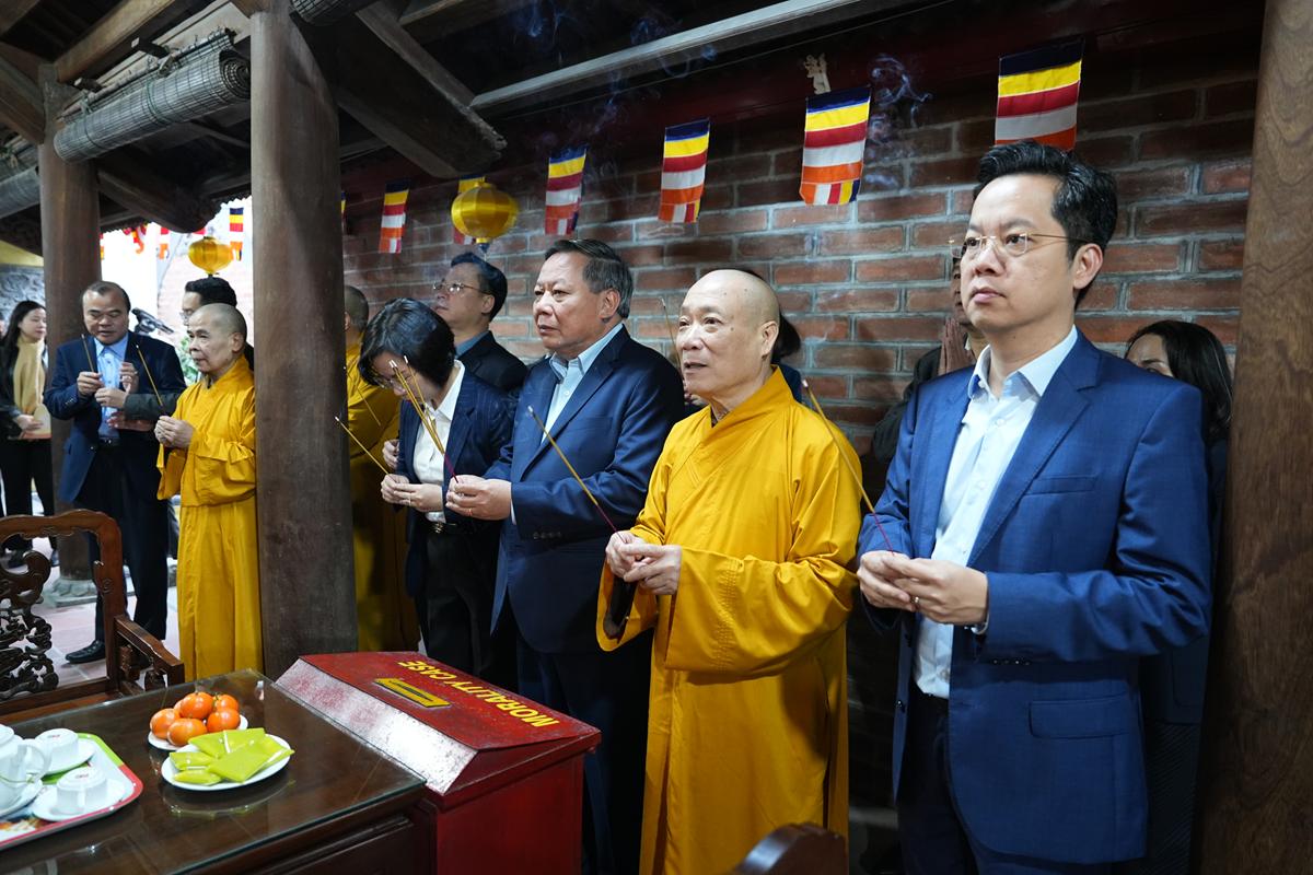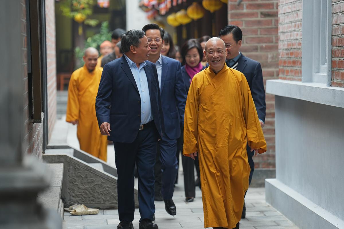 Hòa thượng Thích Bảo Nghiêm, Phó Chủ tịch Hội đồng Trị sự TW GHPGVN, Trưởng ban Trị sự GHPGVN thành phố Hà Nội cùng chư Tôn đức lãnh đạo BTS Phật giáo thành phố trân trọng tiếp đoàn.