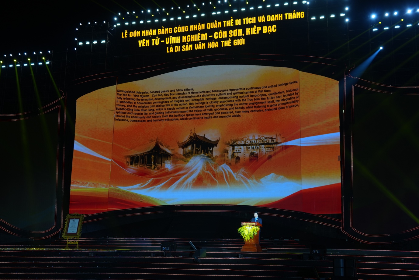 Tối ngày 20/12/2025, tại Quảng trường Minh Tâm (Khu di tích và danh thắng Yên Tử, Quảng Ninh) đã diễn ra lễ đón nhận bằng UNESCO ghi danh quần thể di tích và danh thắng Yên Tử – Vĩnh Nghiêm – Côn Sơn, Kiếp Bạc là Di sản văn hóa thế giới. Đây là một không gian văn hóa, lịch sử, tâm linh gắn với thiền phái Phật giáo Trúc Lâm do Phật hoàng Trần Nhân Tông sáng lập, mang tinh thần nhập thế sâu sắc, dung hợp Phật giáo với văn hóa dân tộc.