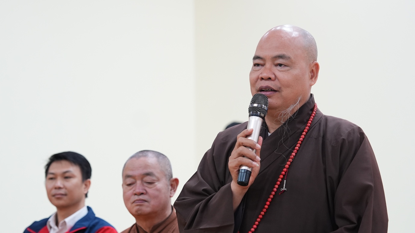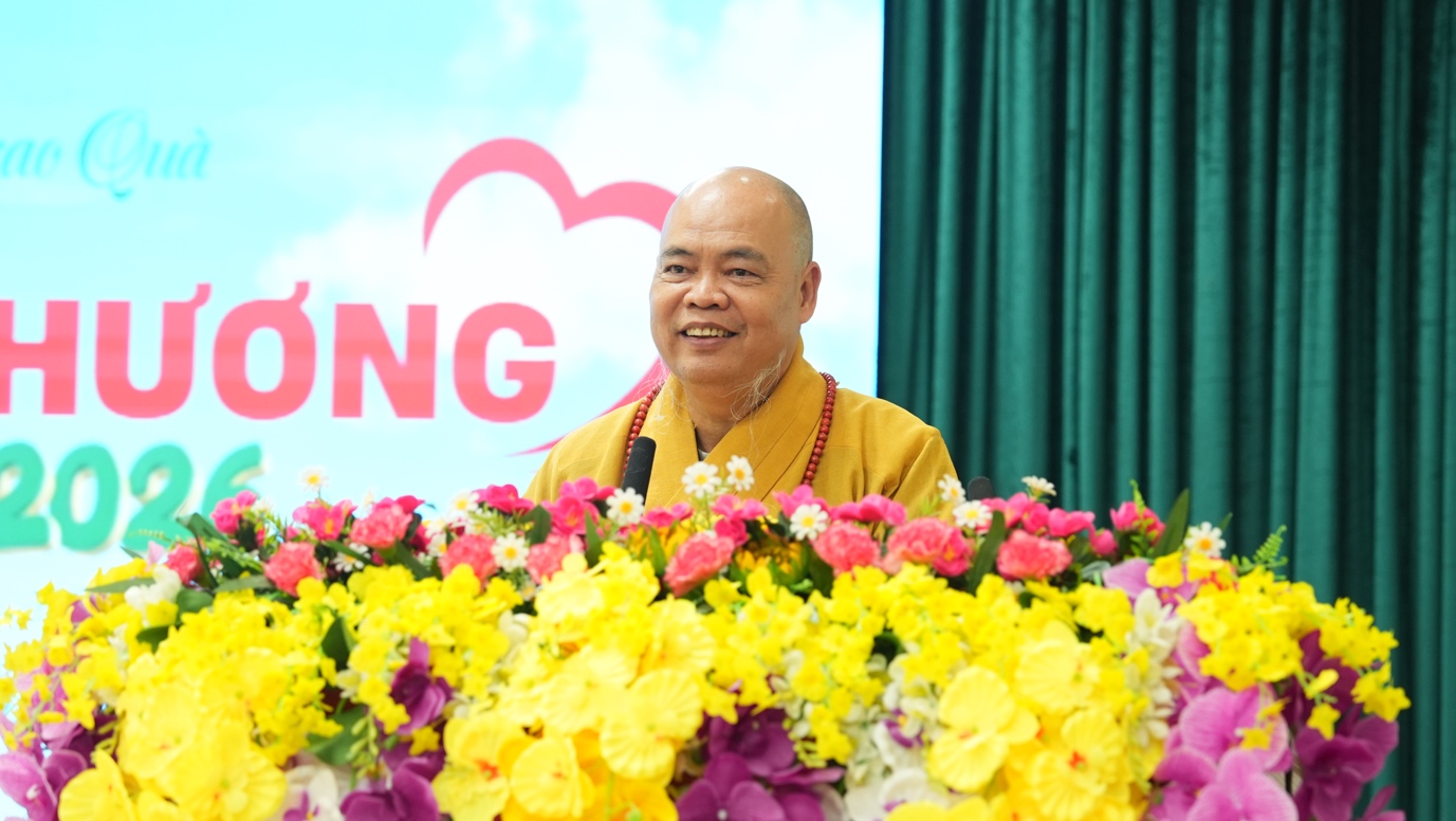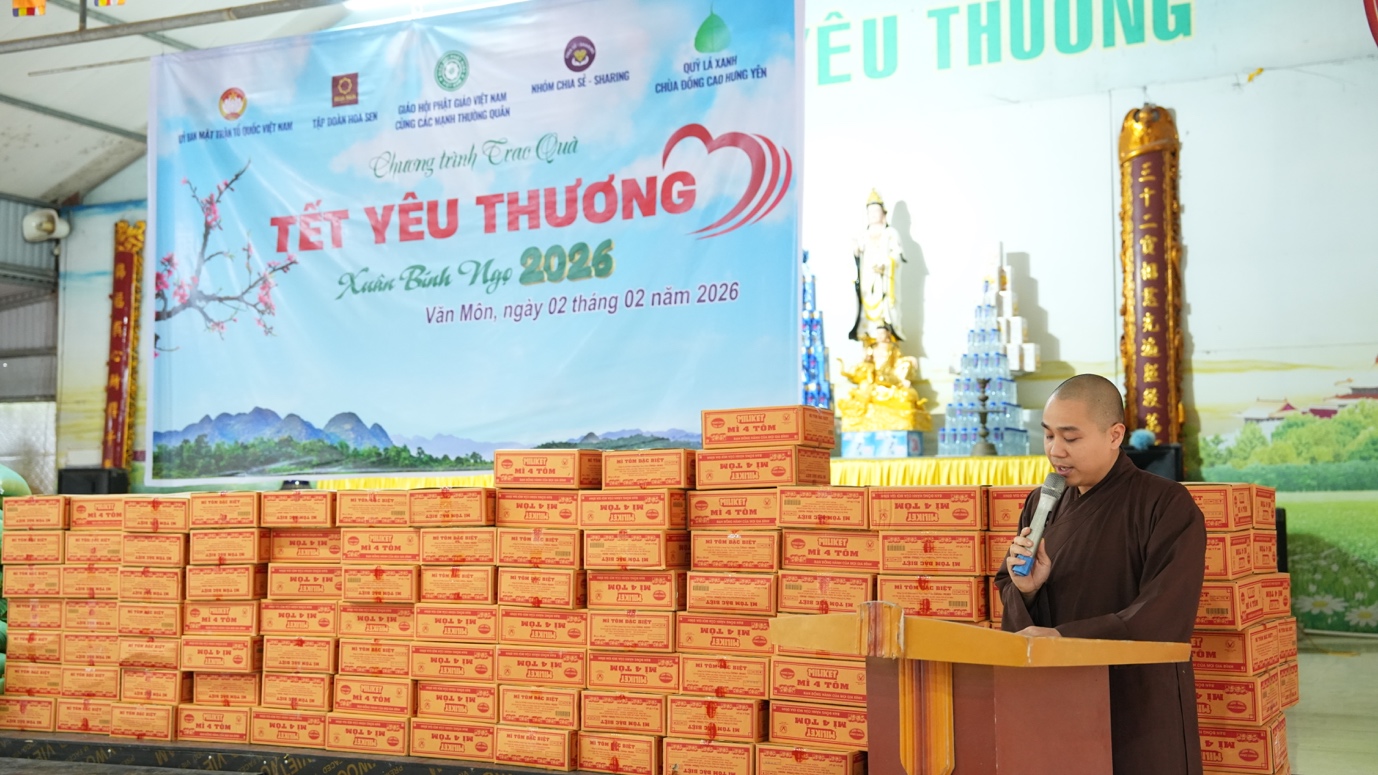 Thừa ủy quyền của Đại lão Hòa thượng Thích Trí Quảng – Đức Pháp chủ GHPGVN; Trưởng lão Hòa thượng Thích Thiện Nhơn – Phó Pháp chủ HĐCM, Chủ tịch HĐTS GHPGVN; Thượng tọa Thích Thanh Phong – Phó Chủ tịch HĐTS, Trưởng ban Kinh tế – Tài chính TW GHPGVN, Trưởng ban Từ thiện – Xã hội GHPGVN TP.HCM, trưởng đoàn công tác đã chuyển lời thăm hỏi ân cần, lời chúc xuân Bính Ngọ an lạc đến toàn thể bà con đồng bào. Hòa thượng chia sẻ, Hưng Yên không chỉ là một điểm dừng chân trong hành trình thiện nguyện, mà còn là quê hương gắn bó với nhiều ký ức thân thương của Thượng tọa từ những năm tháng ấu thơ. Chính những kỷ niệm sâu đậm ấy đã trở thành nguồn động lực để Thượng tọa luôn dành cho mảnh đất này sự quan tâm đặc biệt, trở về bằng tất cả tình cảm chân thành và tâm nguyện phụng sự. Đến nay đã gần 20 năm Thượng tọa cùng đoàn bền bỉ tổ chức chương trình Tết yêu thương; mang mùa Xuân, sự ấm áp cùng những món quà nghĩa tình đến với người dân các tỉnh thành phía Bắc. Thượng tọa hi vọng cuộc sống bà con sẽ ngày một cải thiện hơn, chung sức chung lòng xây dựng đời sống ấm no, hạnh phúc, góp phần vào sự phồn vinh của đất nước.