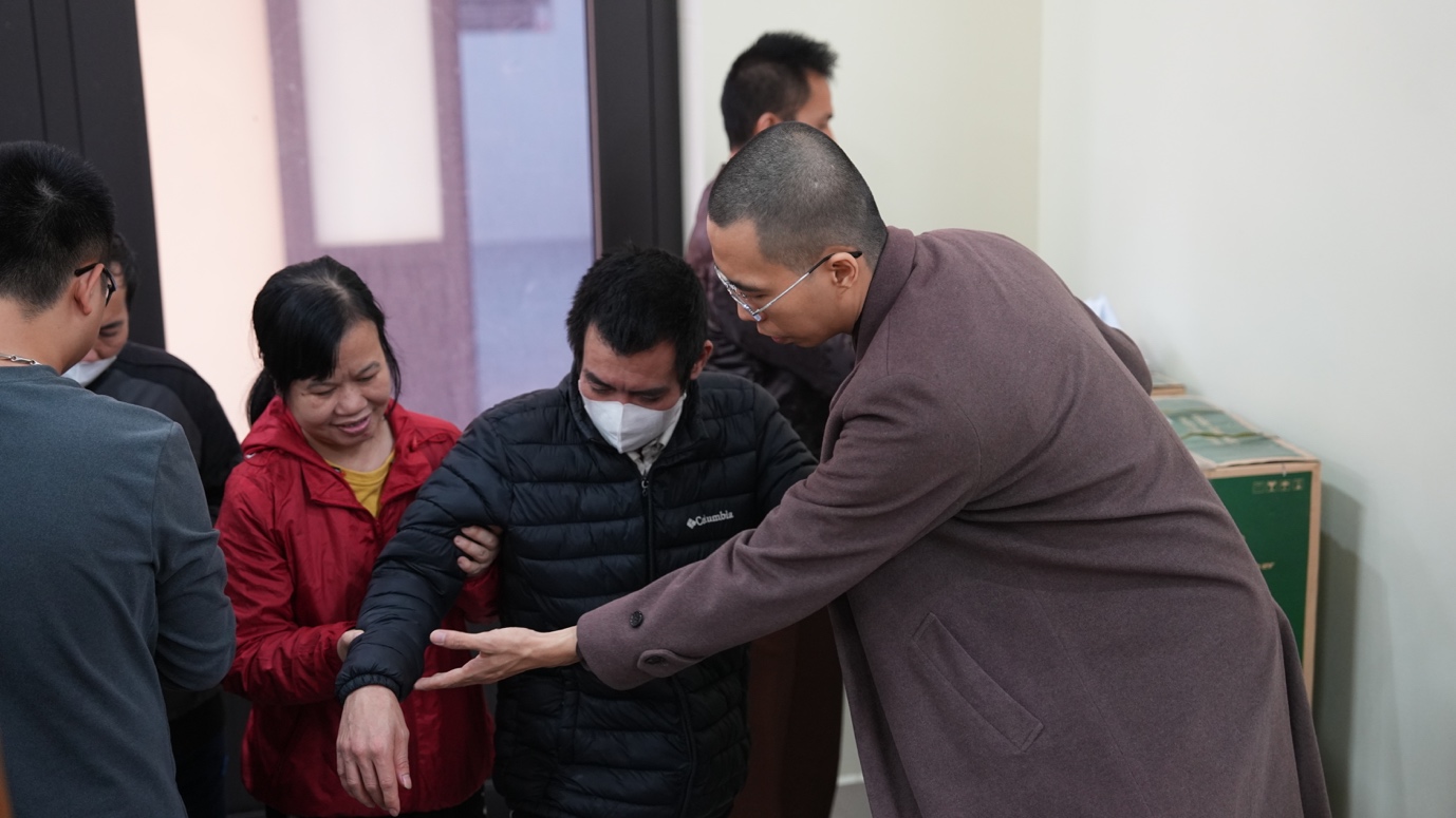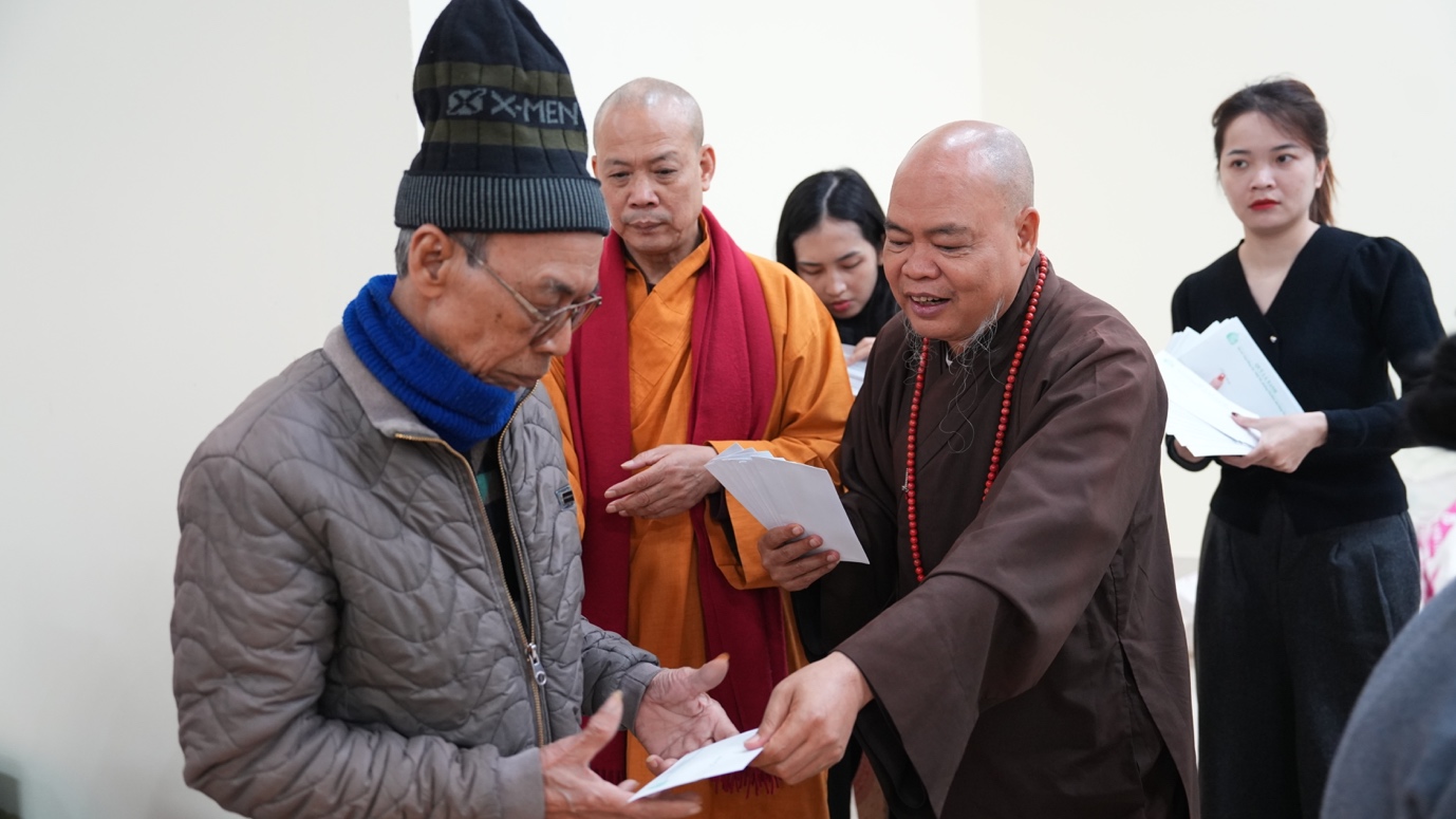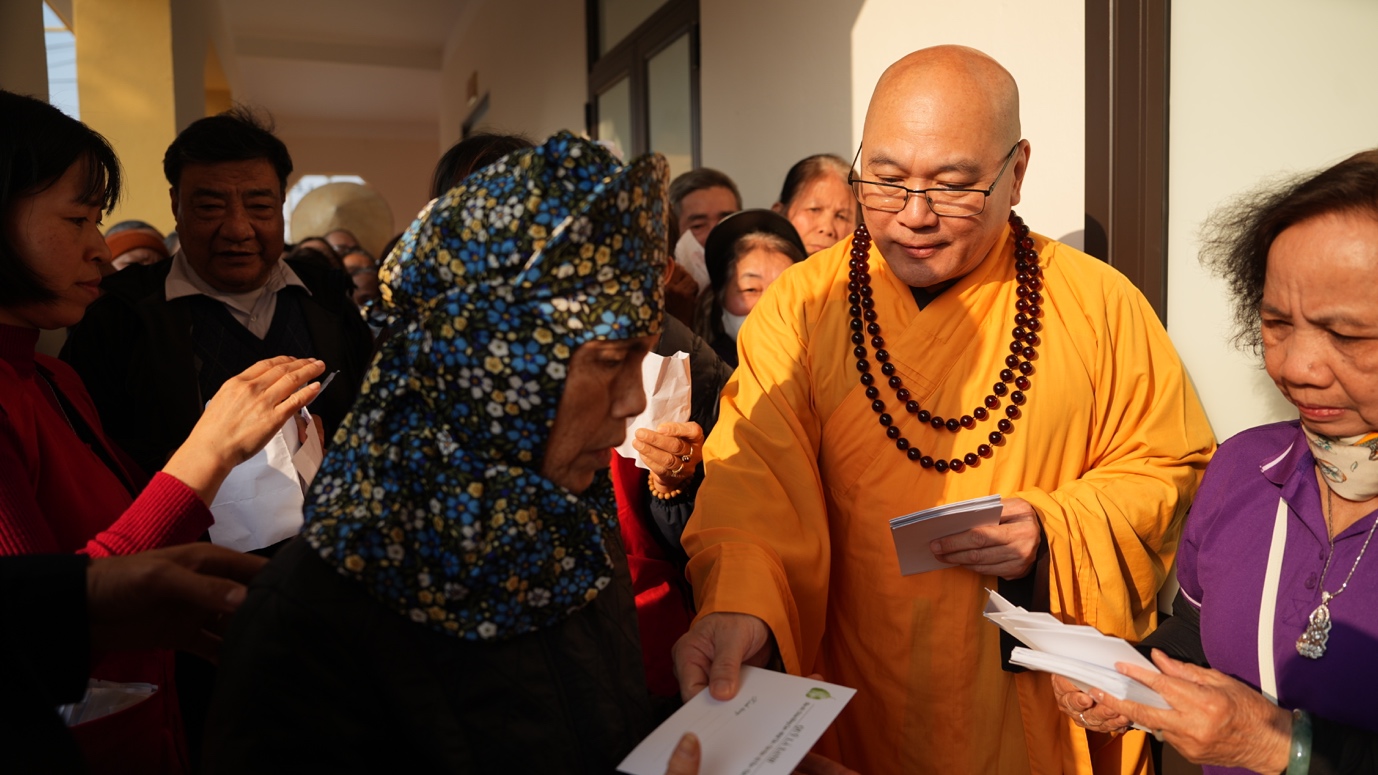 Thấu hiểu và sẻ chia với những nỗi niềm ấy, với tinh thần từ bi cứu khổ, tại điểm trao quà đầu tiên – chùa Văn Môn, xã Thư Vũ (tỉnh Hưng Yên), đoàn đã gửi tặng 200 phần quà hỗ trợ người dân gặp hoàn cảnh khó khăn, những bệnh nhân đang điều trị tại Bệnh viện Da liễu Văn Môn. Được biết, chùa Văn Môn được xây dựng từ năm 1997 tại làng cộng đồng Văn Môn (xã Vũ Vân, huyện Vũ Thư, tỉnh Thái Bình cũ) – nơi chữa trị bệnh phong cho bà con nhân dân. Nhờ có Phật giáo, có quý Thầy, các bệnh nhân đã phần nào được xoa dịu các nỗi đau về thể xác và tinh thần, hiểu thấu về nhân quả. Hiện nay Bệnh viện không còn bệnh nhân lưu trú, nhưng họ vẫn thường xuyên về chùa như một mái nhà tâm linh để nương tựa.