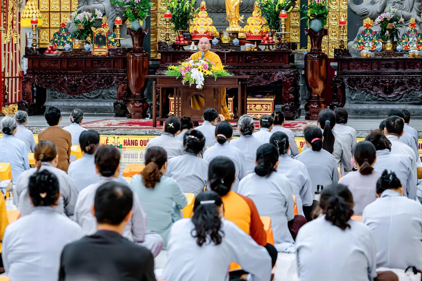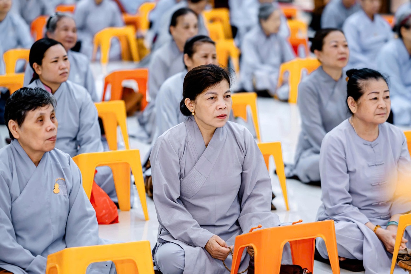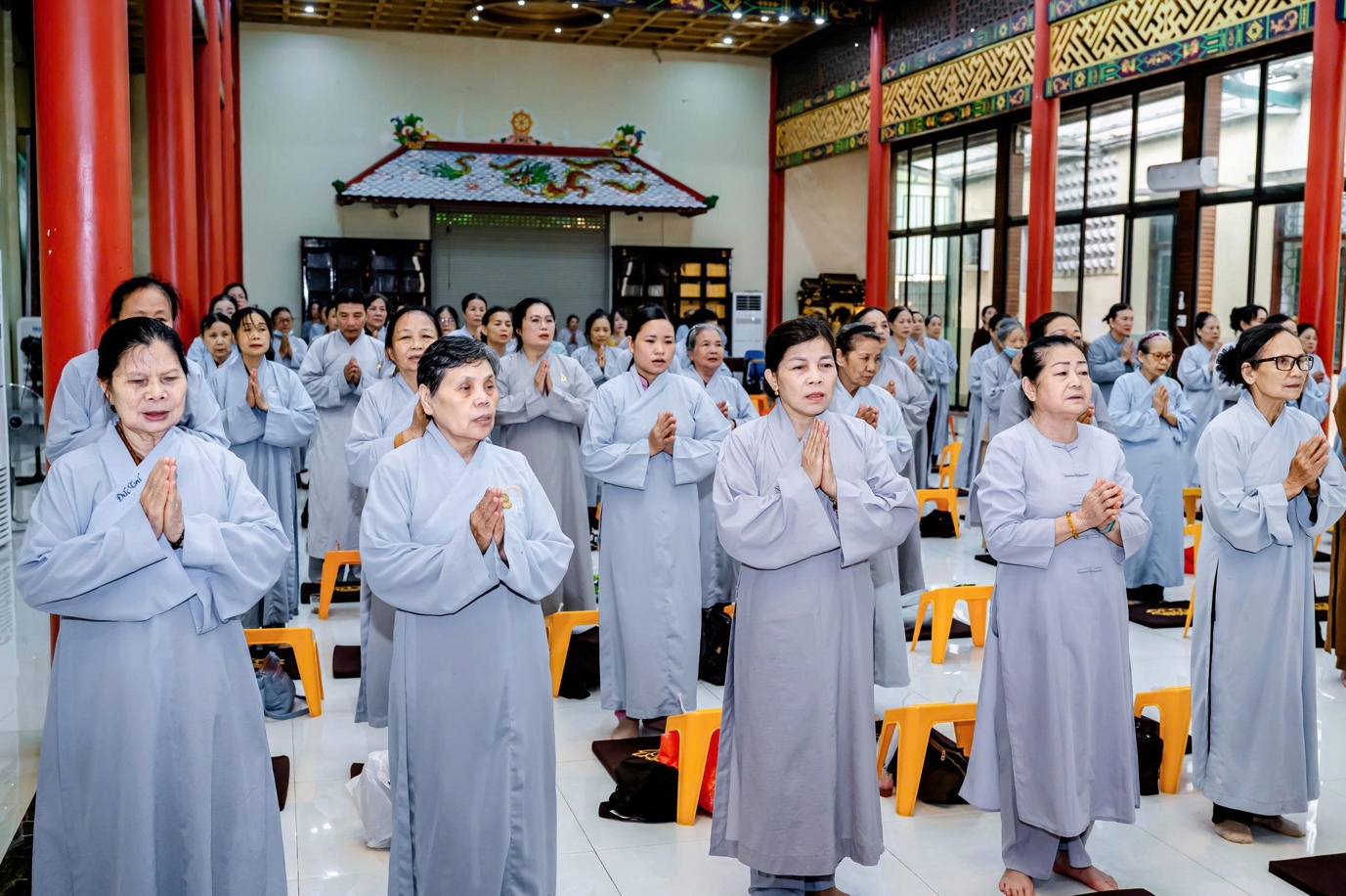 Ngay từ sáng sớm, đạo tràng đã rộn ràng trong không khí thanh tịnh. Hàng trăm Phật tử đồng trang nghiêm bước vào khóa lễ Sám hối sáu căn, thành tâm quán chiếu thân – khẩu – ý, hướng đến việc chuyển hóa nội tâm. Tiếng chuông, tiếng mõ hòa quyện cùng lời kinh đã tạo nên một không gian linh thiêng, giúp hành giả tạm gác lại những lo toan thường nhật, trở về với sự tĩnh lặng nơi chính mình.