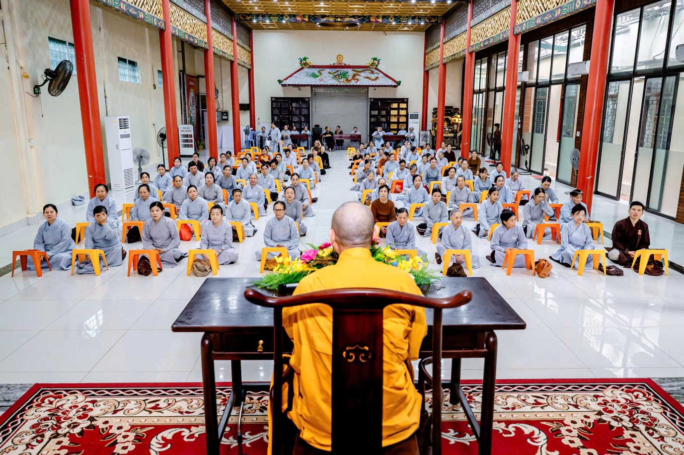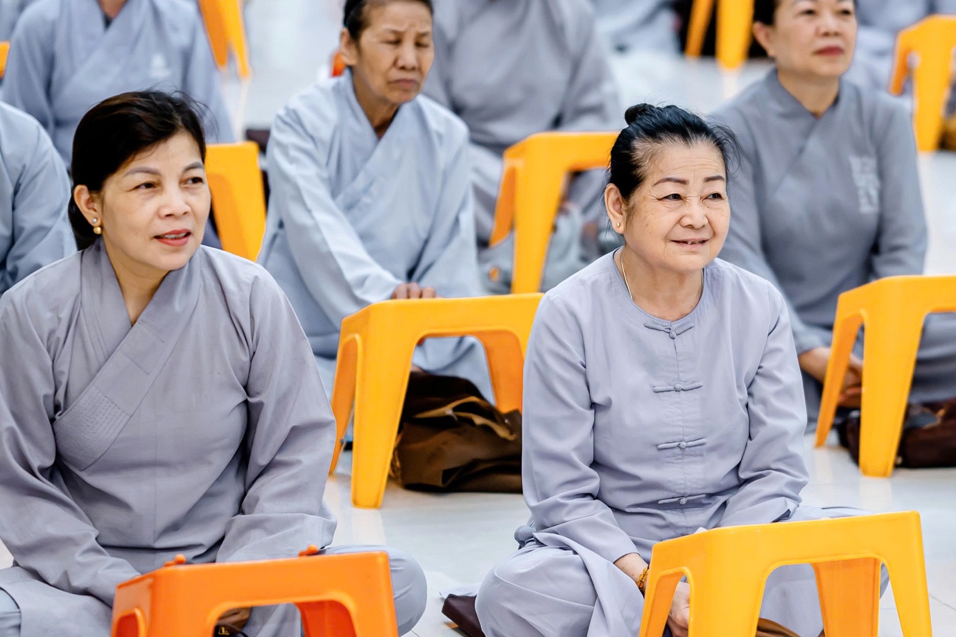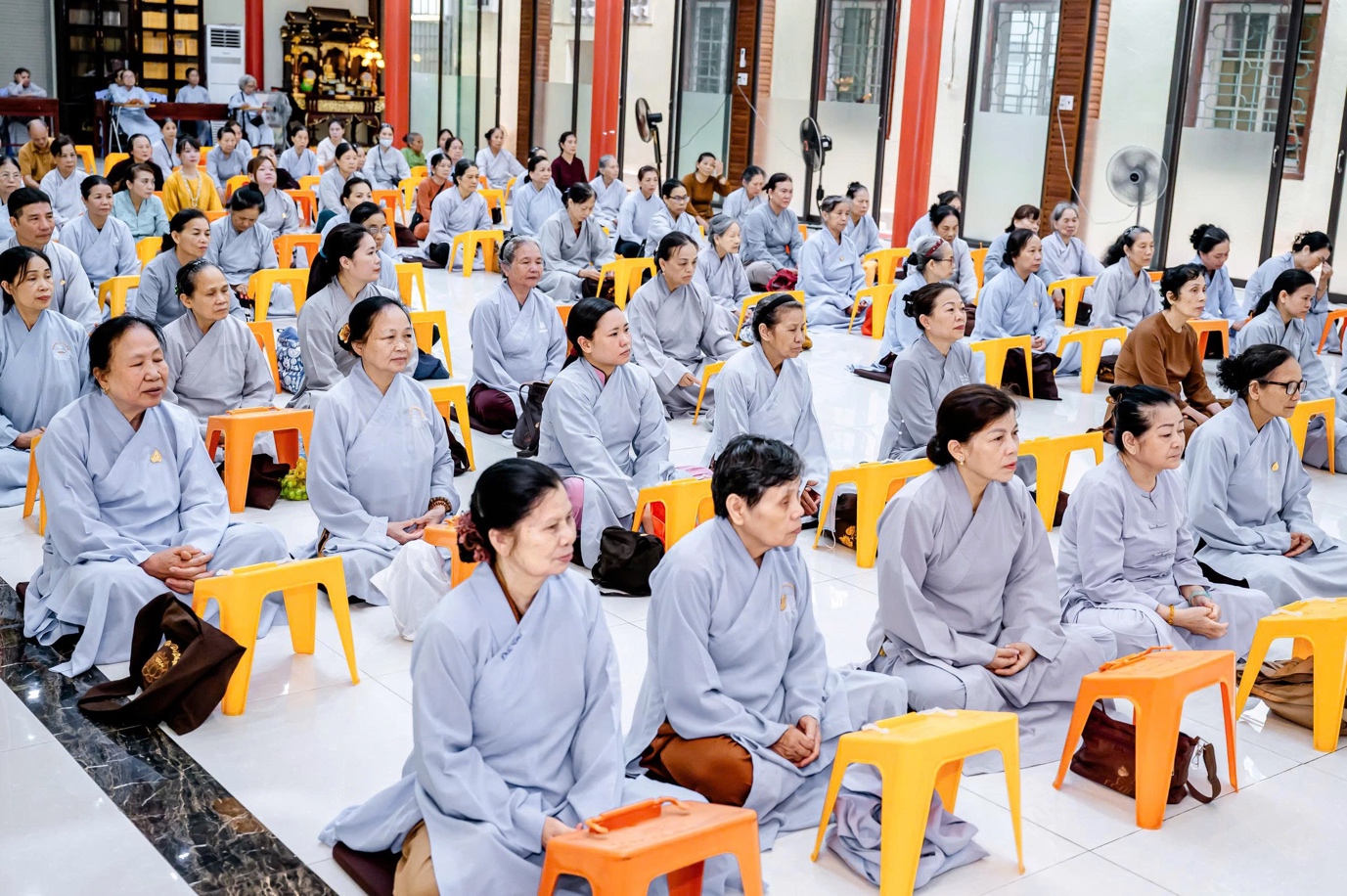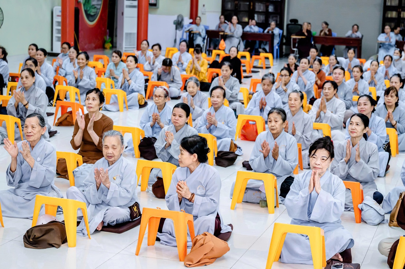 Ngay từ sáng sớm, đạo tràng đã rộn ràng trong không khí thanh tịnh. Hàng trăm Phật tử đồng trang nghiêm bước vào khóa lễ Sám hối sáu căn, thành tâm quán chiếu thân – khẩu – ý, hướng đến việc chuyển hóa nội tâm. Tiếng chuông, tiếng mõ hòa quyện cùng lời kinh đã tạo nên một không gian linh thiêng, giúp hành giả tạm gác lại những lo toan thường nhật, trở về với sự tĩnh lặng nơi chính mình.