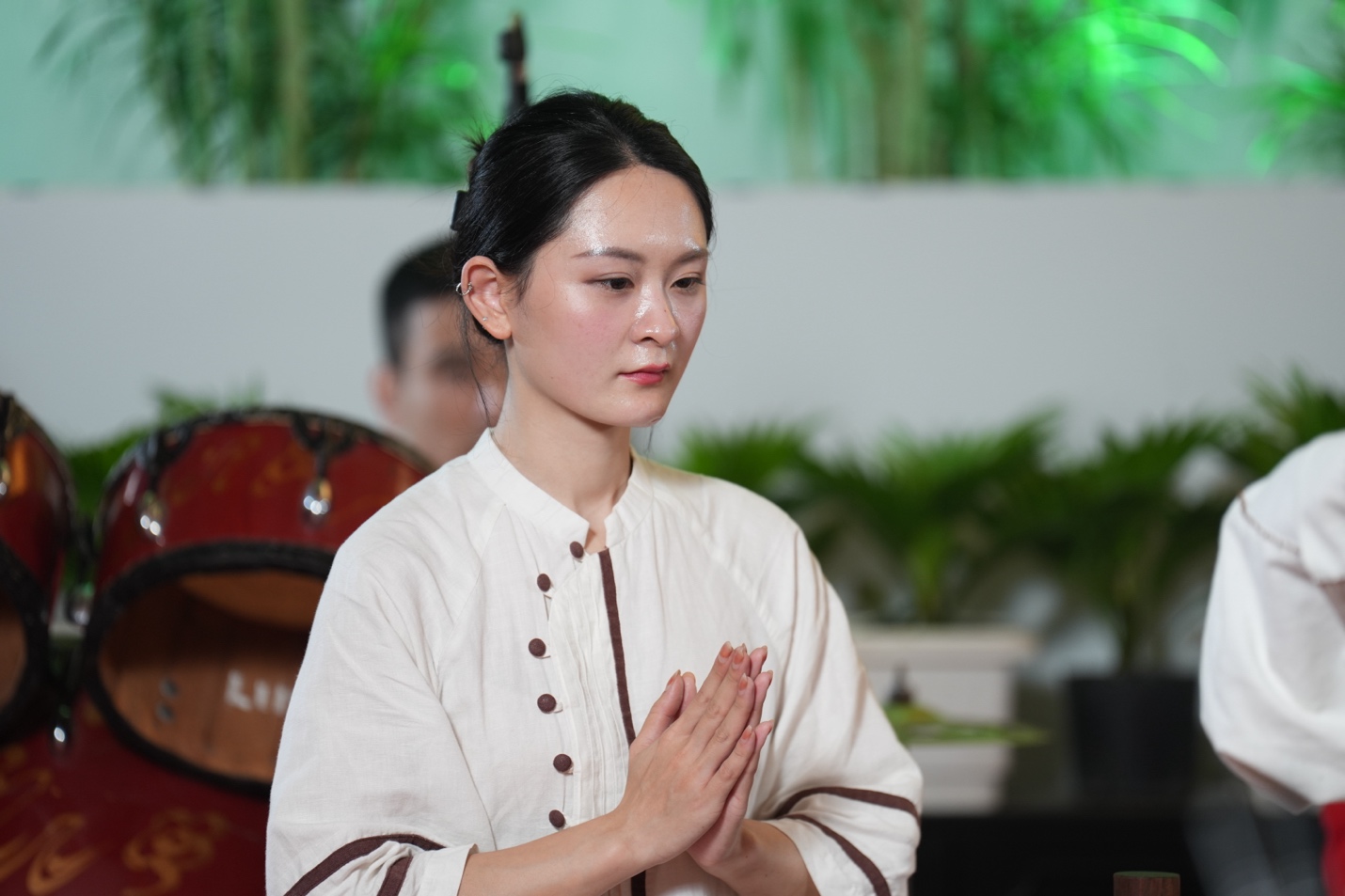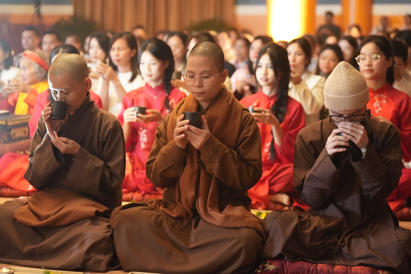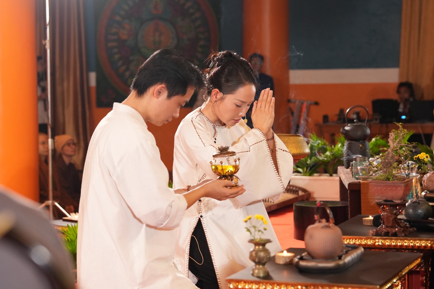 Trong giờ phút tĩnh lặng của không gian thiền trà nghi thức thiêng liêng dâng những chén trà đầu tiên lên Ban Tam Bảo đã được thực hiện bởi trà sư Sương Mai mở màn cho buổi thiền trà đầy lắng đọng.